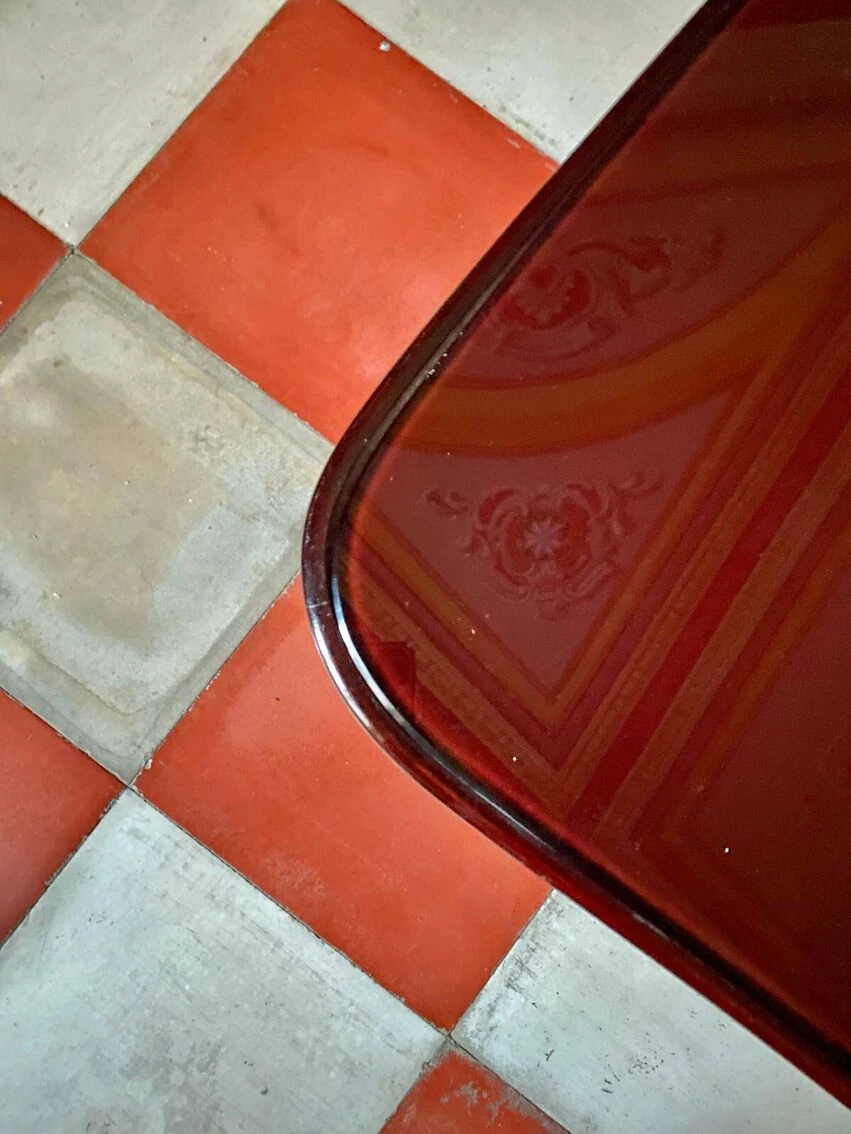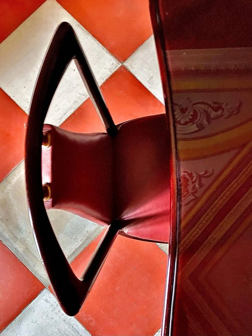 Elegant vintage dining set made of six solid mahogany and red faux leather chairs, a beautifully shaped solid poplar wood veneered in rosewood and a top in black opaline glass nestled in a wood framed base.