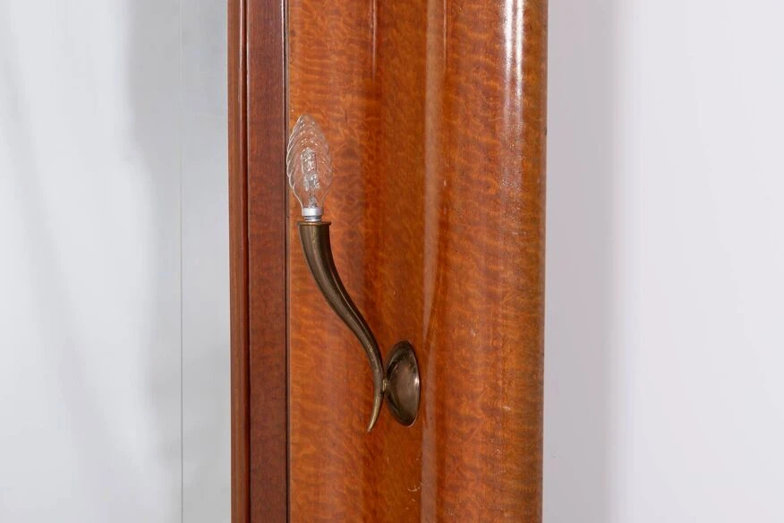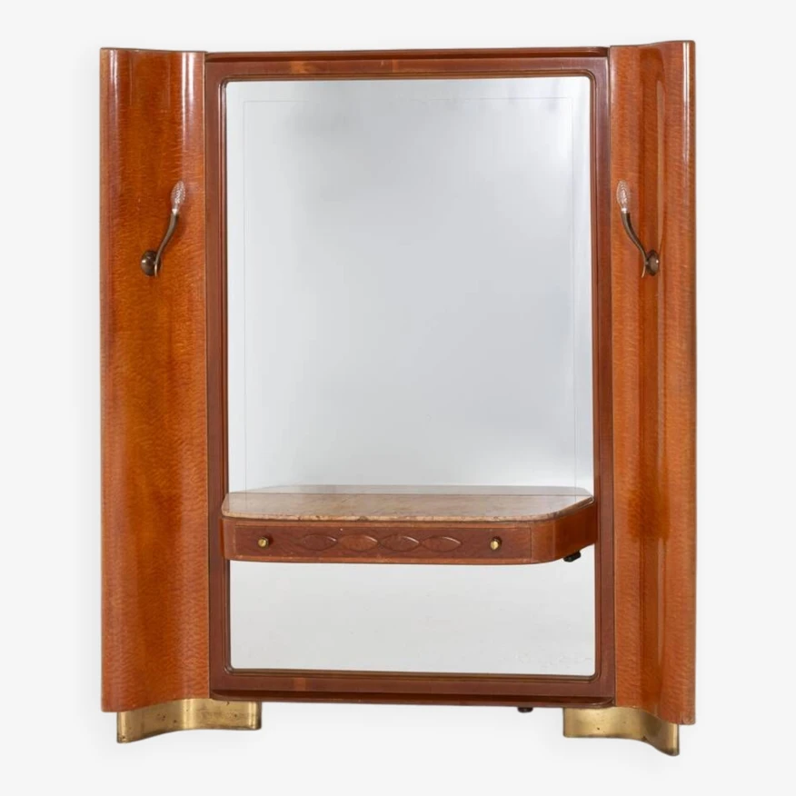It features curved maple veneer frame with a full size mirror, pull out drawer with marble inlay top and two sculptural brass lamps on both sides.