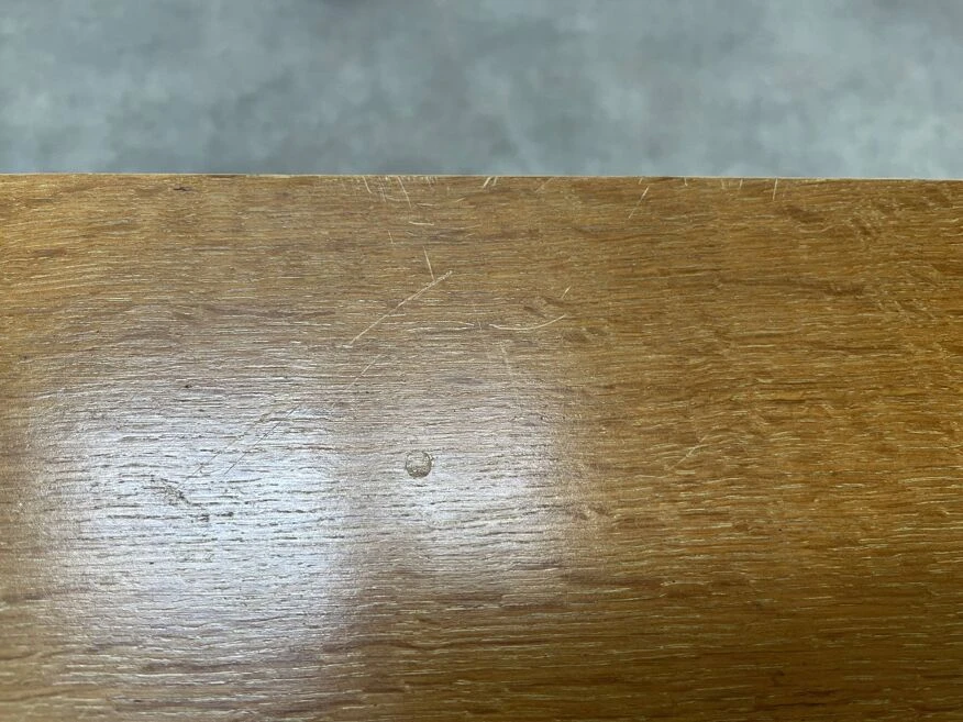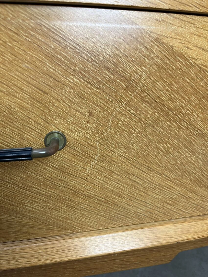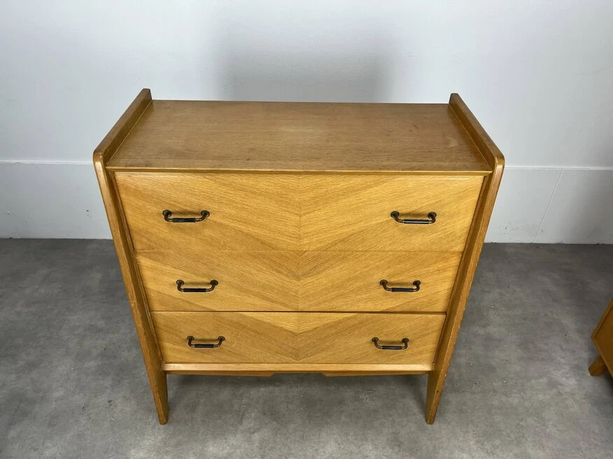 Typical chest of drawers from the 50s, totally in the reconstruction style with asymmetrical lines reminiscent of the work of Marcel Gascoin. Superb piece. Very good condition. Dimensions: height 95 cm, width 90 cm, depth 45 cm.