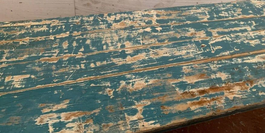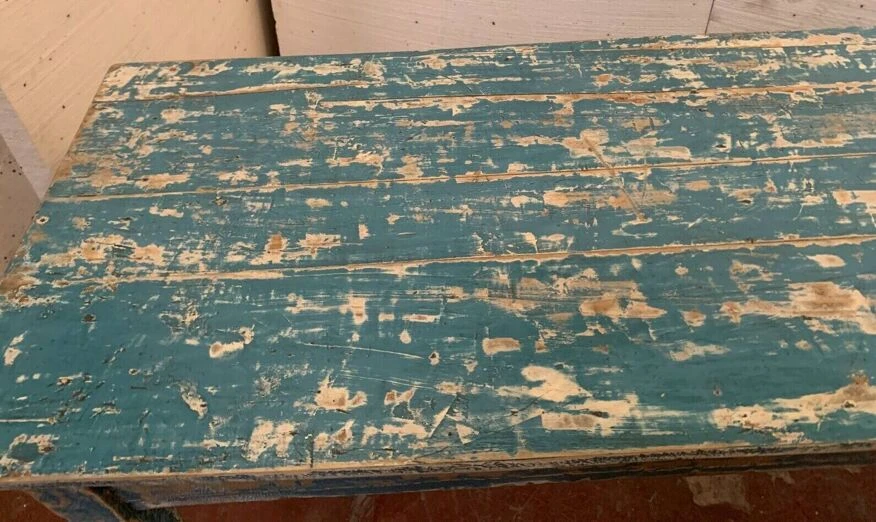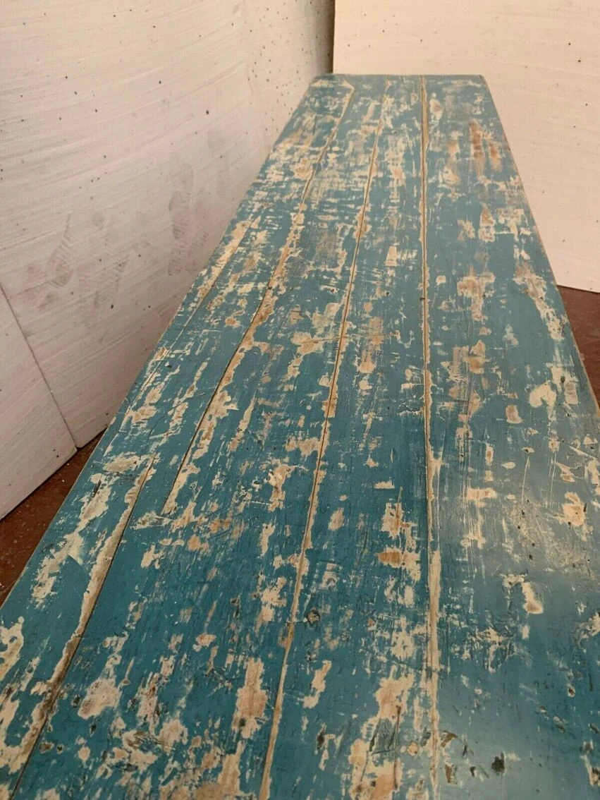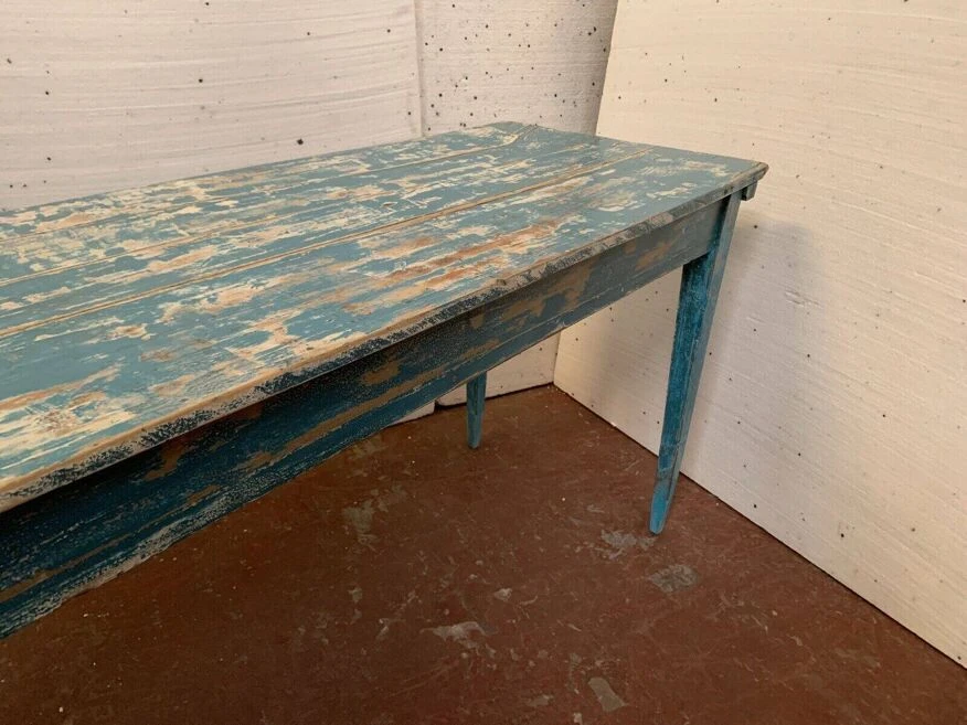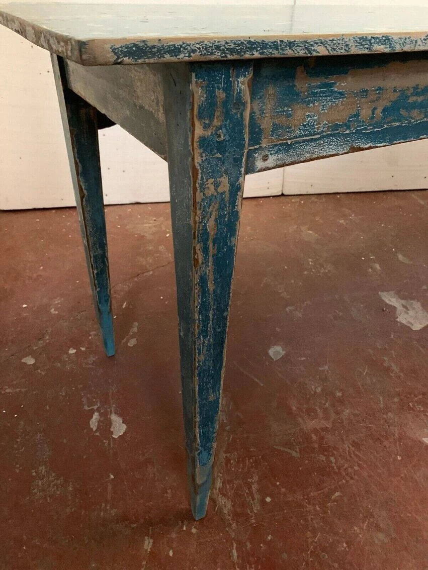 Large farm table with blue patina in solid fir four conical legs restored see photos good condition dimension h 77 X l 229 X 58 cm height under headband 64 cm early 20th century.