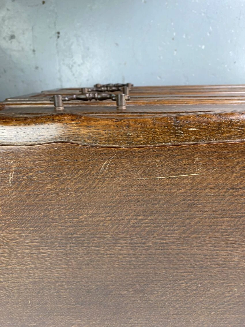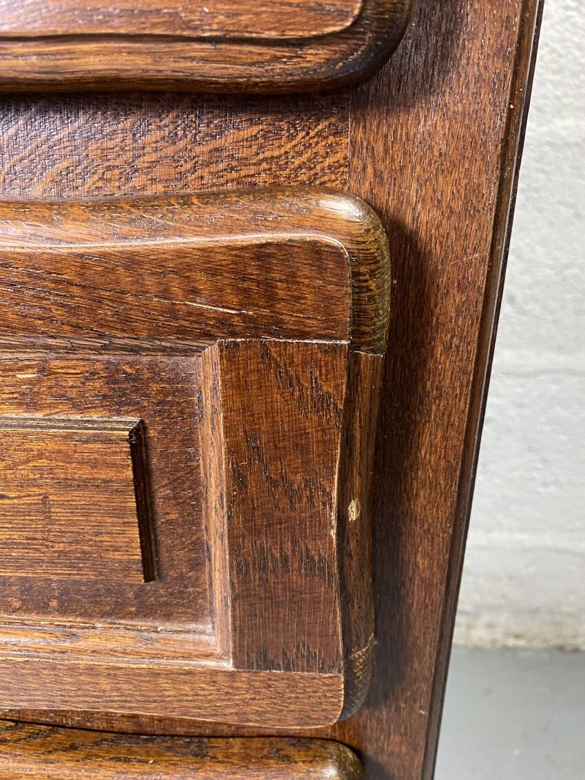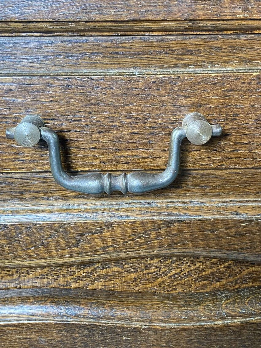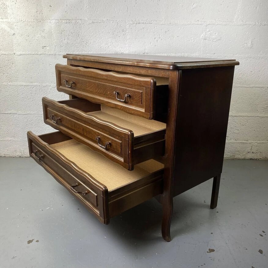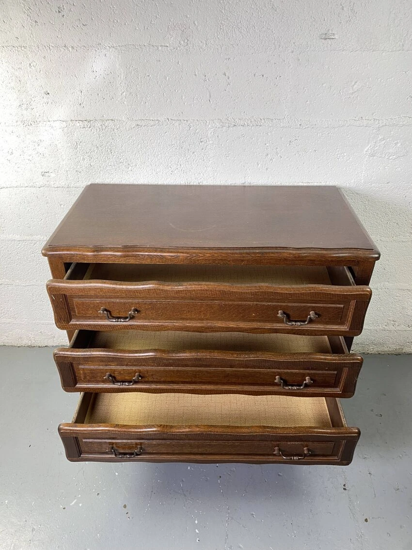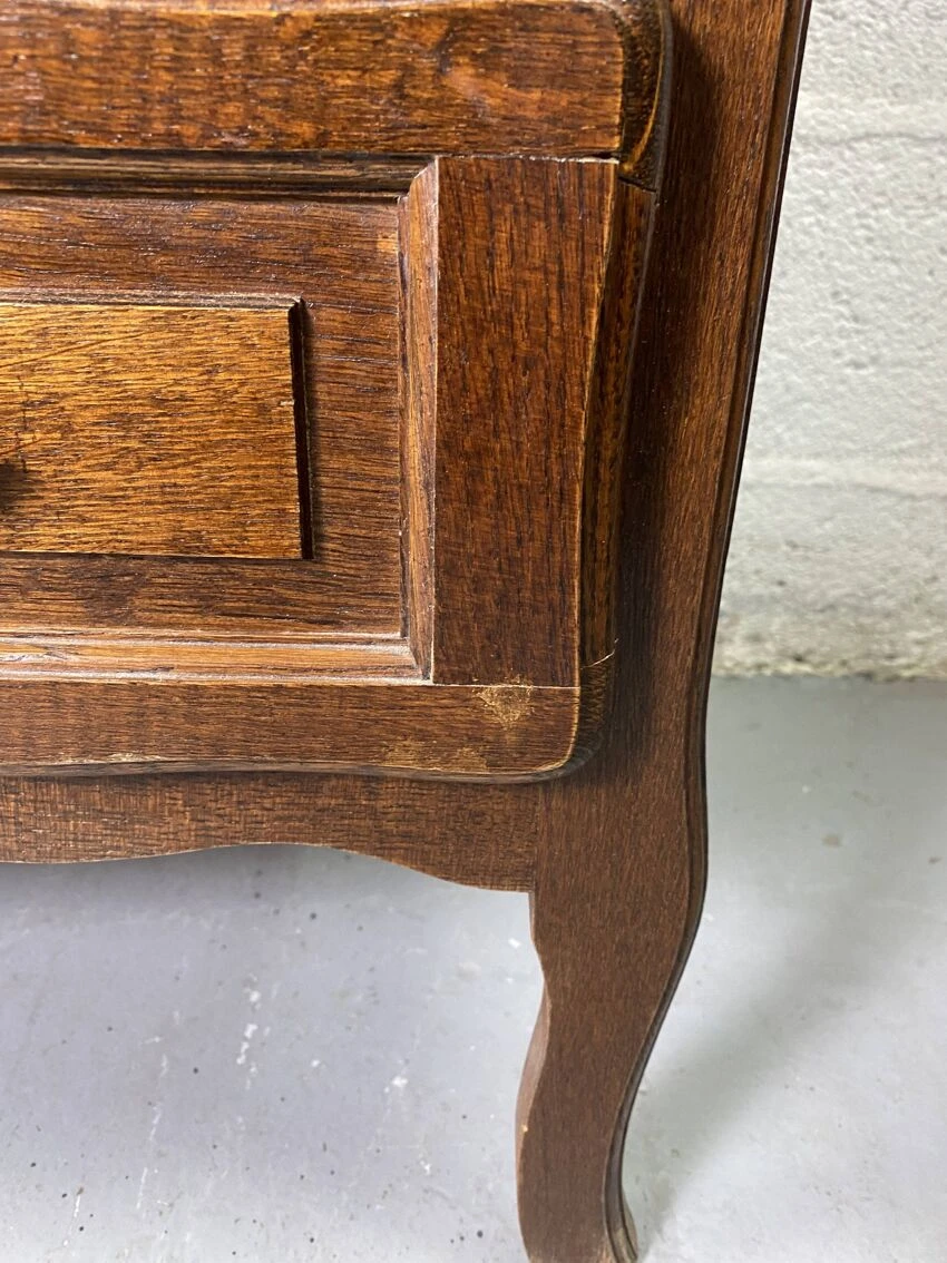 This wooden chest of drawers, probably made of oak, offers both functionality and style in your bedroom or living room.
