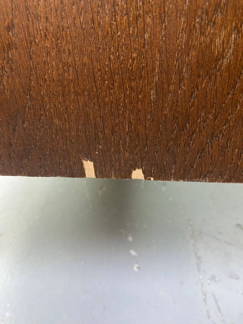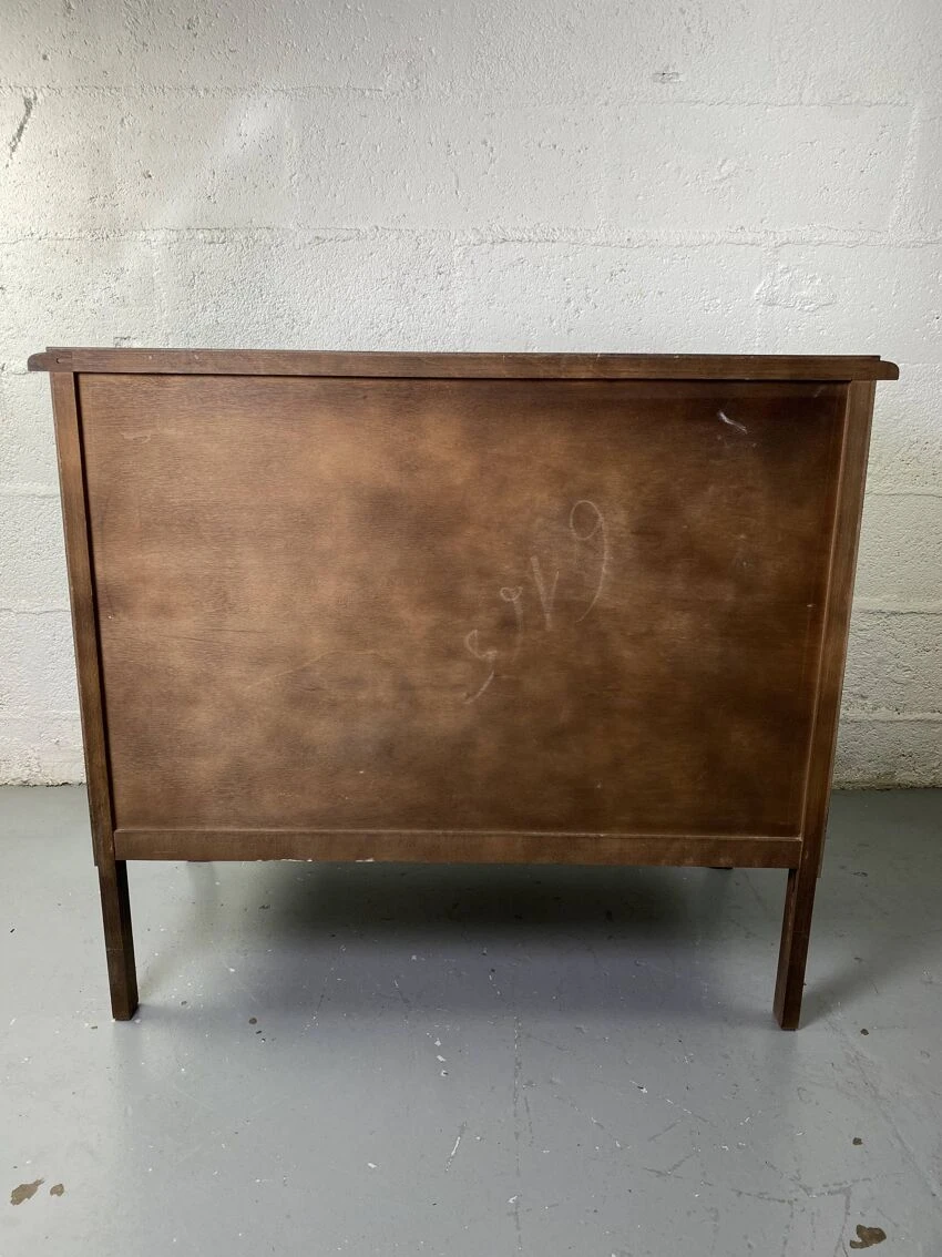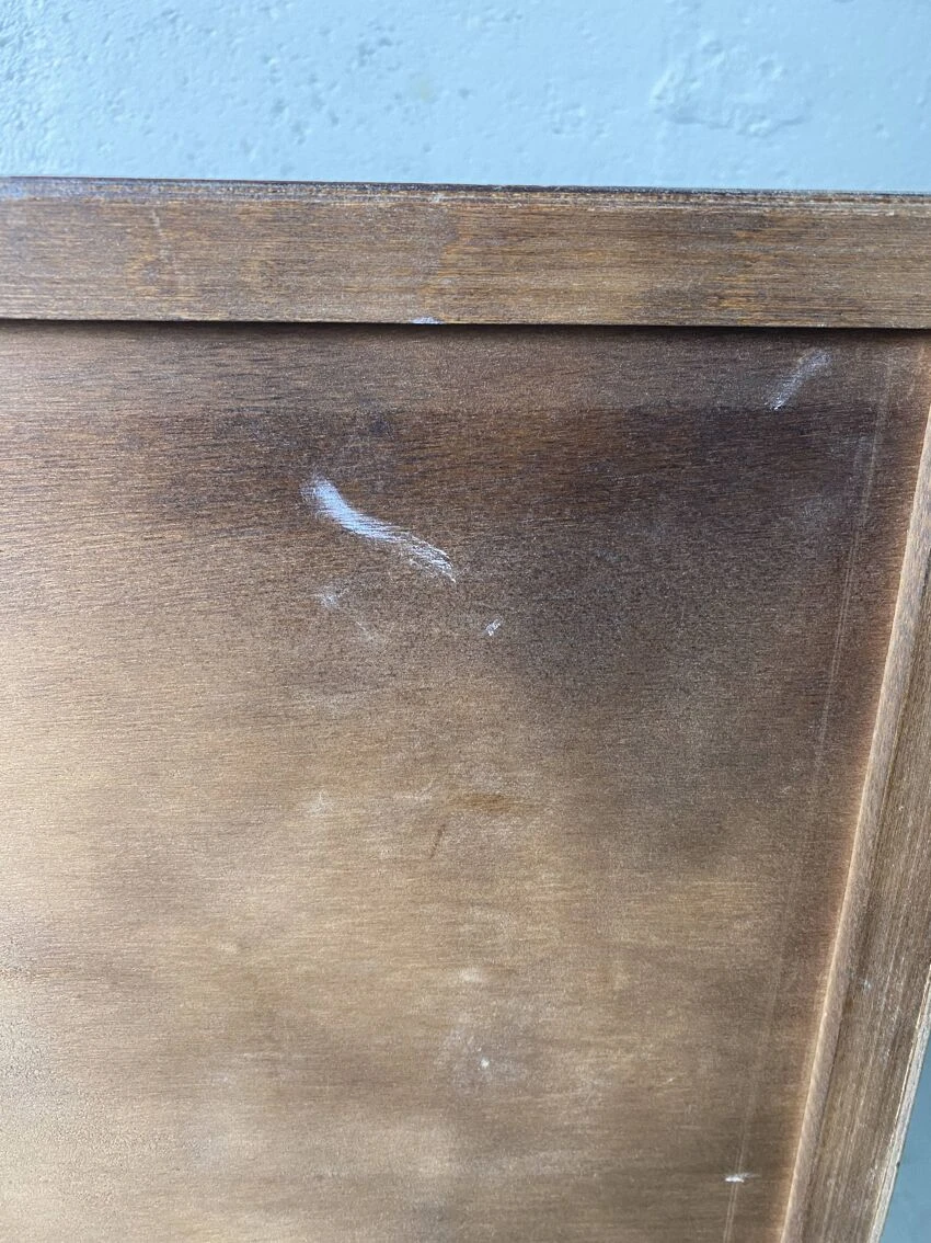 Although solid and stable, the chest of drawers shows some signs of wear, including scuffs and scratches on the wood, as well as visible marks on the top.