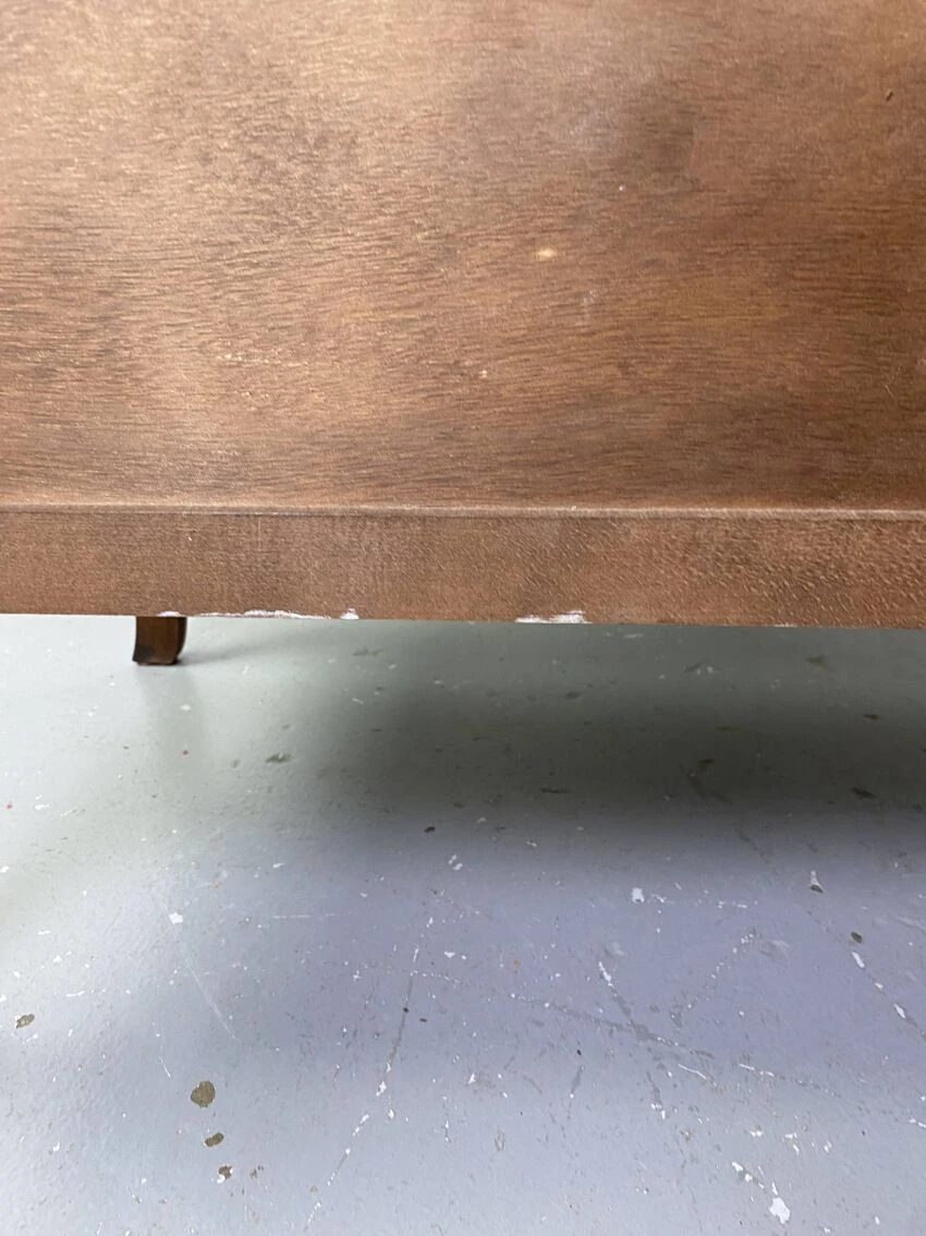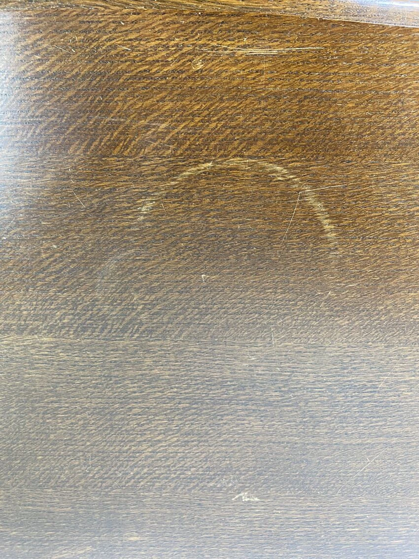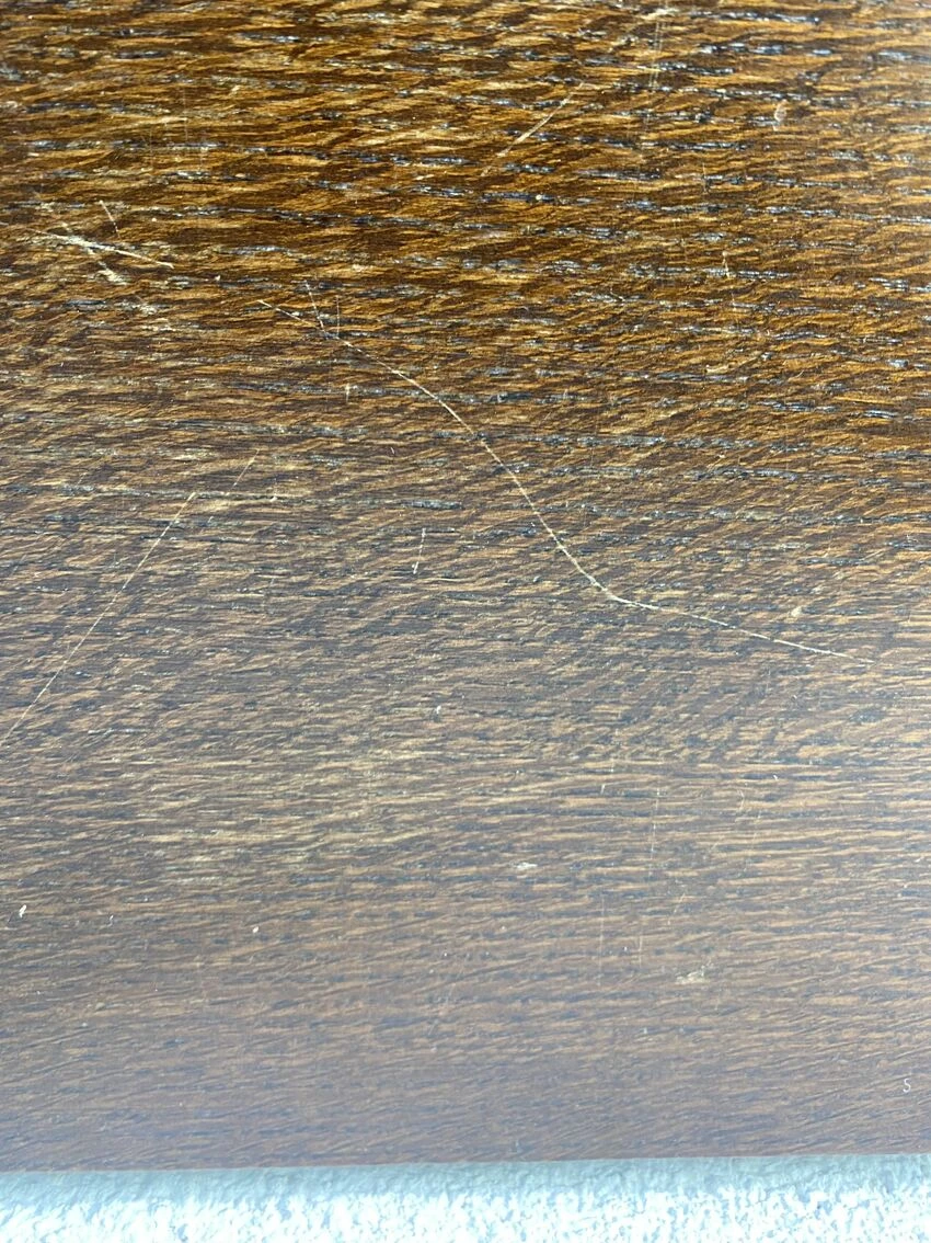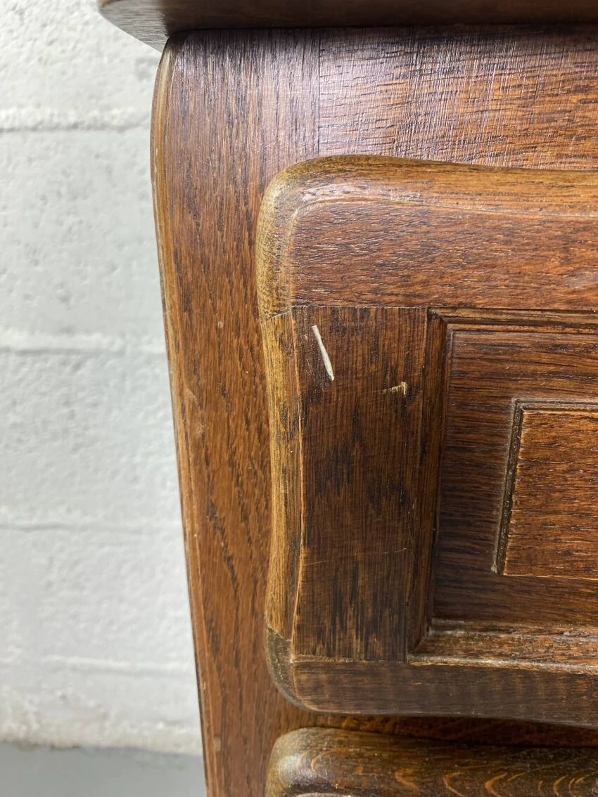 Although solid and stable, the chest of drawers shows some signs of wear, including scuffs and scratches on the wood, as well as visible marks on the top.