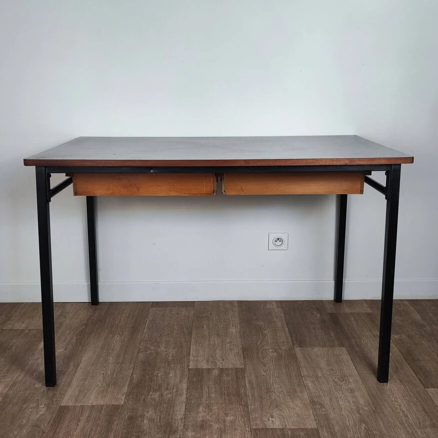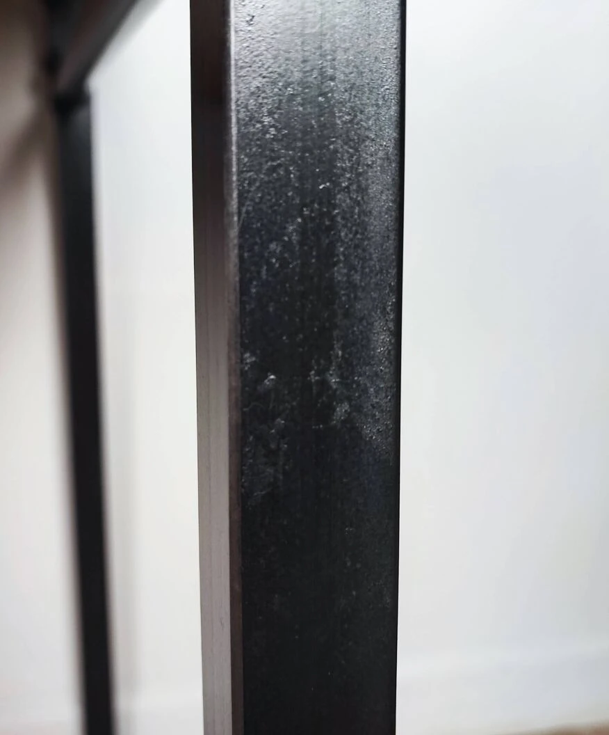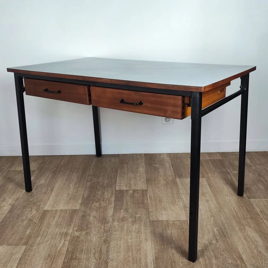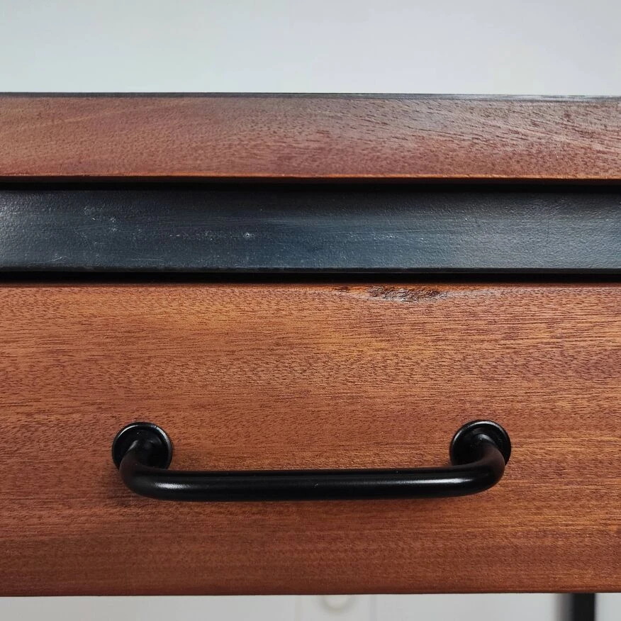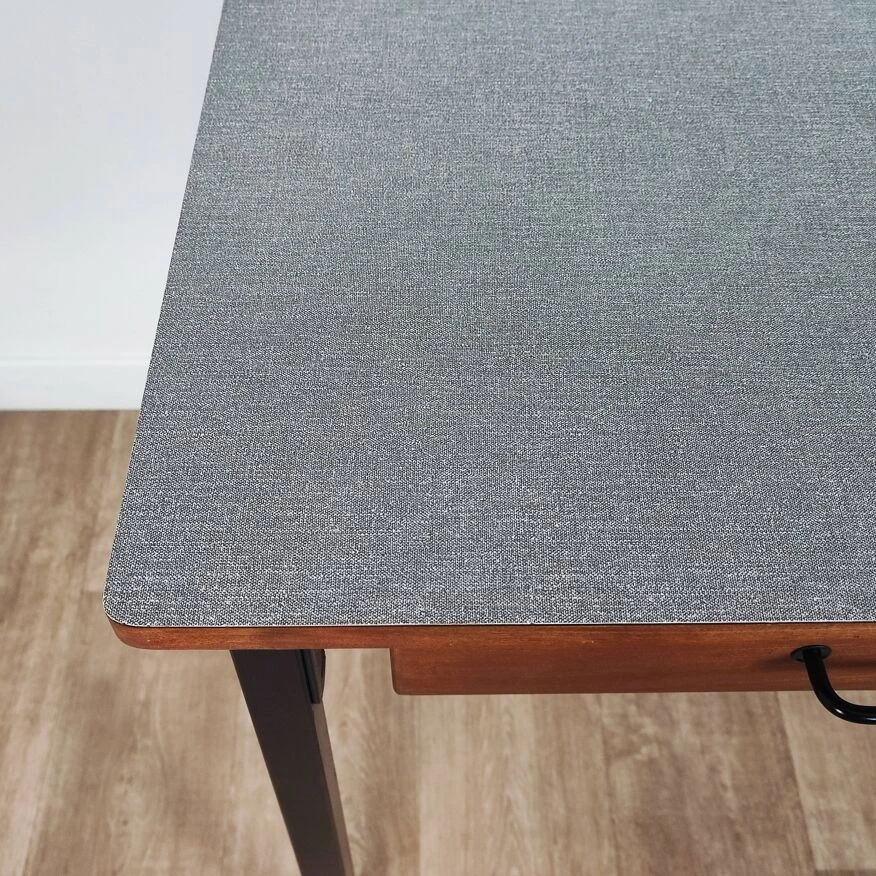 Black metal structure, heather gray melamine top, “teak” surround and drawer.