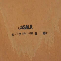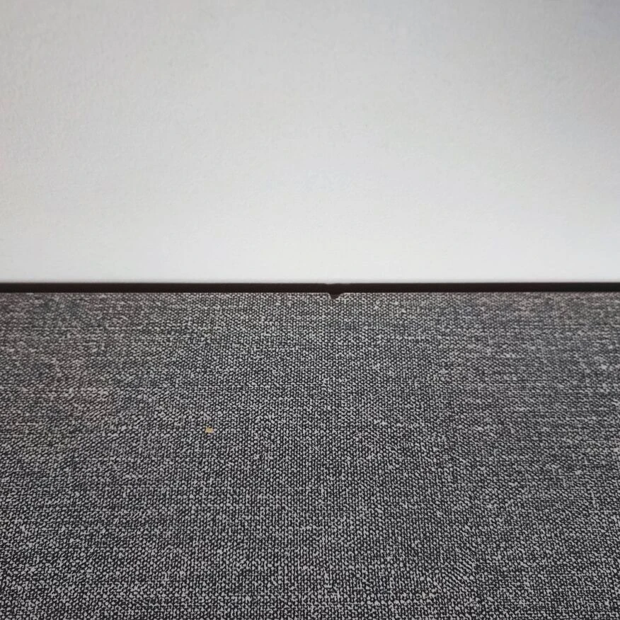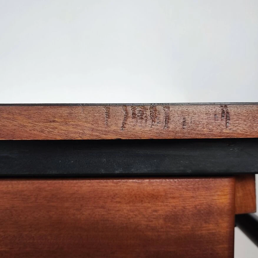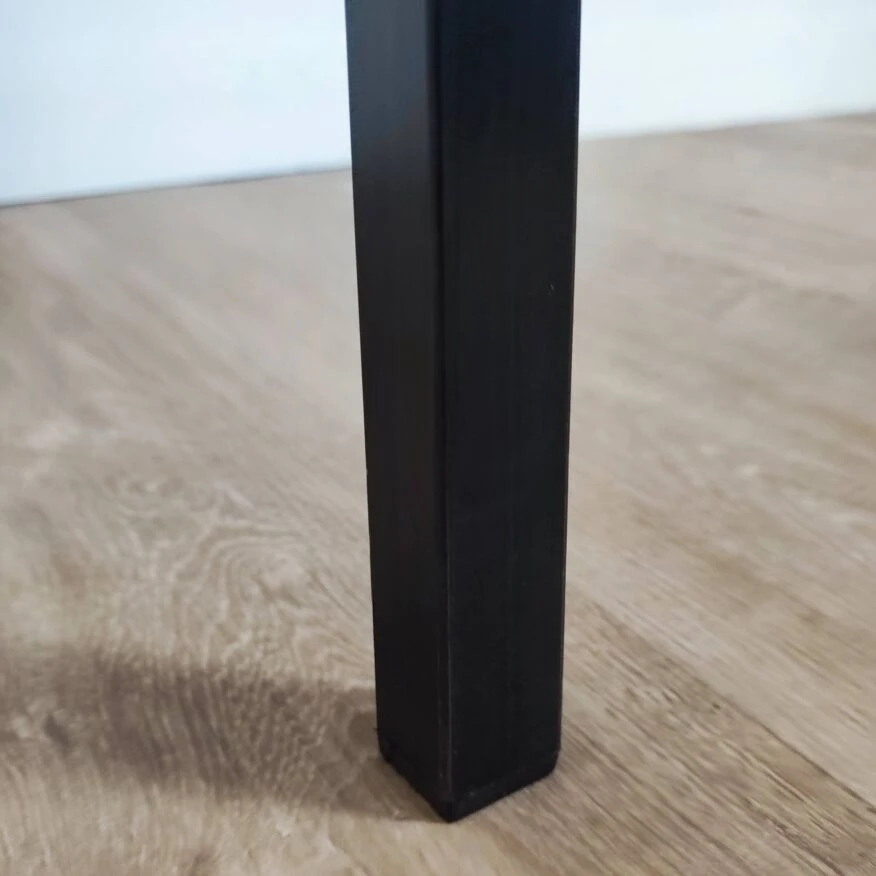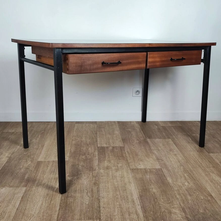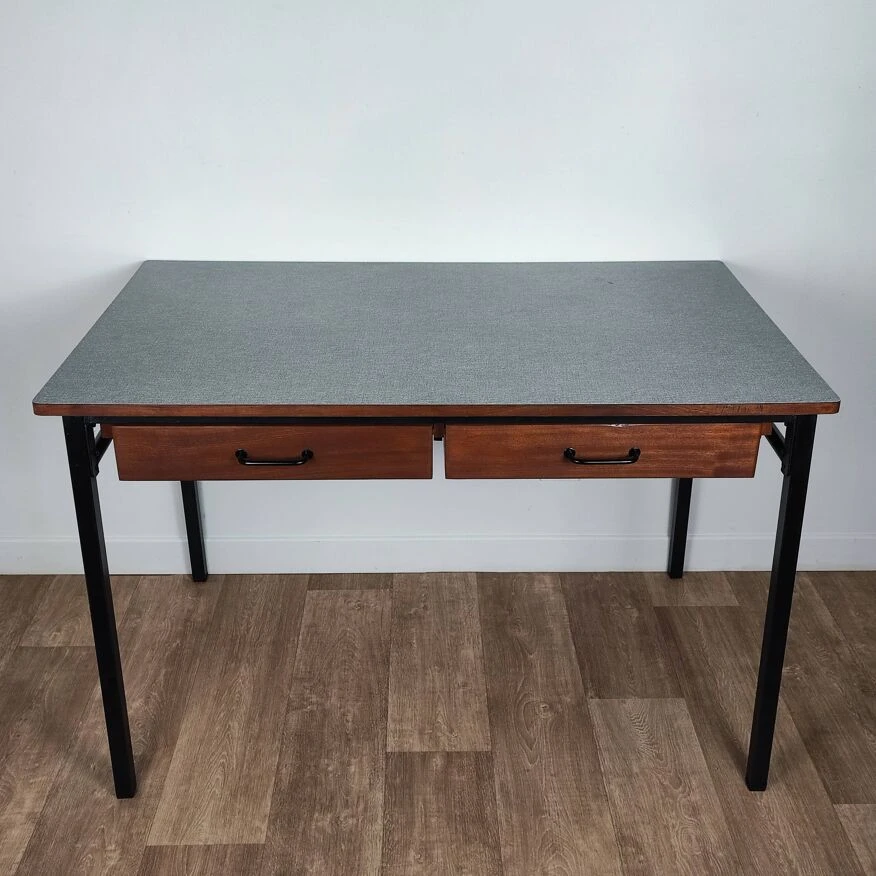 Black metal structure, heather gray melamine top, “teak” surround and drawer.