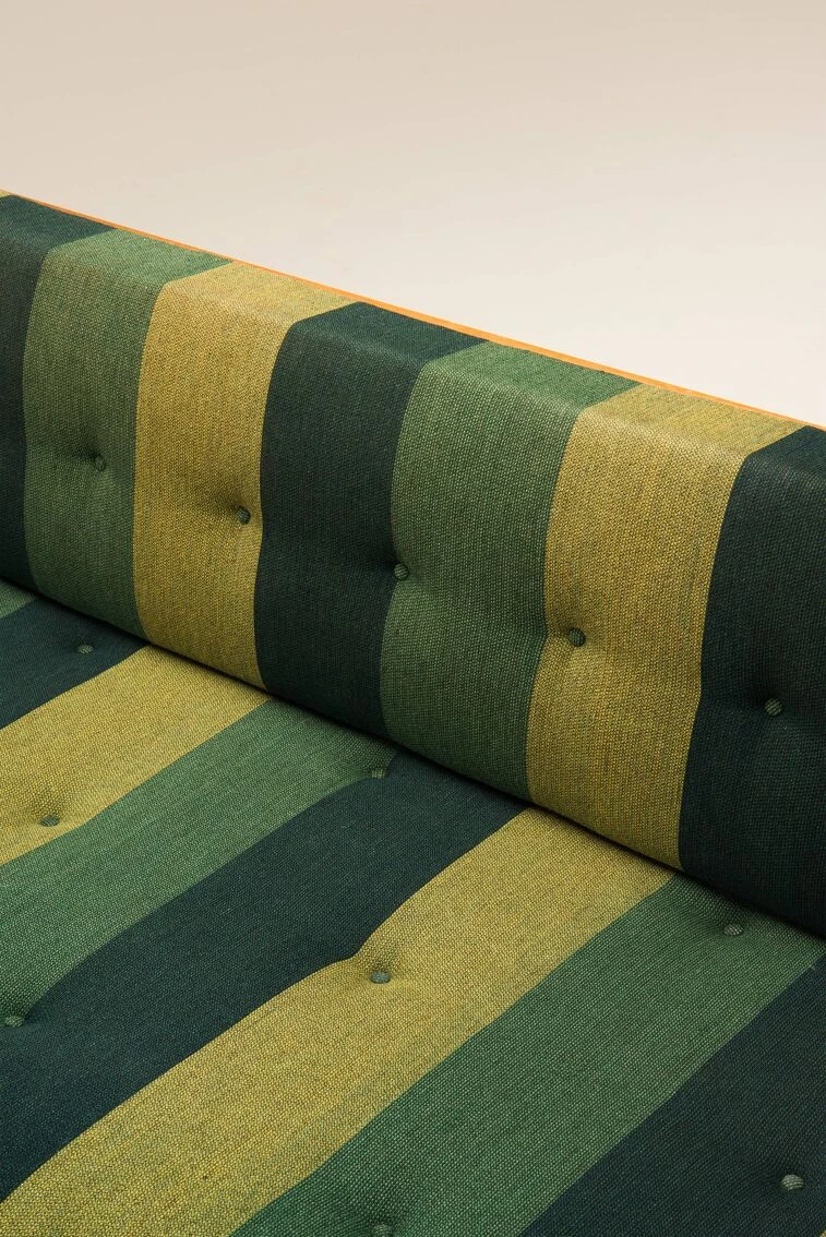 The beautiful woven blue and green stripe fabric is original to the sofa as well.