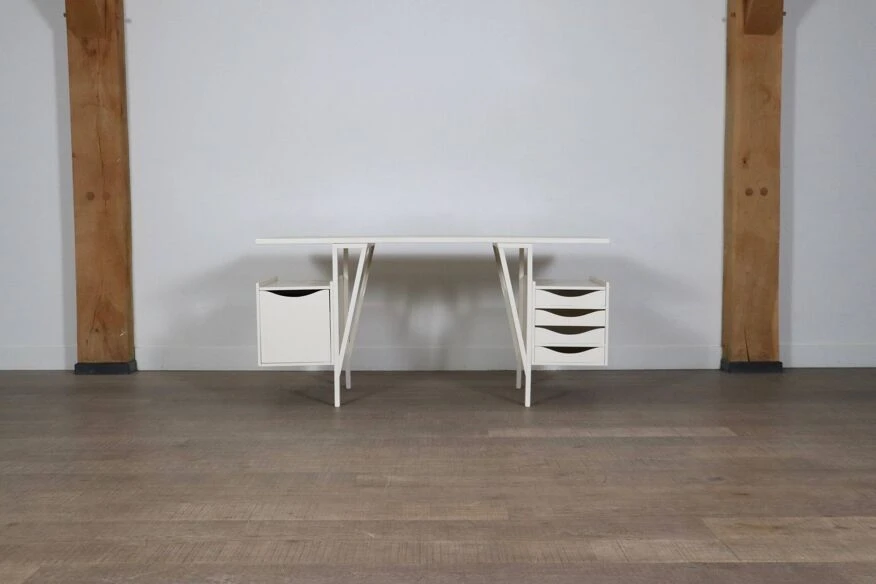 This particular desk has containers on both sides, one equipped with four small drawers, and on the other side one large sliding drawer.