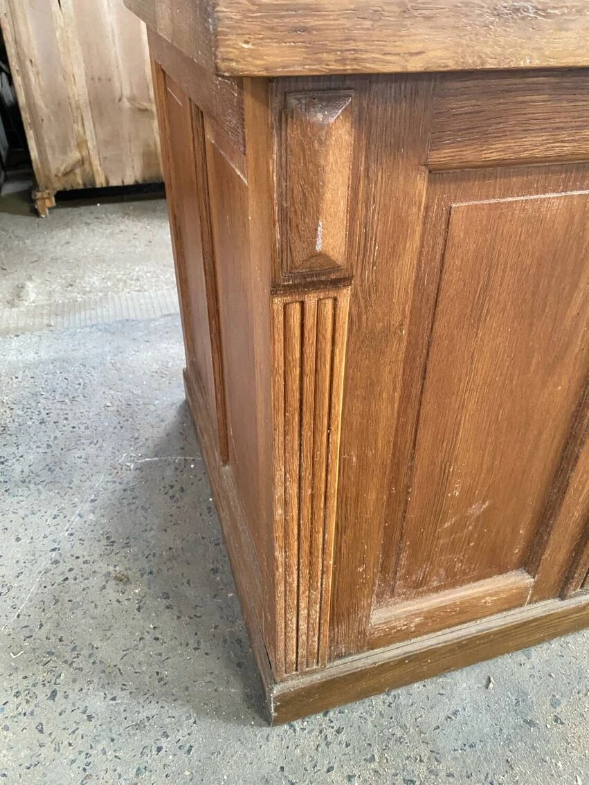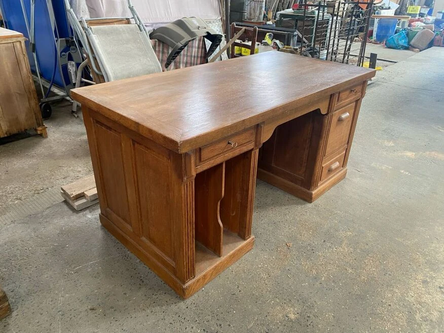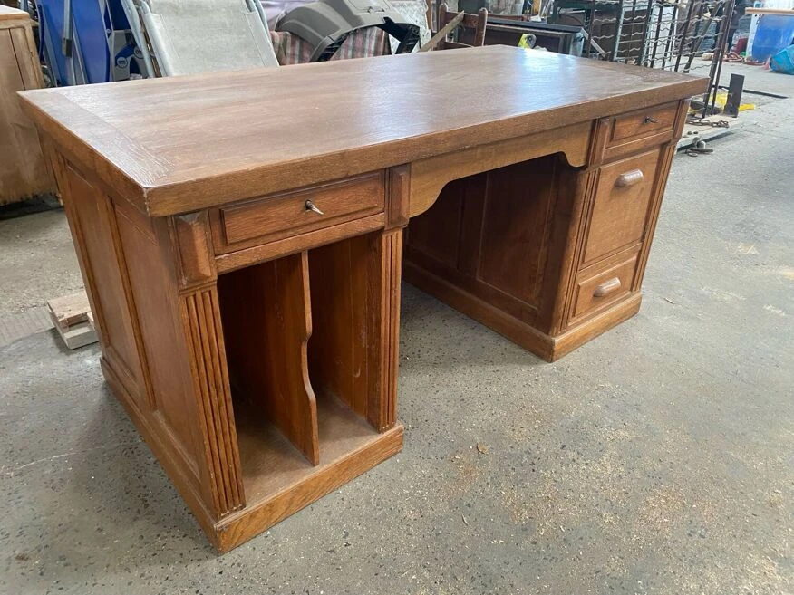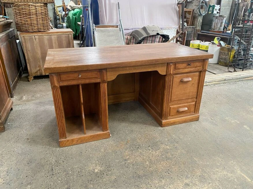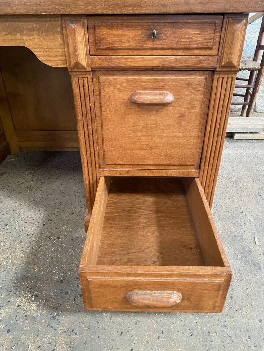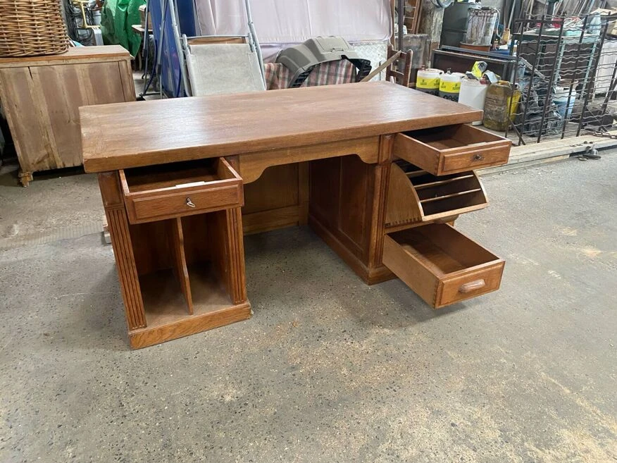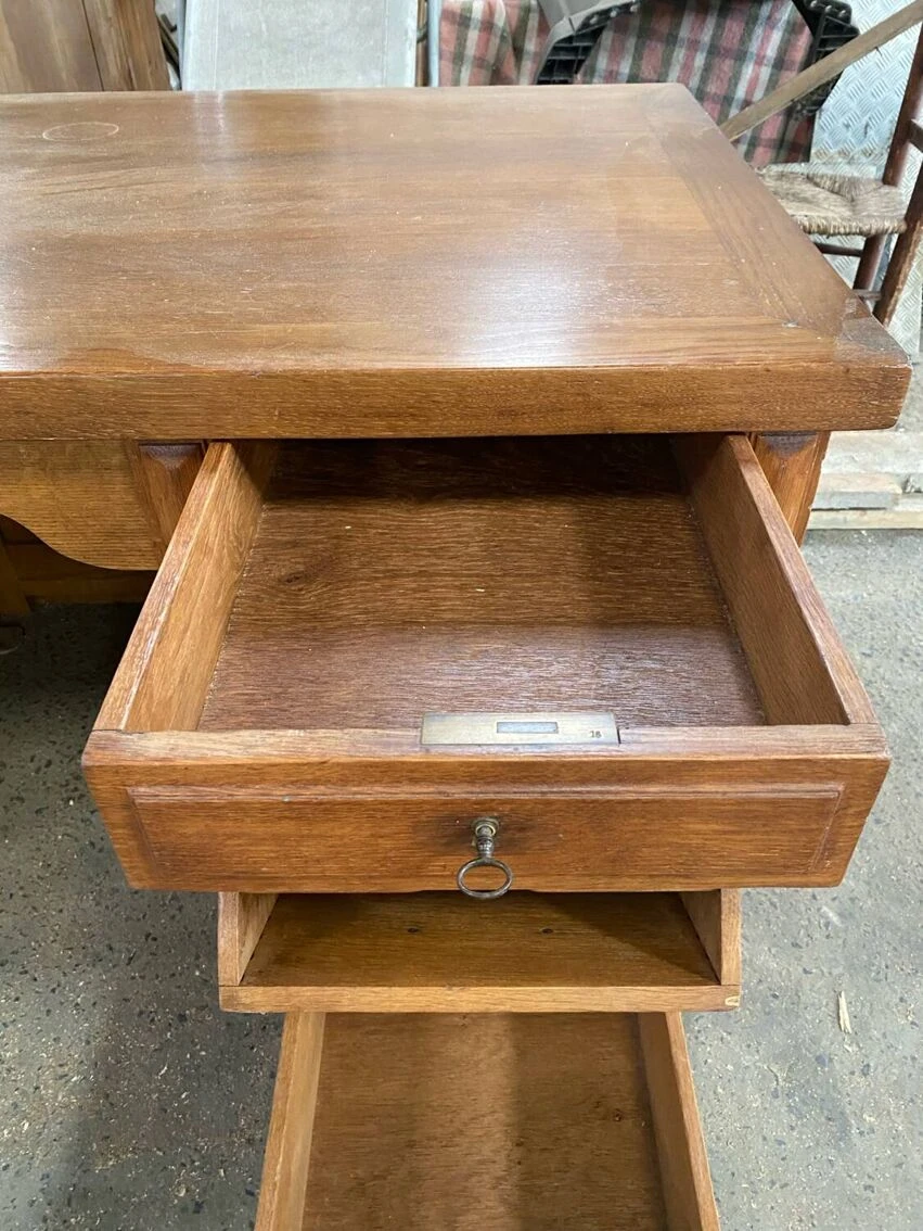 Superb administration office. Full oak. Superb condition. Two lockable drawers. Original key. A tilting compartment for files. Two niches on the side which were used for the account ledgers. A very beautiful piece.