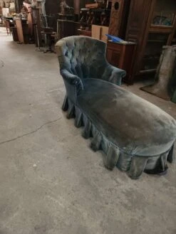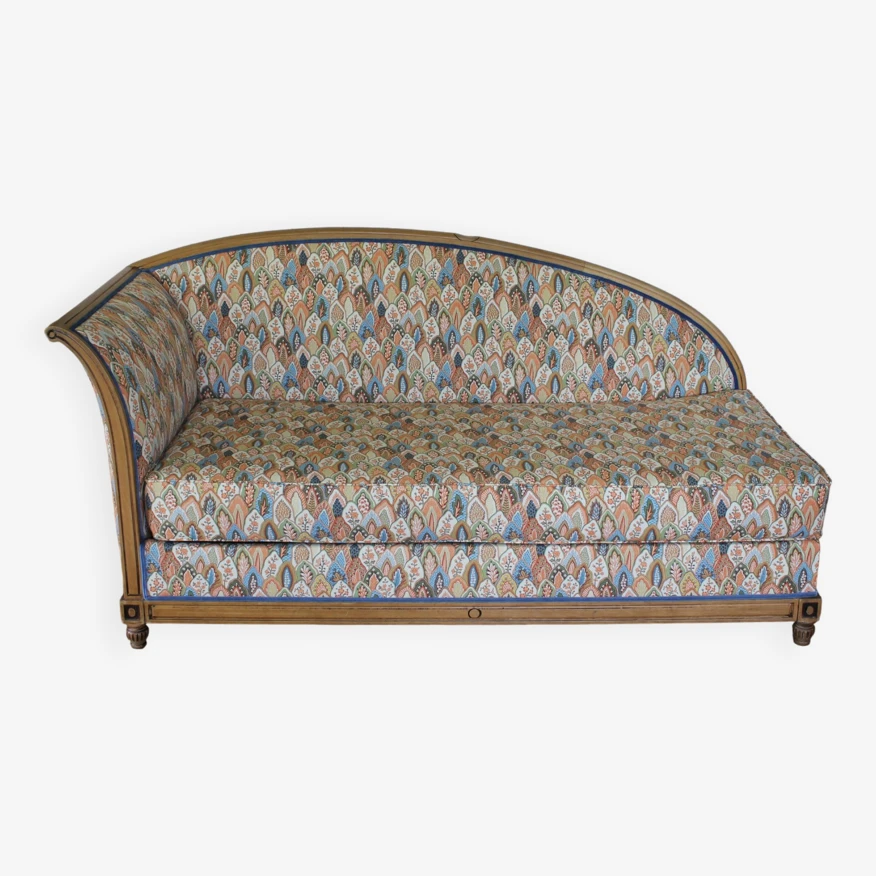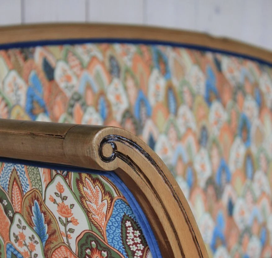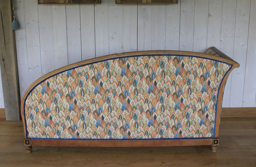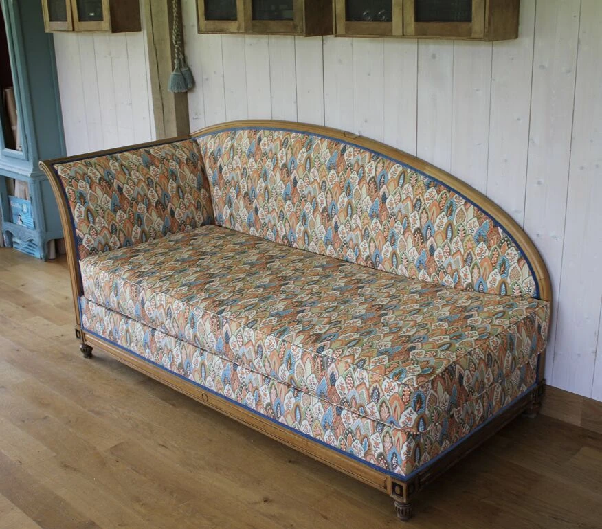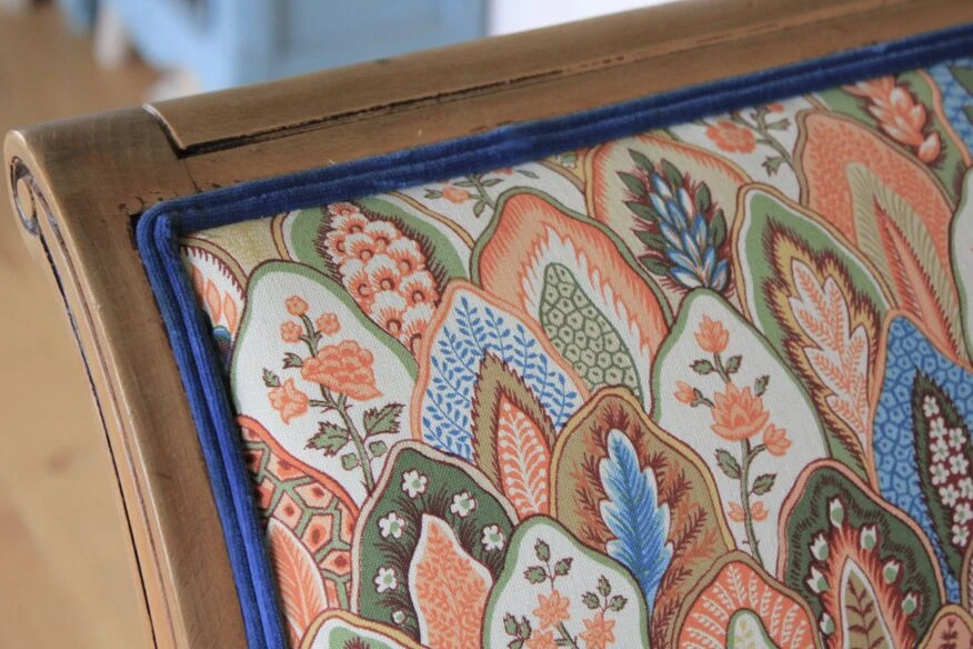 Daybed newly reupholstered with pierre frey fabric, double rope finishes in blue velvet.