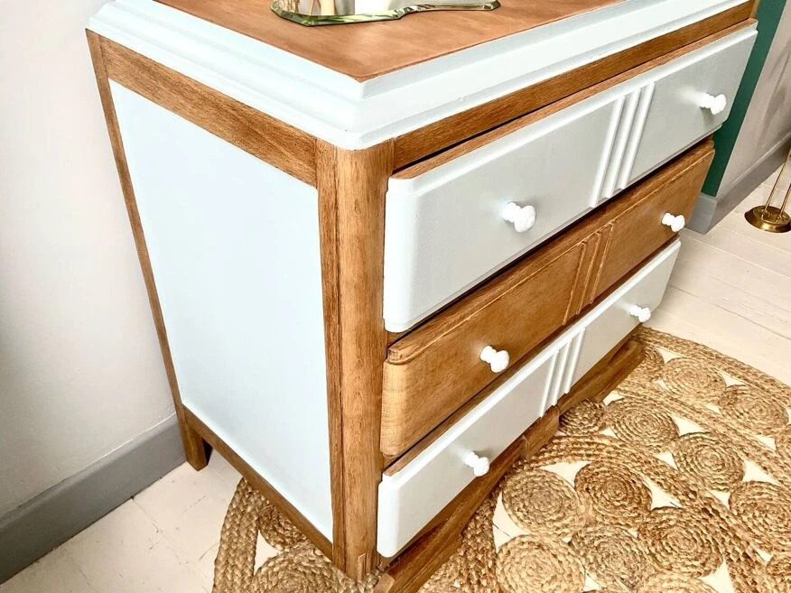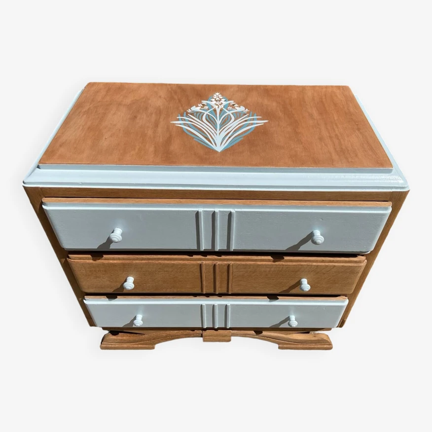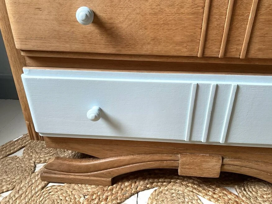 Art deco style chest of drawers completely sanded, treated and partially painted with professional depolluting paint zolpan oxygen color.