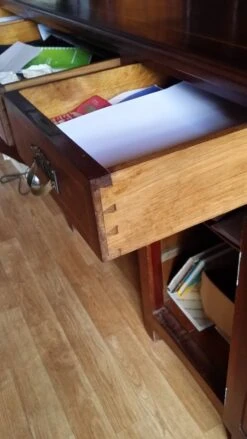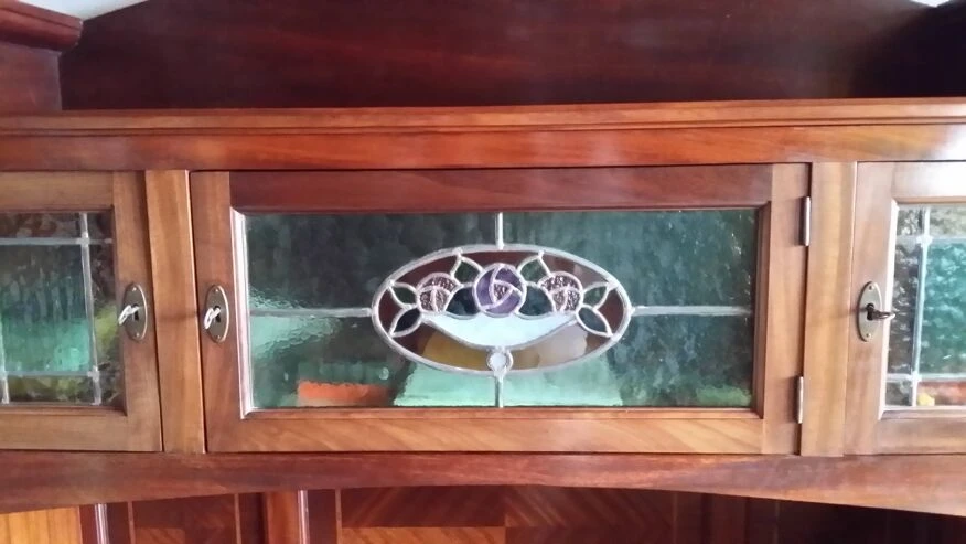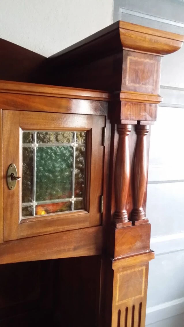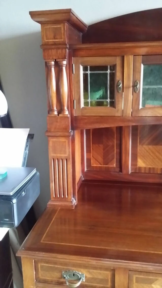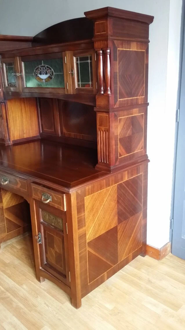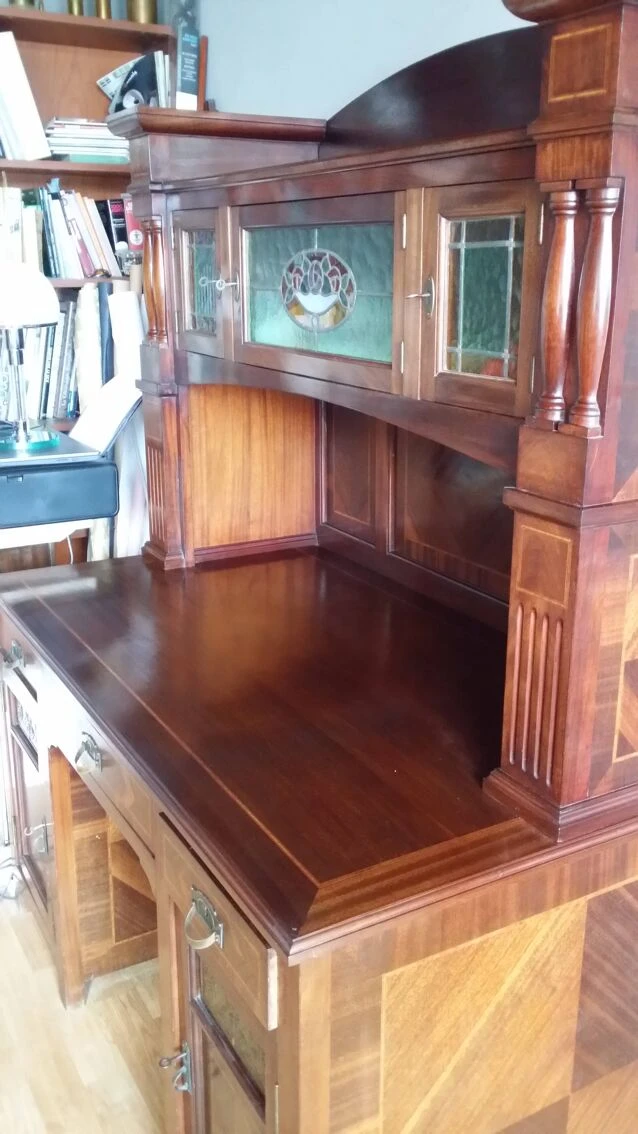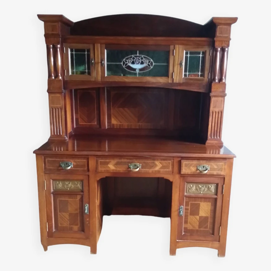 On the upper part, 3 stained glass doors set with lead, no breakage, very good condition, lower part, beautiful marquetry desk, three drawers and two doors decorated with roses on embossed copper plates, the left door opens to four drawers, the right door opens onto a two-story niche, the whole thing dates from the 1900s and is still in use to this day, very good condition, desk: width: 137.5, height: 78, depth: 76, part high width: 137, height: 97, depth: 40, delivery in two packages, office and upper part.