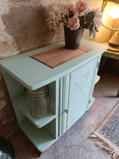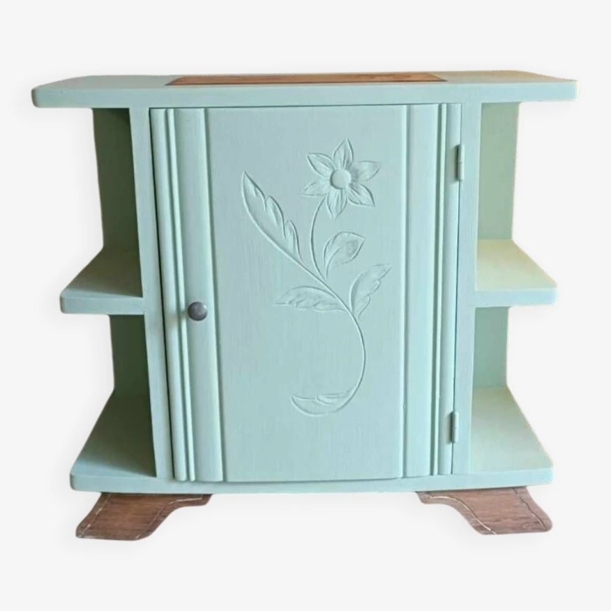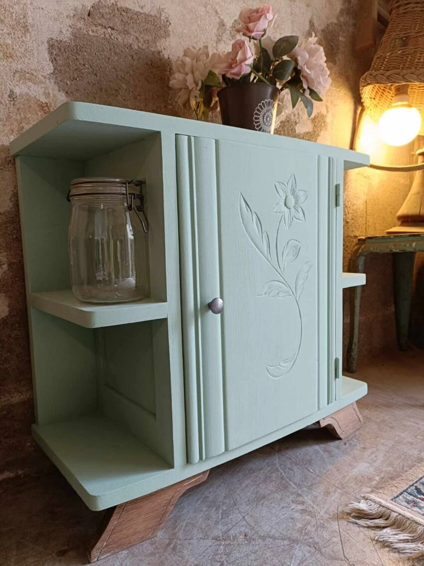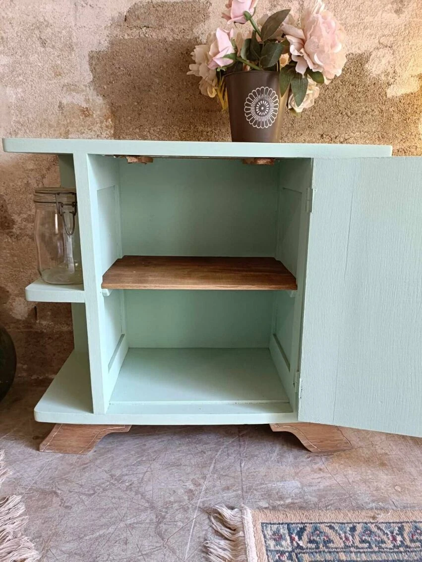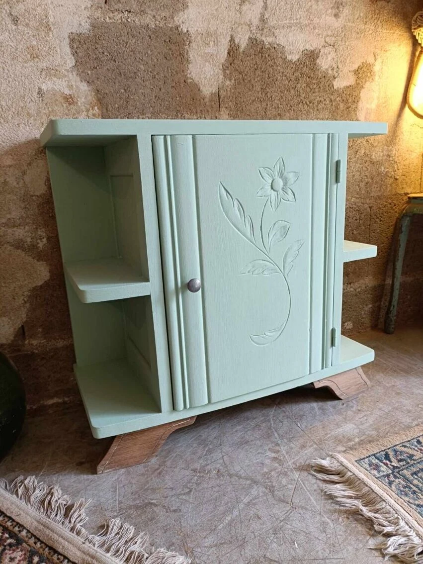 Nice little artdeco buffet! We like the discreet patterns, this touch of artdeco with the floral engraving on the door. Wooden furniture. And look at my mustache feet! We applied a “cΓ©ladon” paint from @liberon_officiel, as you know we love this range of paint for its quality, its pastel side and also a coconut smell that is not unpleasant at all π. On top there is a nice solid plank section. As an occasional piece of furniture in a living room, an entrance, as a bedside table, etc… 65cm wide. 31cm deep. 61cm in height. 25cm depth of interior shelf. 24 average height between shelves.