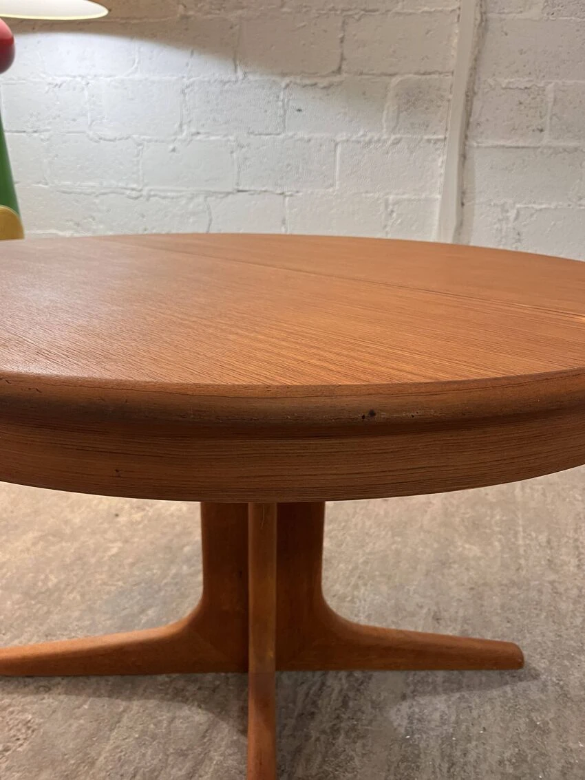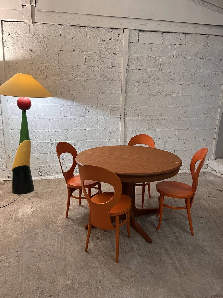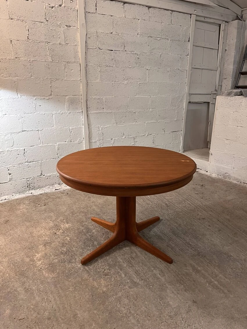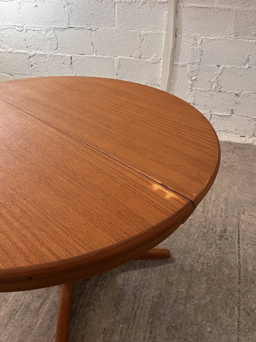 Central leg in solid teak and extendable top with extension in teak veneer.