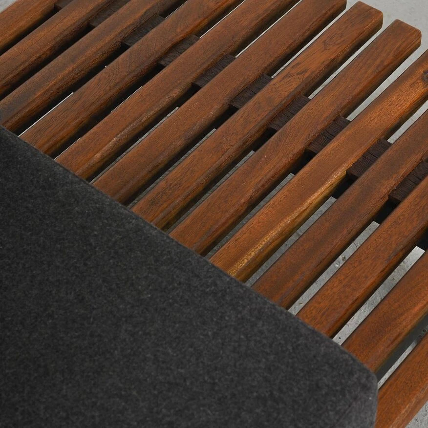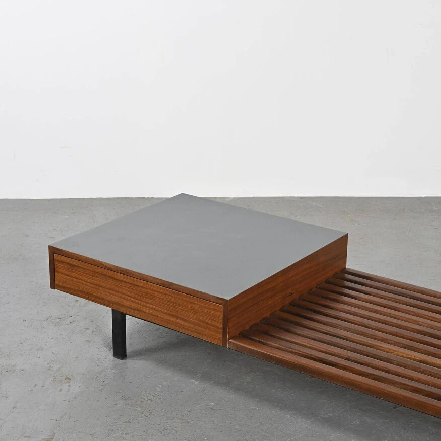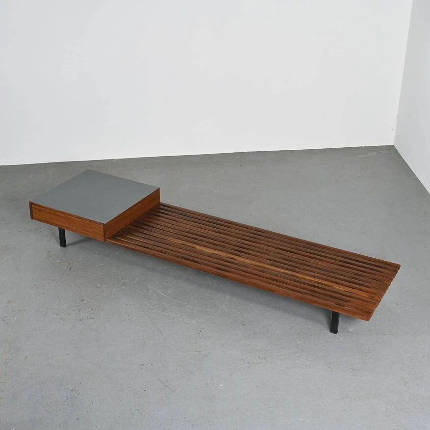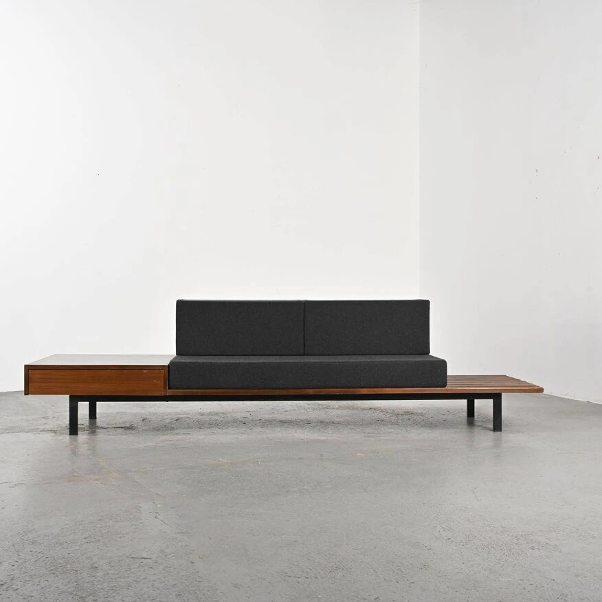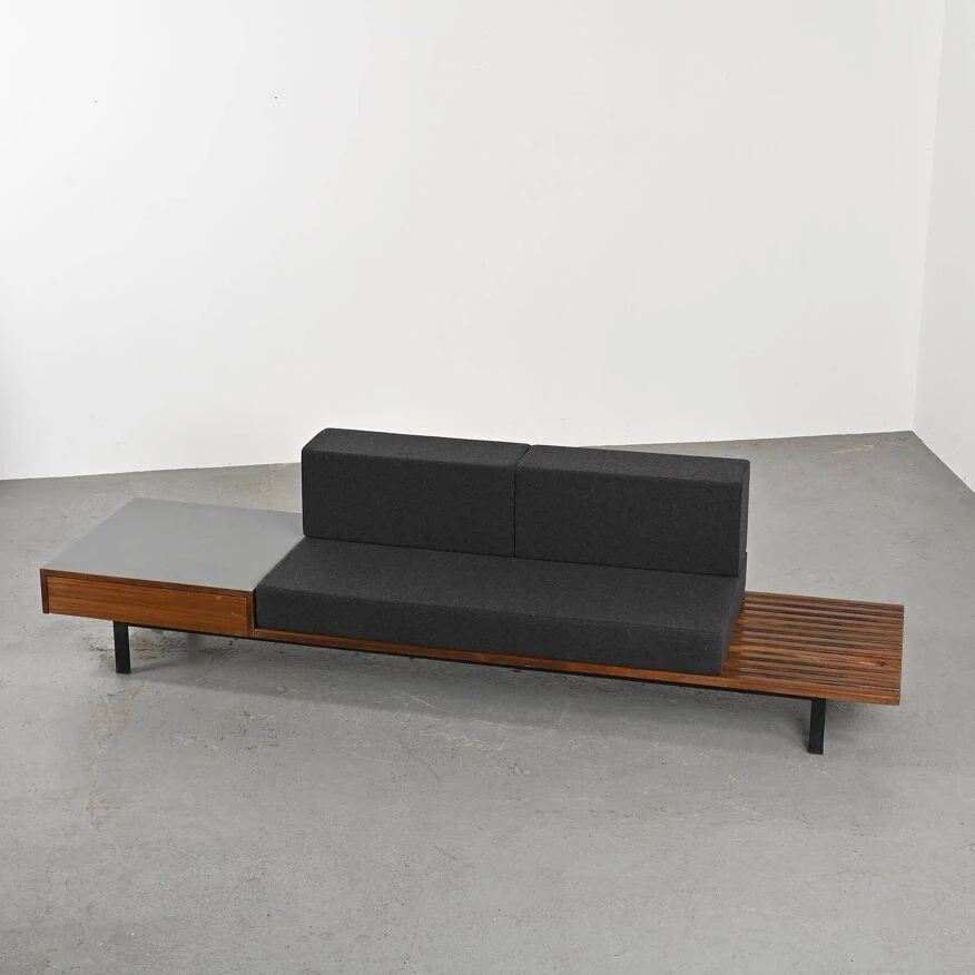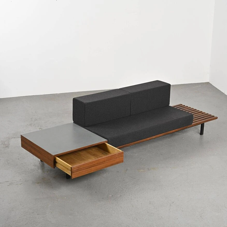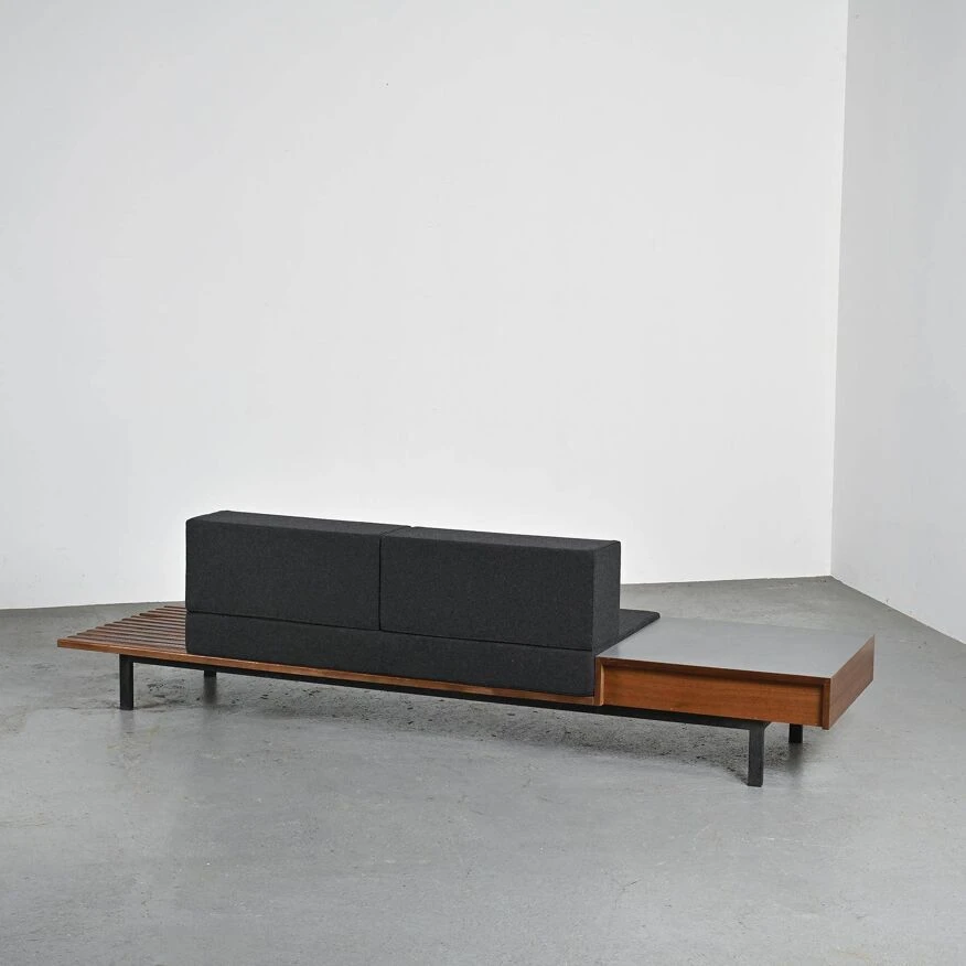 At the end of the 1950s, Charlotte Perriand was asked to design and furnish the city of Cansado, in Mauritania. This mining town was built to house the staff of the Société des Mines de Fer de Mauritania “MIFERMA” and is organized according to an industrial logic, with three distinct districts, “worker”, “supervisors” and executives. In the 1960s, nearly 5,000 people lived in this new town. This rest bench furnished the accommodation of the officers in Cansado. It consists of a black lacquered metal leg, 13 mahogany slats and a storage box covered in gray laminate. The mattress and backrest have been remade in gray woolen cloth from Nobilis. Edition: Steph Simon, Circa 1959 – 1967. Bibliography: Jacques Barsac, Charlotte Perriand, Un art d’habiter, 1903-1959, Paris, 2005, page 440 for similar models. François Laffanour, Steph Simon, Retrospective 1956-1974, Paris, 2007