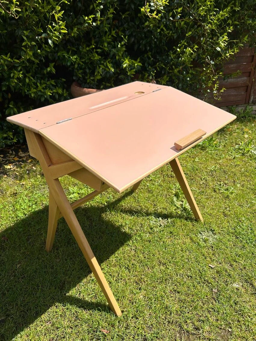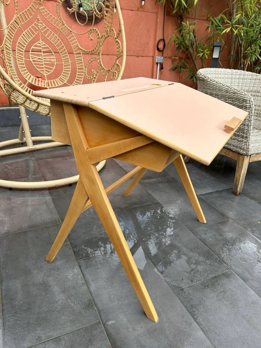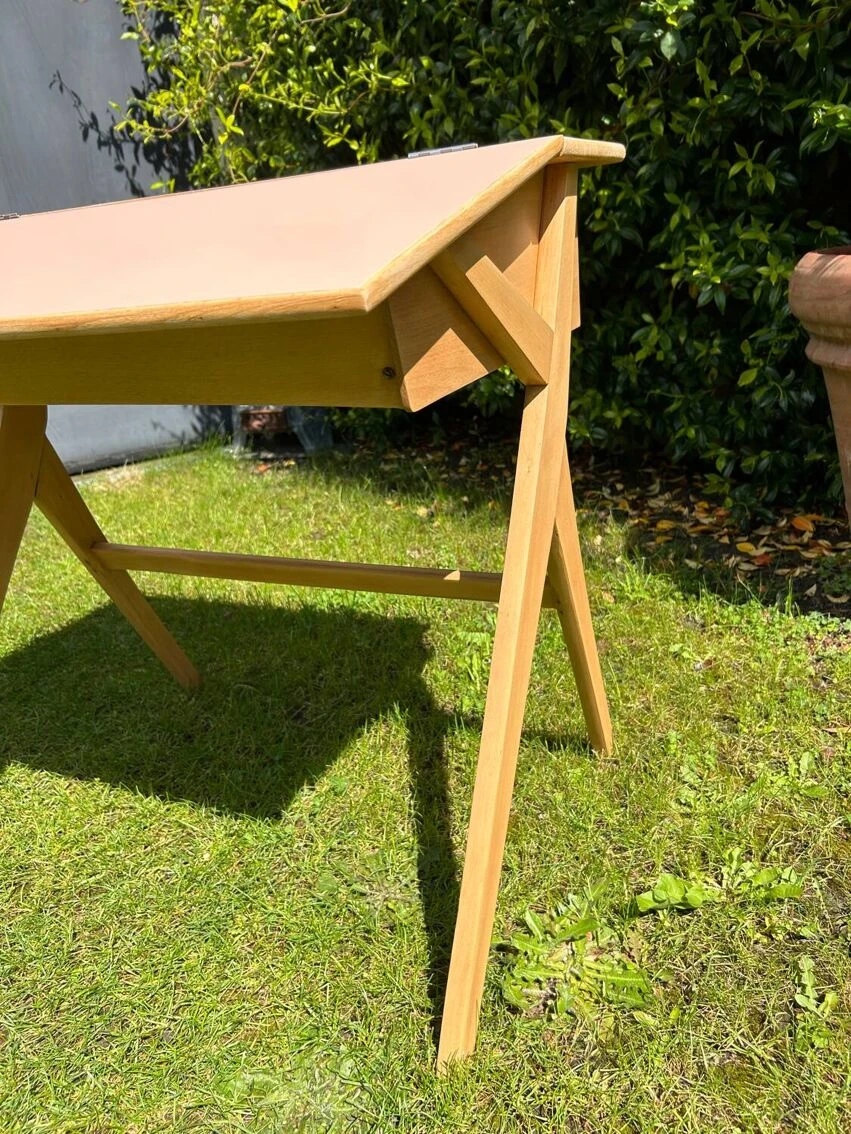 Vintage desk from the 50s with a pretty base, compass feet as we like. It has been sanded and pampered. Top repainted with Liberon paint, velvety matte cameo pink color + application of matte varnish in 2 coats. It is possible to leave the top tilted or make it completely horizontal thanks to a system of cleats. A piece of furniture with a history and experience.