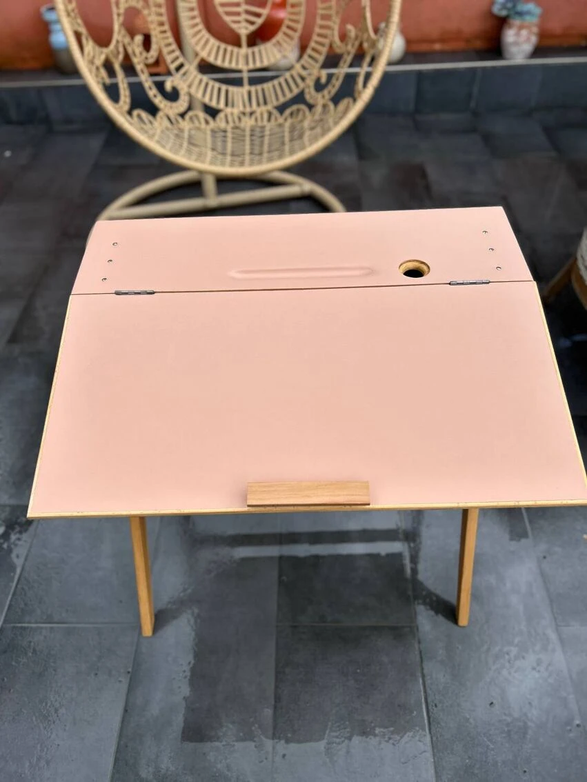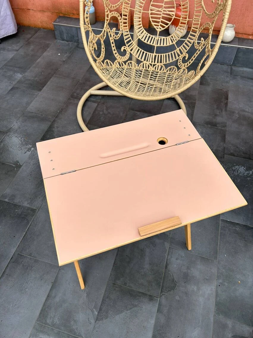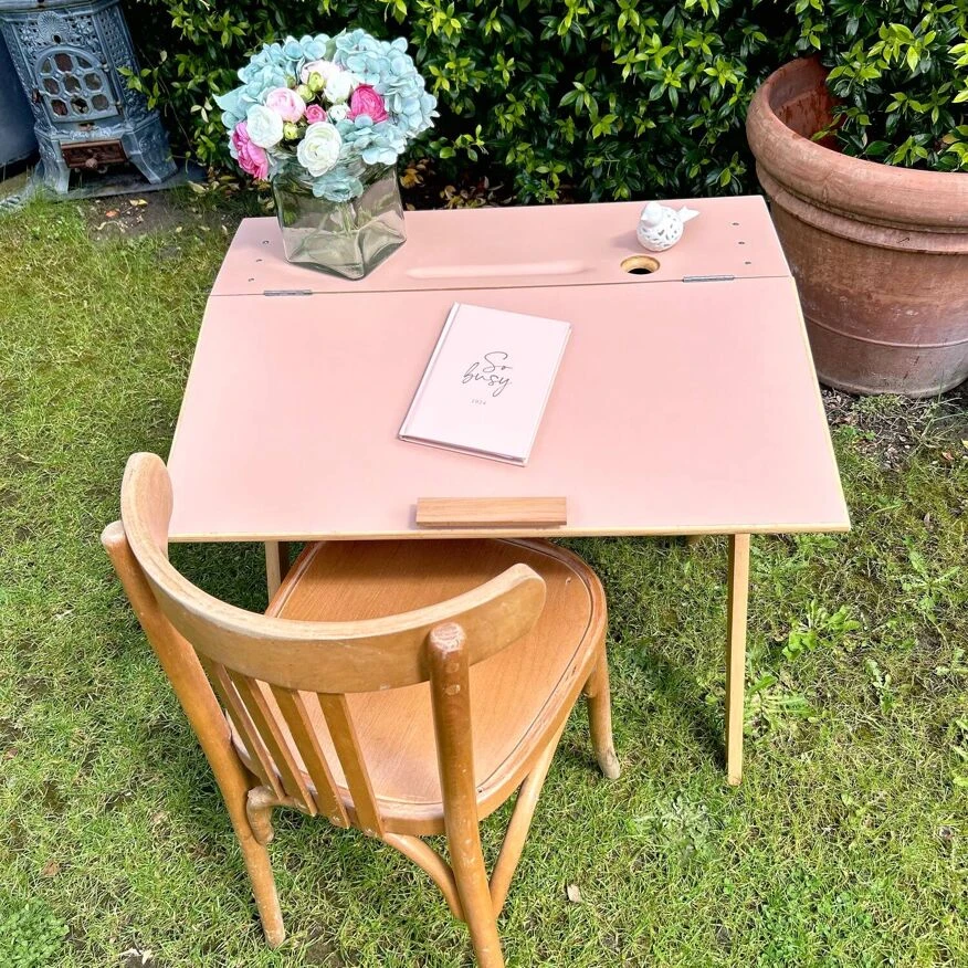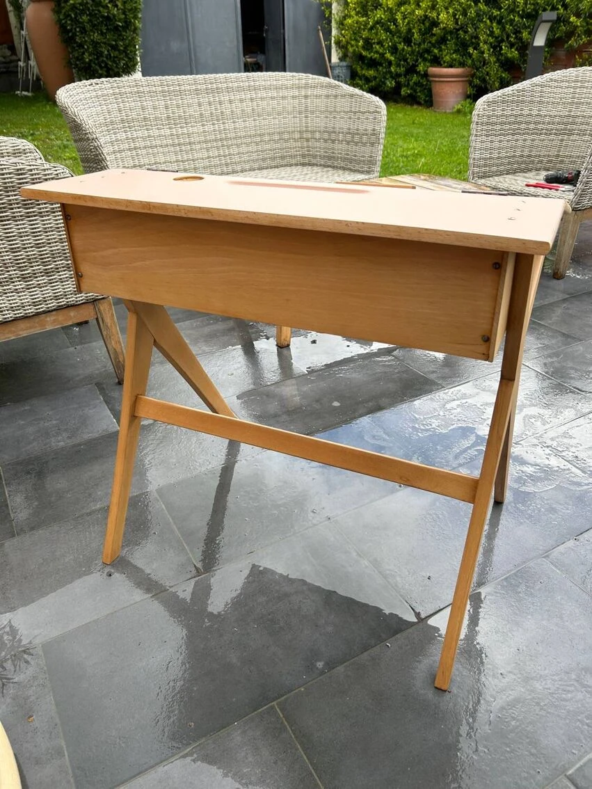 Vintage desk from the 50s with a pretty base, compass feet as we like. It has been sanded and pampered. Top repainted with Liberon paint, velvety matte cameo pink color + application of matte varnish in 2 coats. It is possible to leave the top tilted or make it completely horizontal thanks to a system of cleats. A piece of furniture with a history and experience.