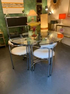 Very beautiful set composed of a round glass-topped table and its 4 chairs, all from the italian 70s in the style of belga chrome.