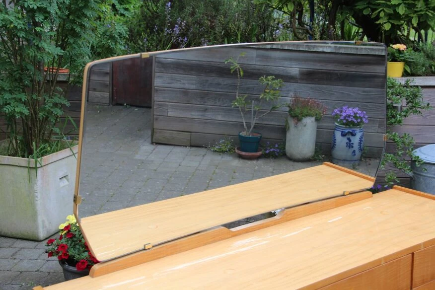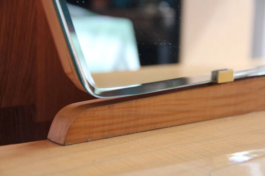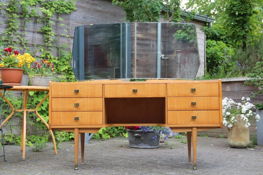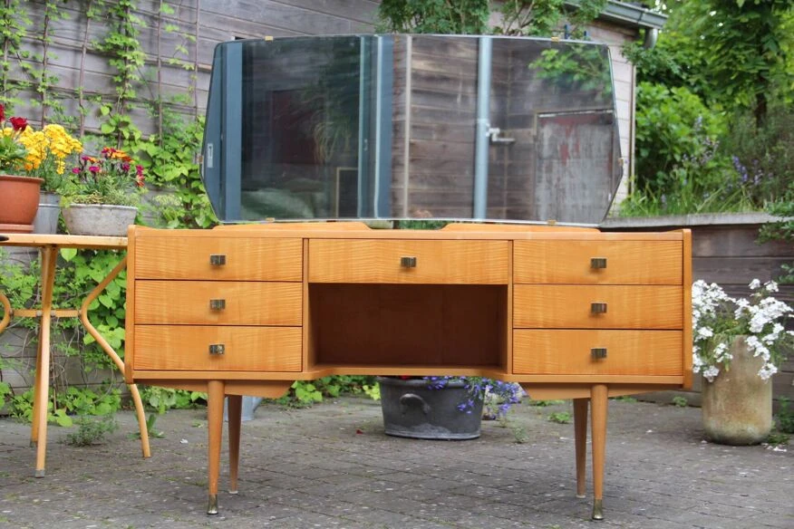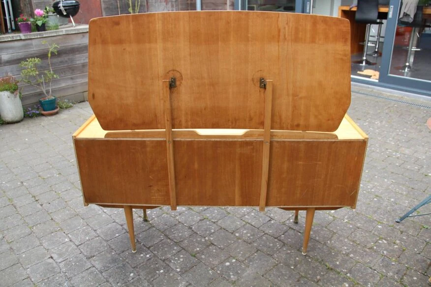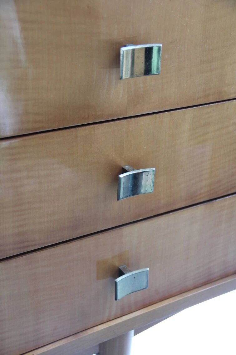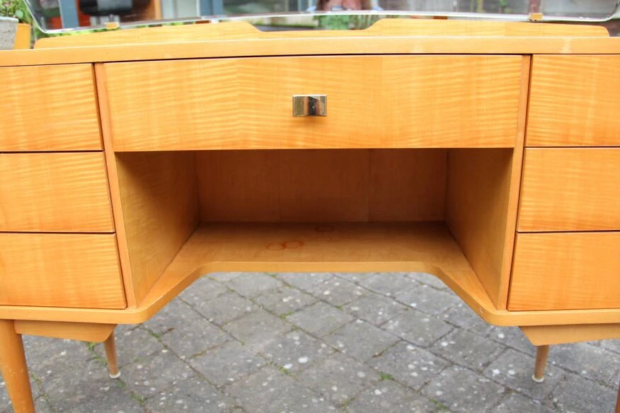 Pretty dressing table from the late ’50s in varnished lemon wood. 7 drawers 3 bottle spots on the upper shelf.