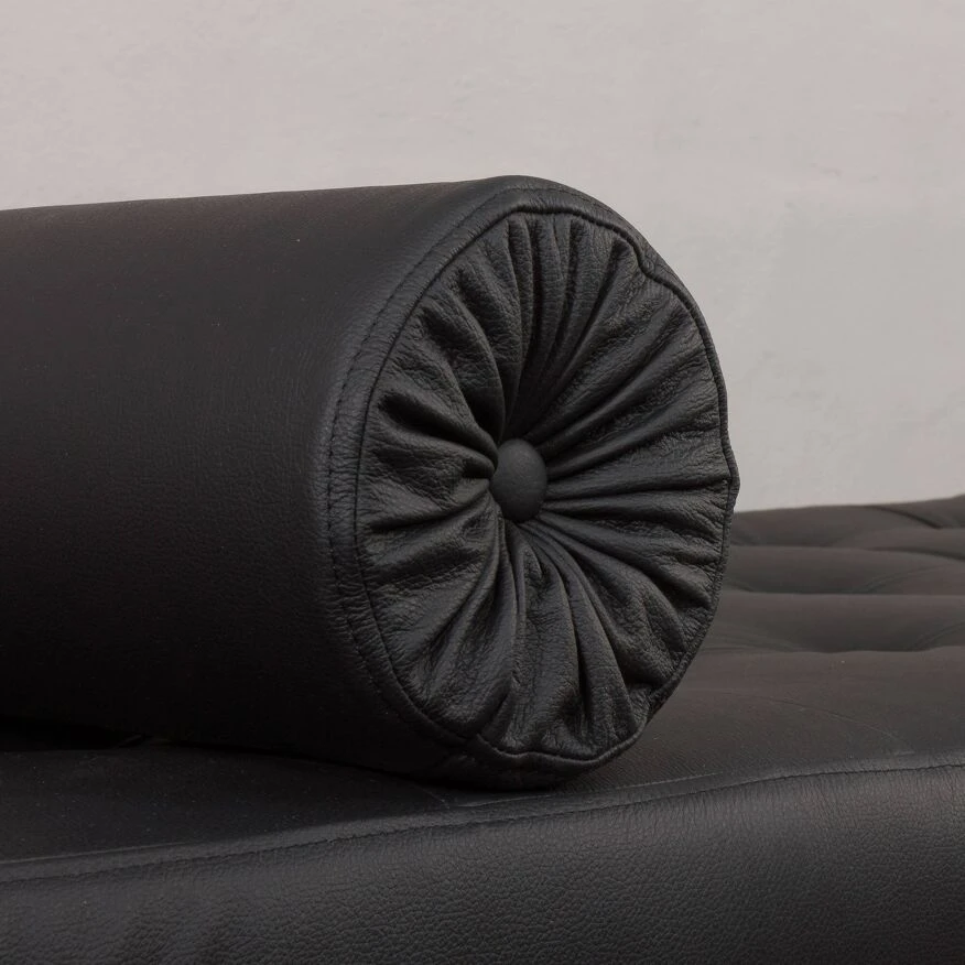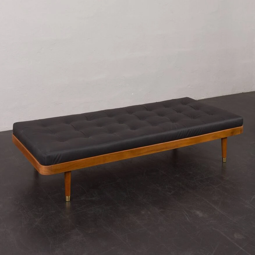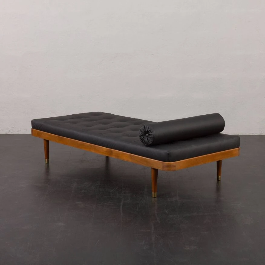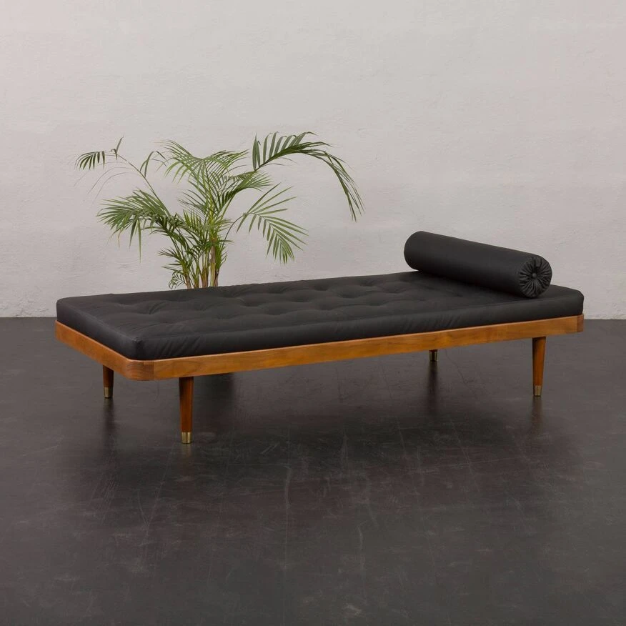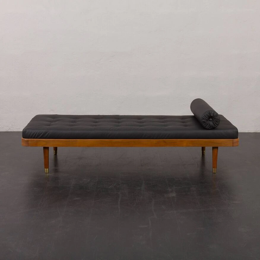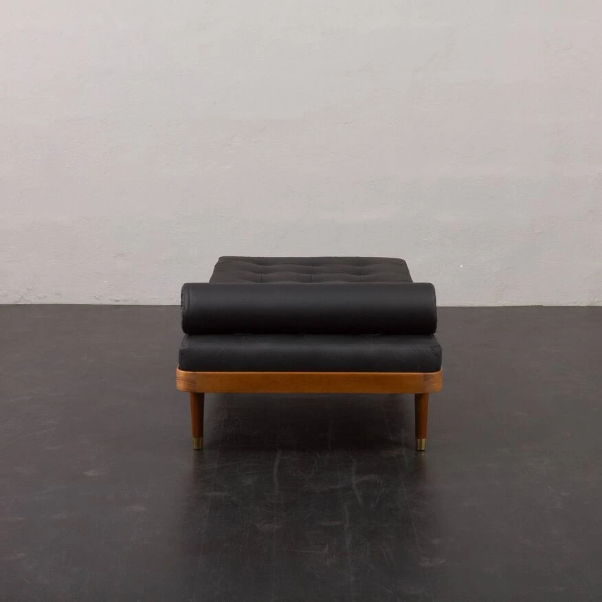 The wood frame, made from teak, along with the new black aniline leather upholstery, makes this mid-century daybed both stylish and comfortable.