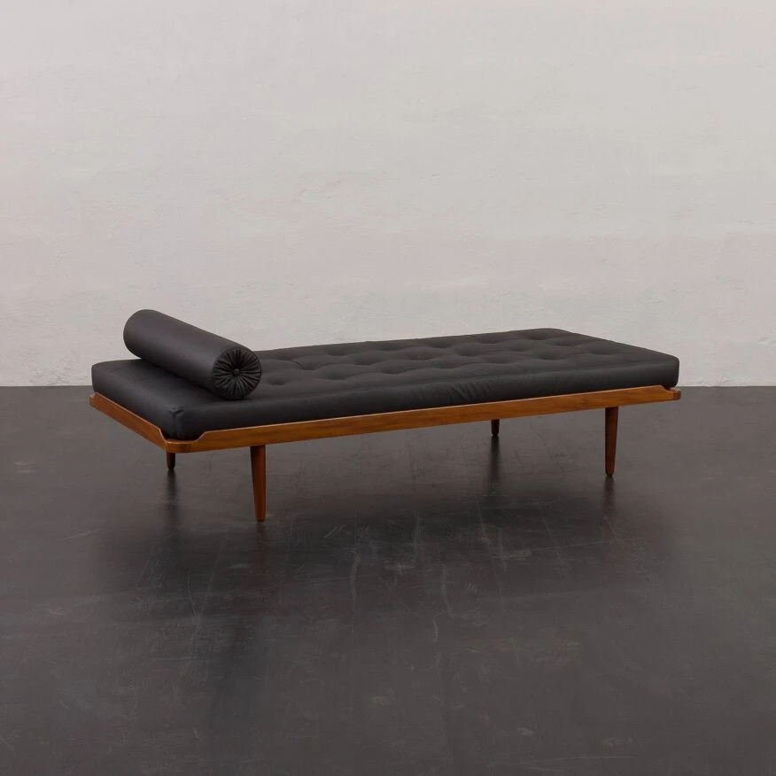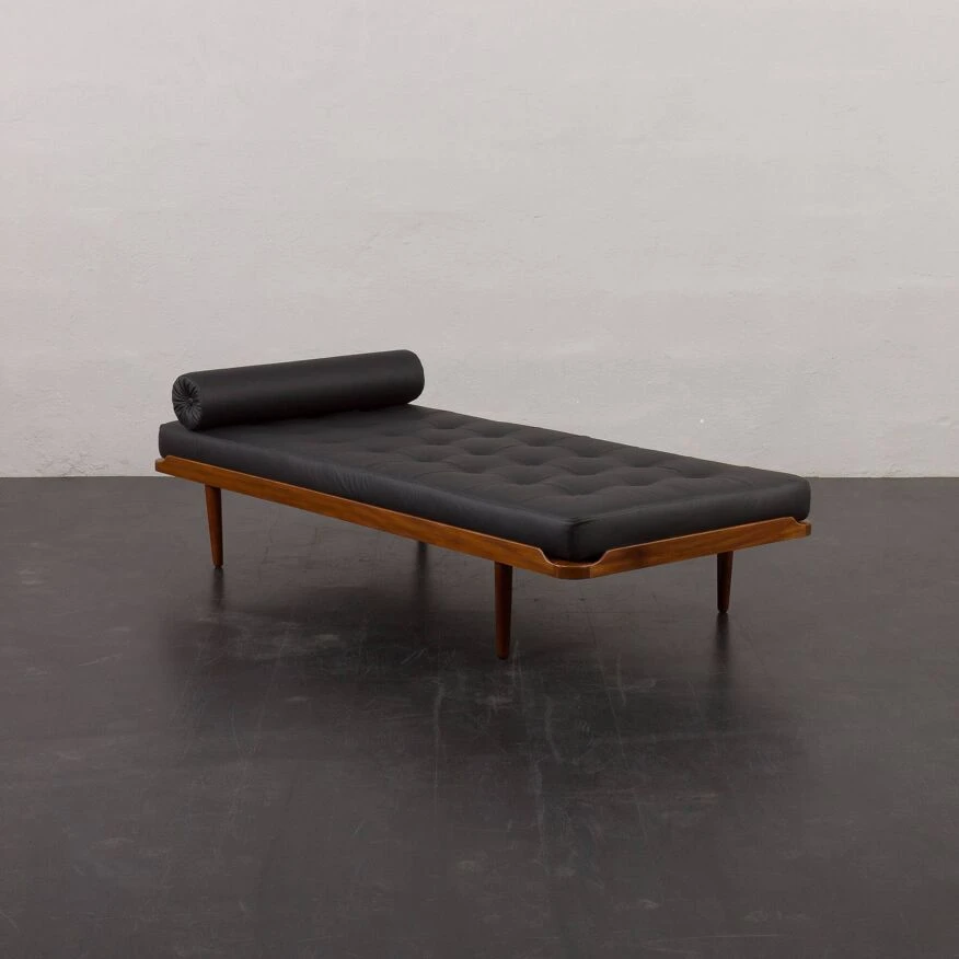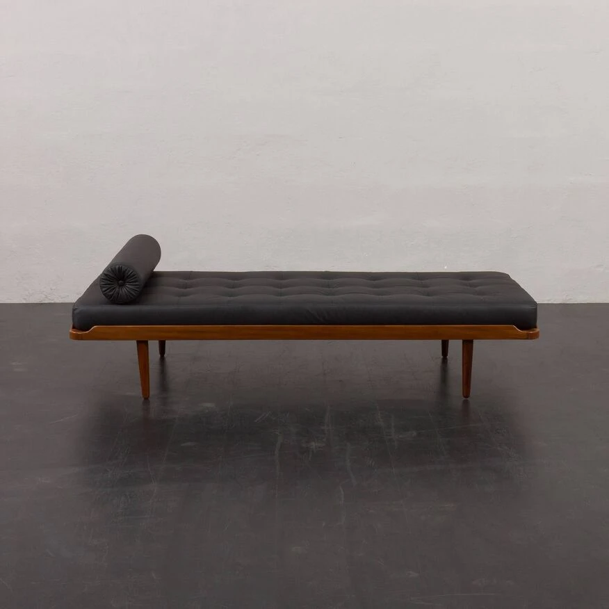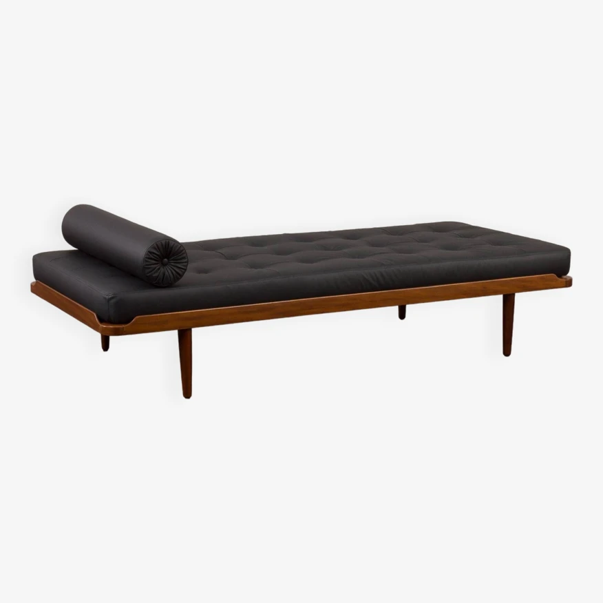 Johansson’s “g19” project from the same period. the daybed features a solid teak frame and a quilted mattress in black leather with new foam inside, along with a decorative bolster, adding an elegant touch to the piece. it showcases high-quality craftsmanship, ensuring comfort for relaxation.