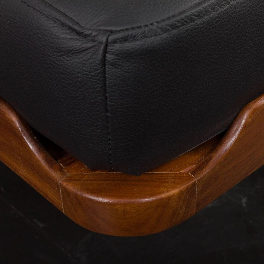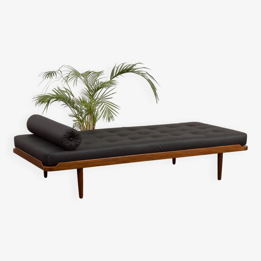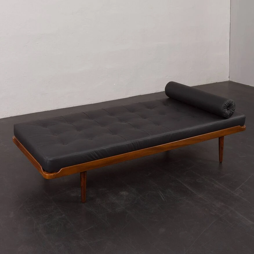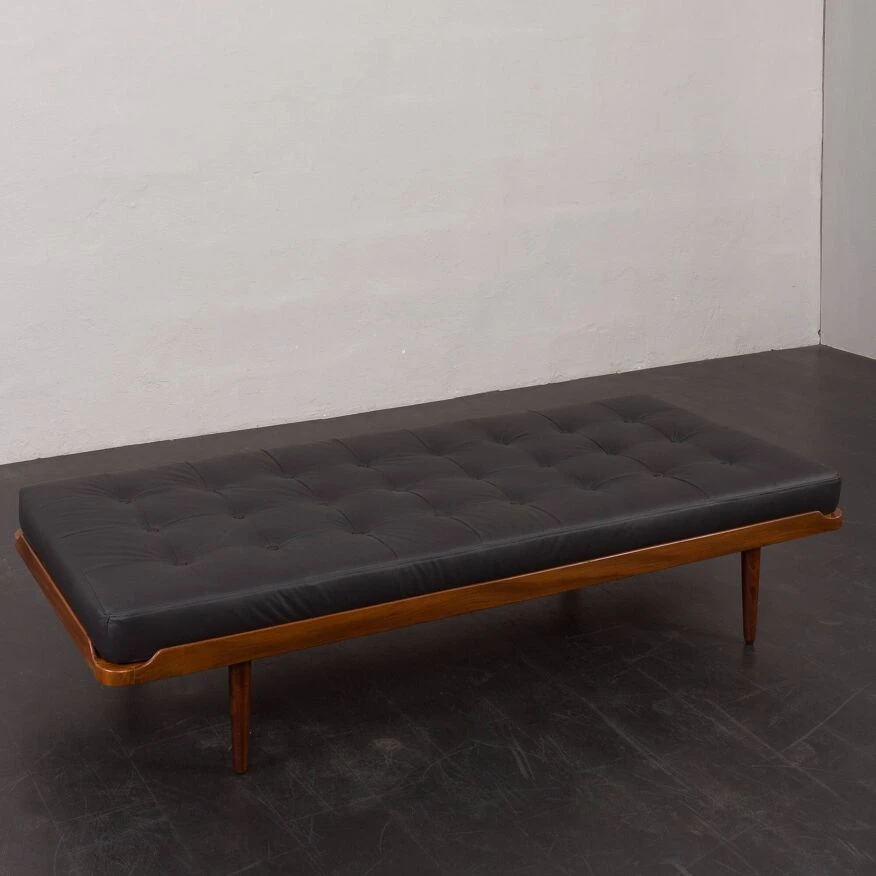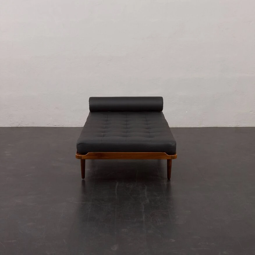 Johansson’s “g19” project from the same period. the daybed features a solid teak frame and a quilted mattress in black leather with new foam inside, along with a decorative bolster, adding an elegant touch to the piece. it showcases high-quality craftsmanship, ensuring comfort for relaxation.