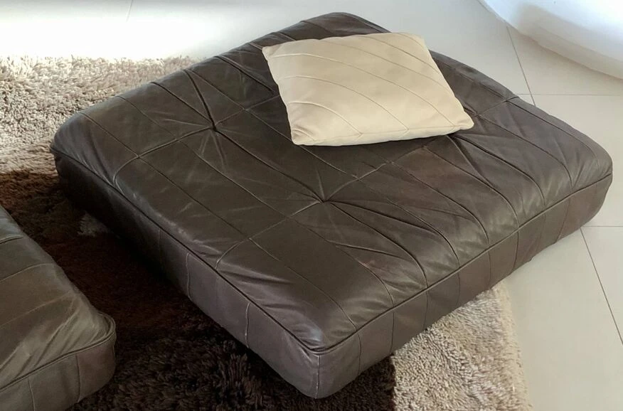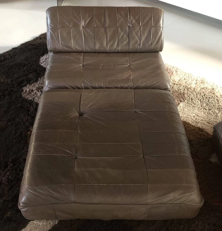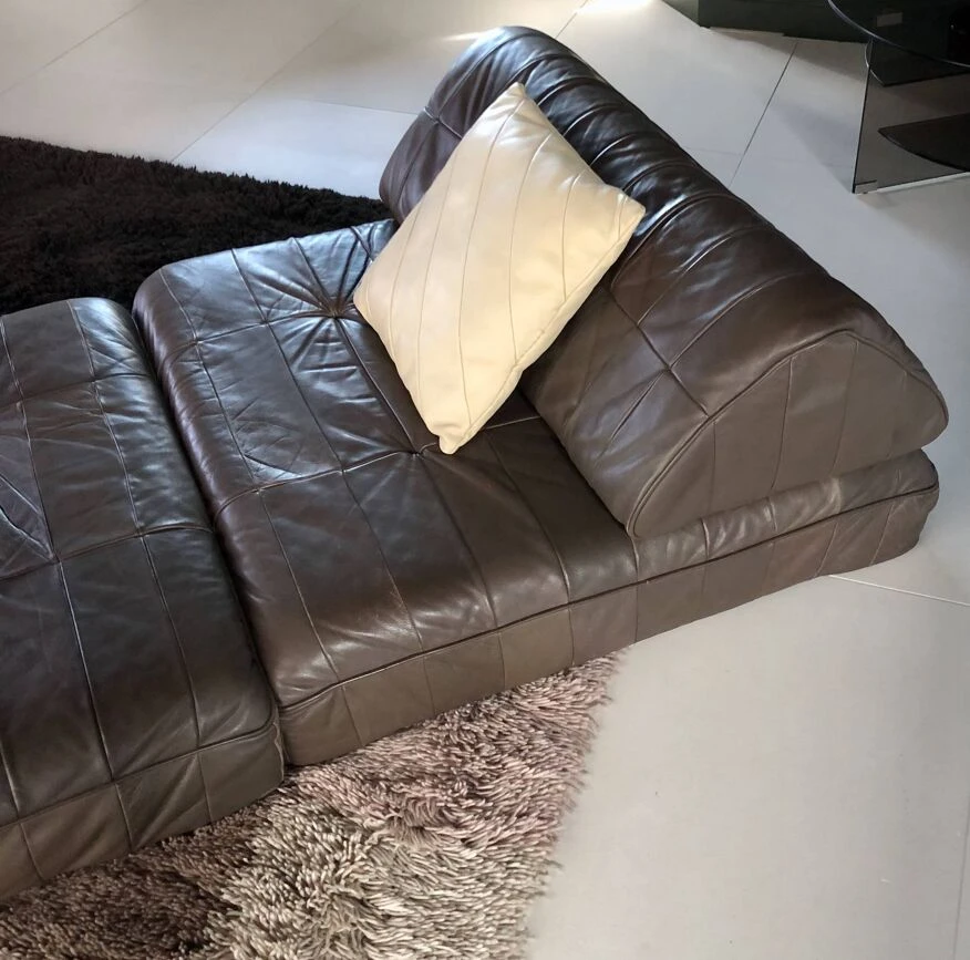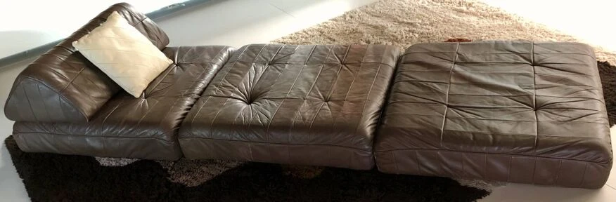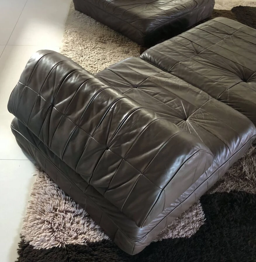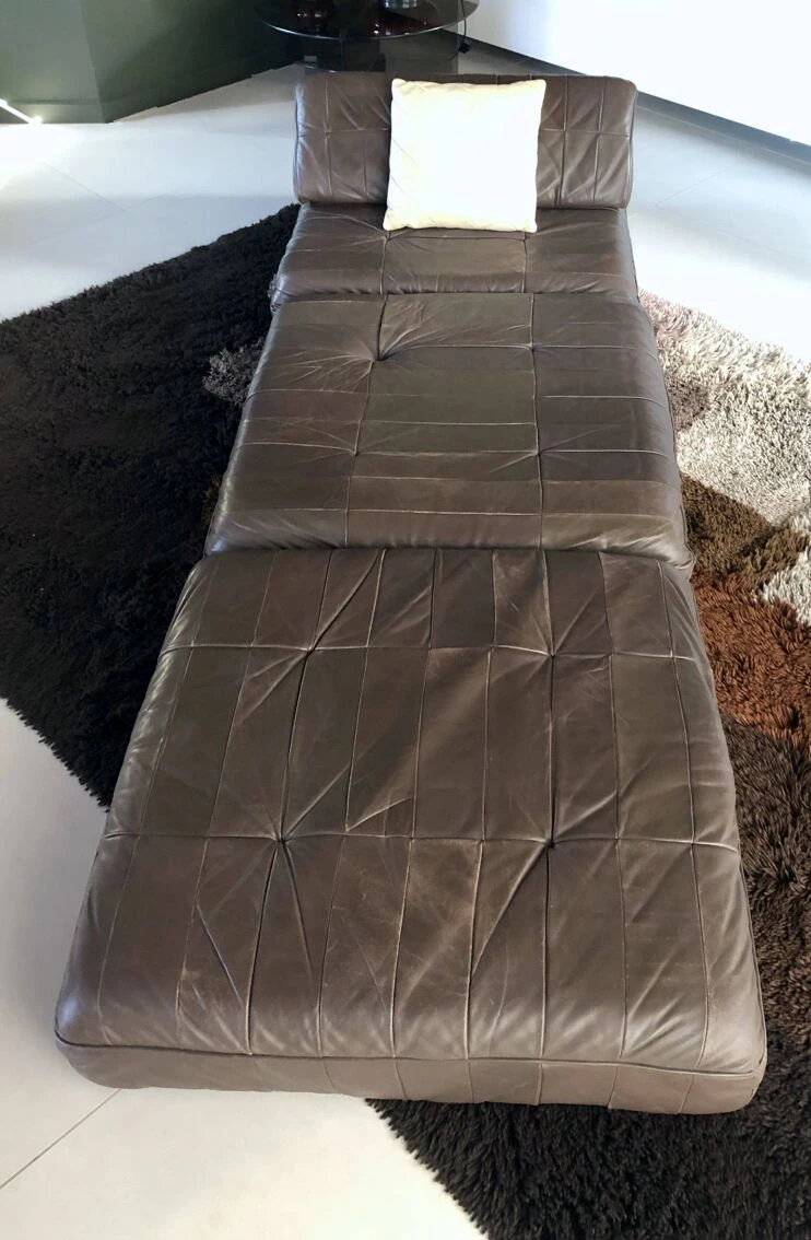 De Sede ds88 day bed in patchwork leather from the Trinidad series, Switzerland 1970s. Composed of 3 modular leather seat cushions (h 20 l 90 d 90cm), a triangular leather cushion (h 27 l 90 d 47cm) and a square cushion in ecru leather. Triangular and square cushions in very good condition. Seat cushions with some traces related to age and use.