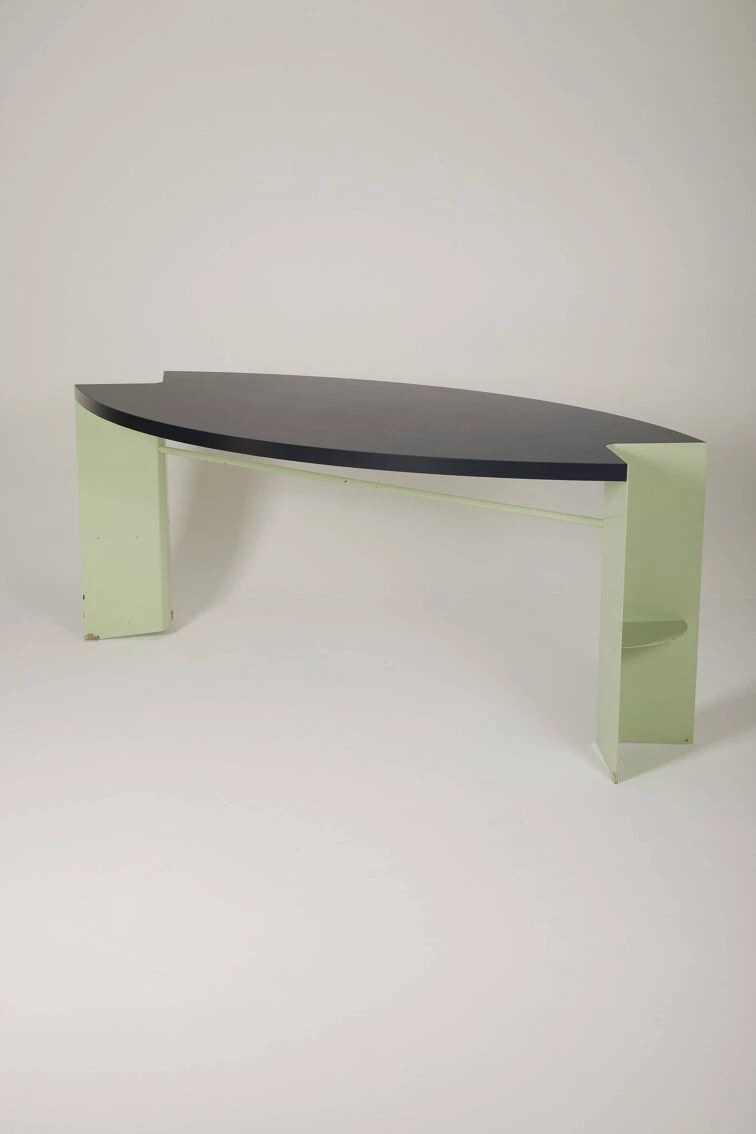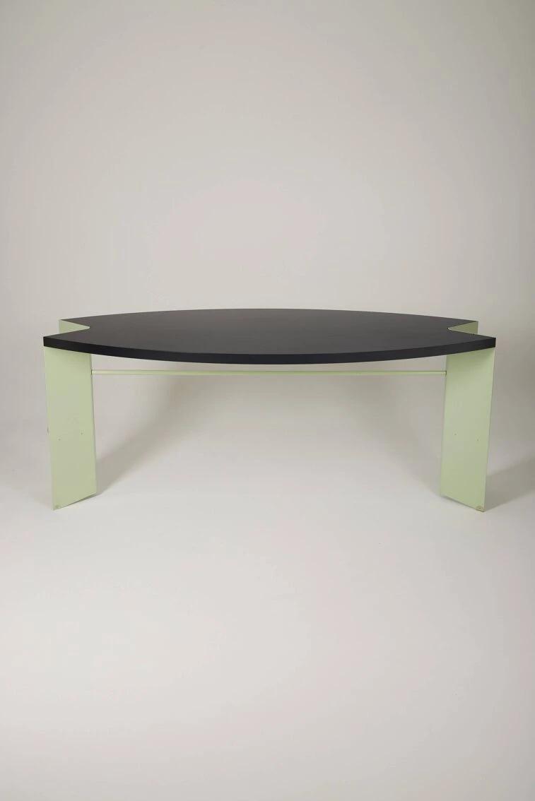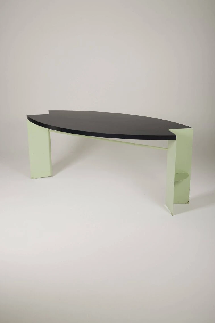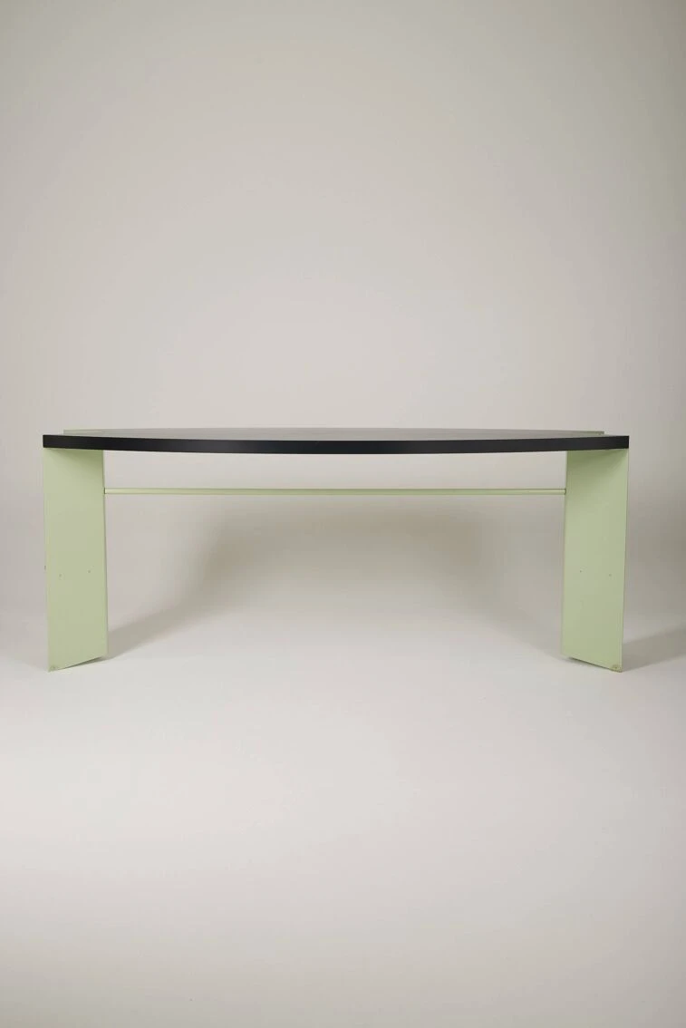 This large desk table has a structure in black laminate and green lacquered canvas.