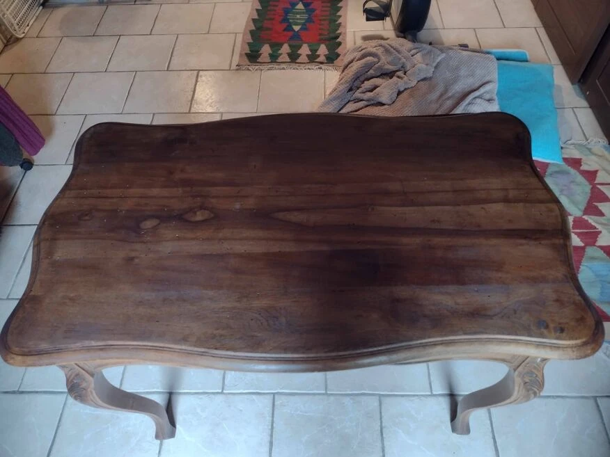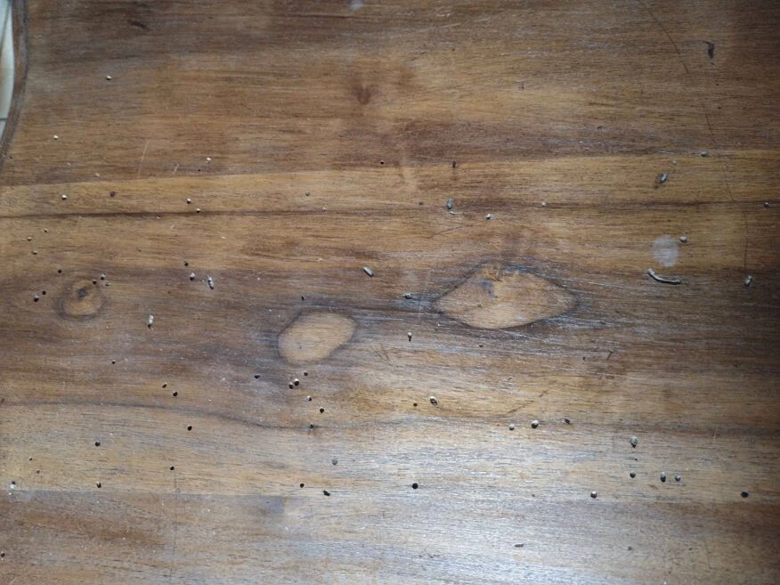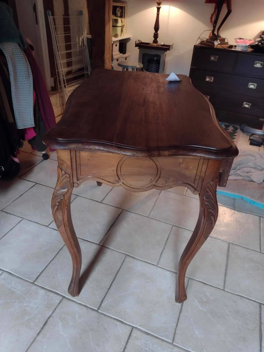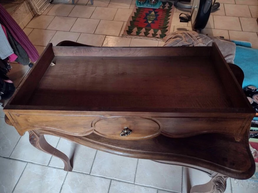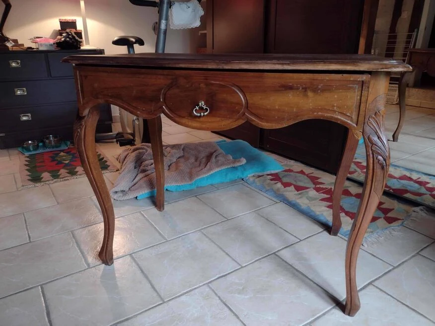 Wooden desk with one drawer. Some small natural stains and holes on the top and front of the drawer. The drawer has a slight day (see photo).