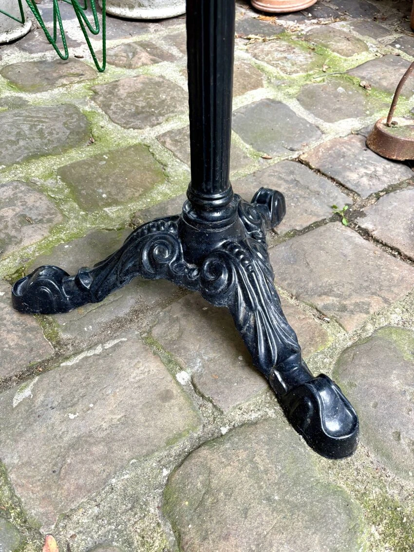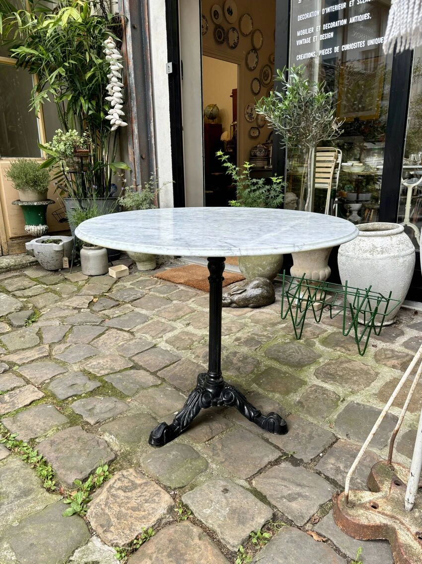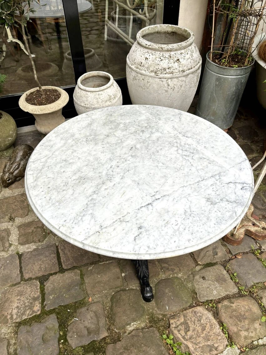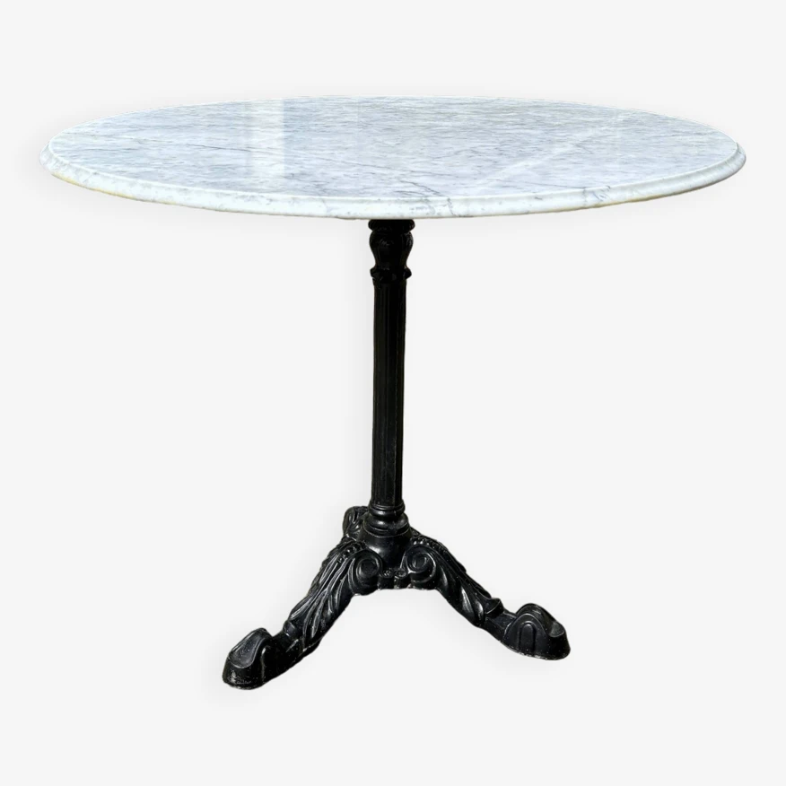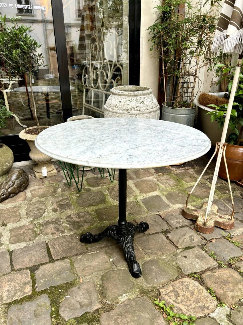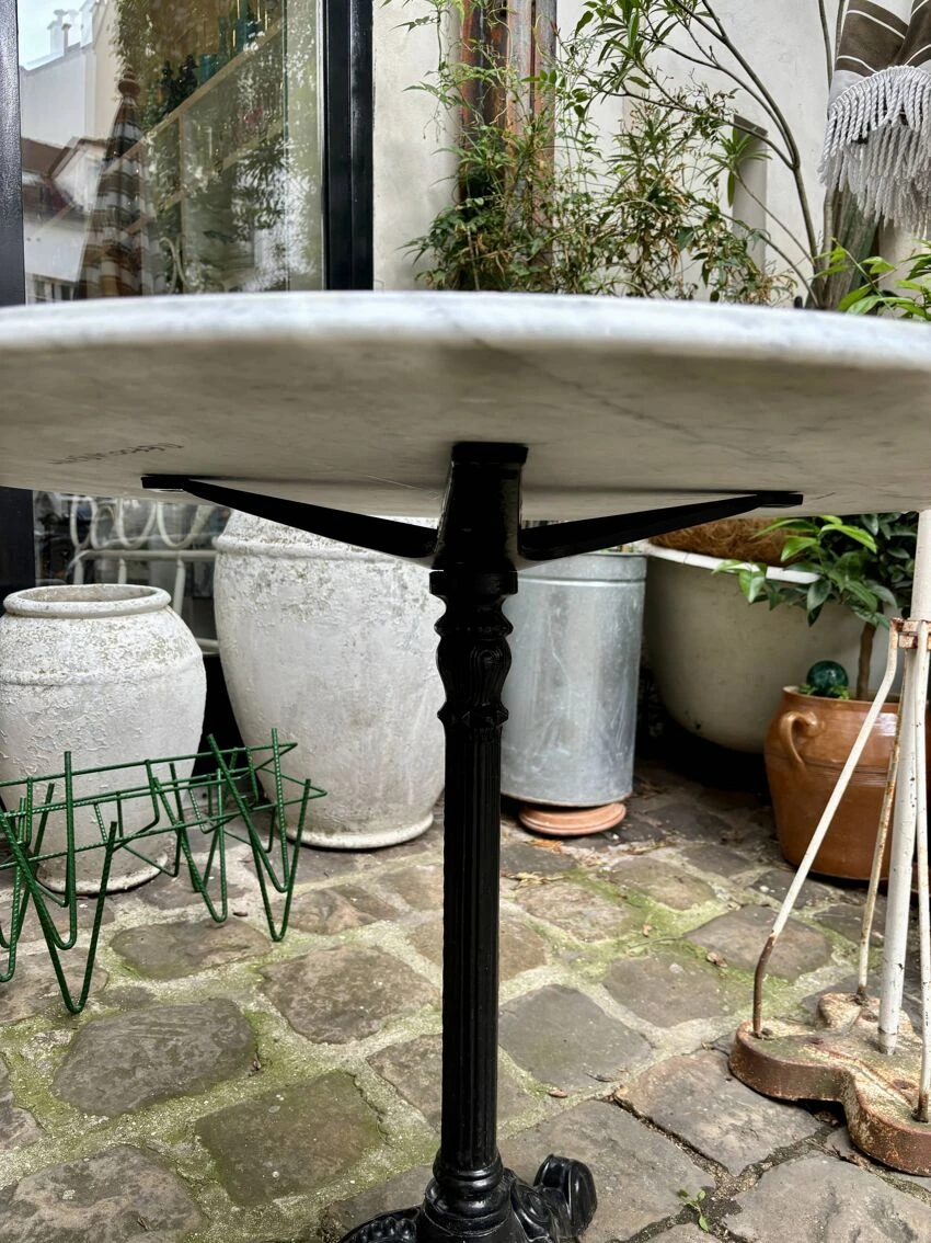 Dining room table composed of a round top with bevel on the edge in light gray marble with beautiful anthracite ribs and a central leg and tripod in black cast iron repeating the lines of the bistro legs early 20th century.