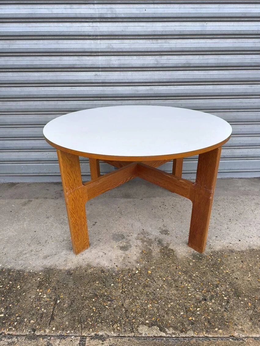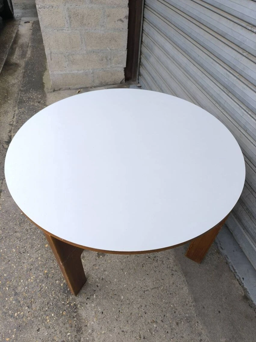 les arcs pine dining room table with circular white laminate top resting on 4 flat legs with cruciform crotch. Around 1960-1970. Dimensions 72 cm x 110 cm. Used condition, scratches and small dents.