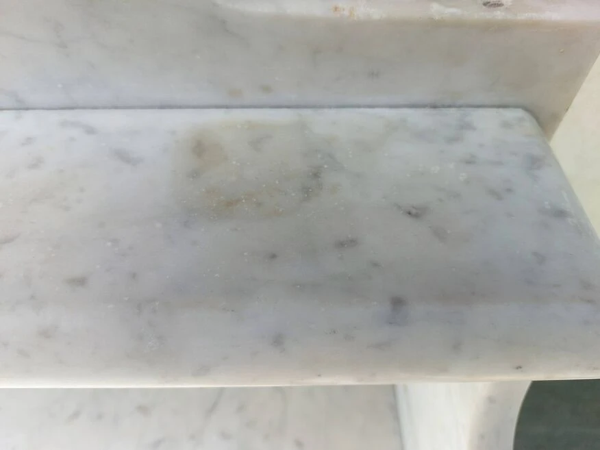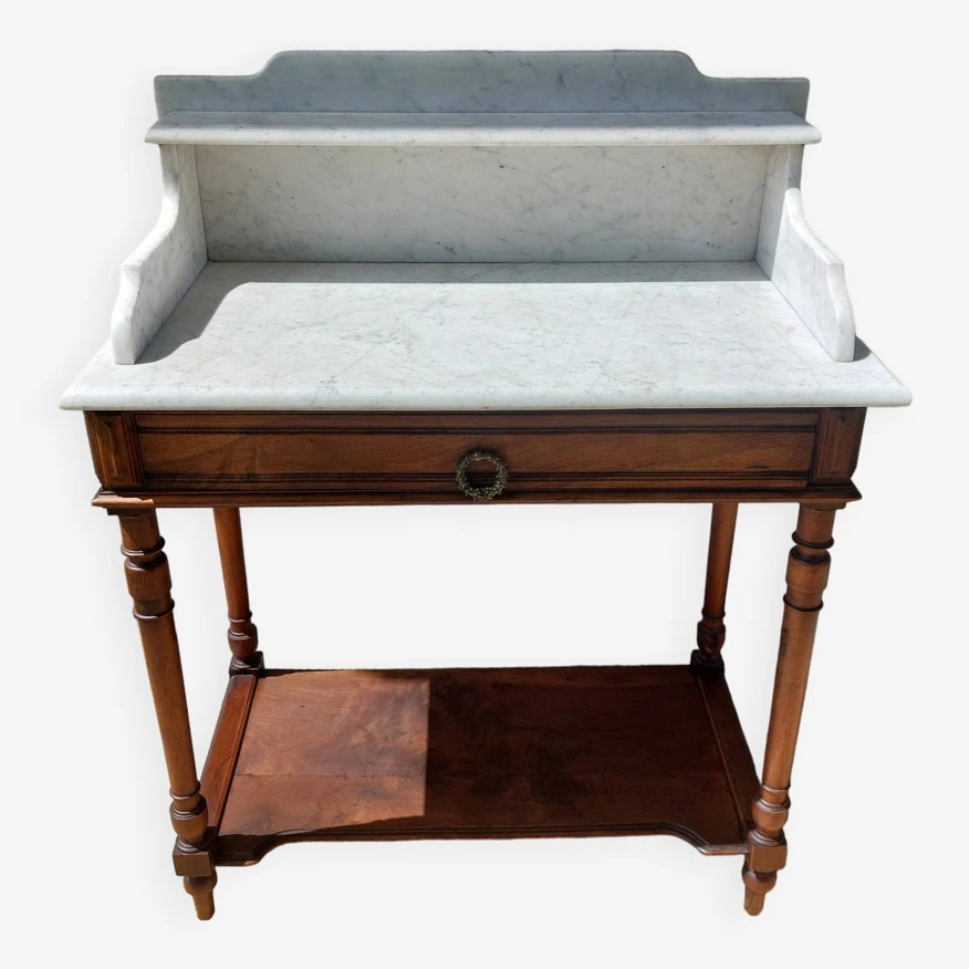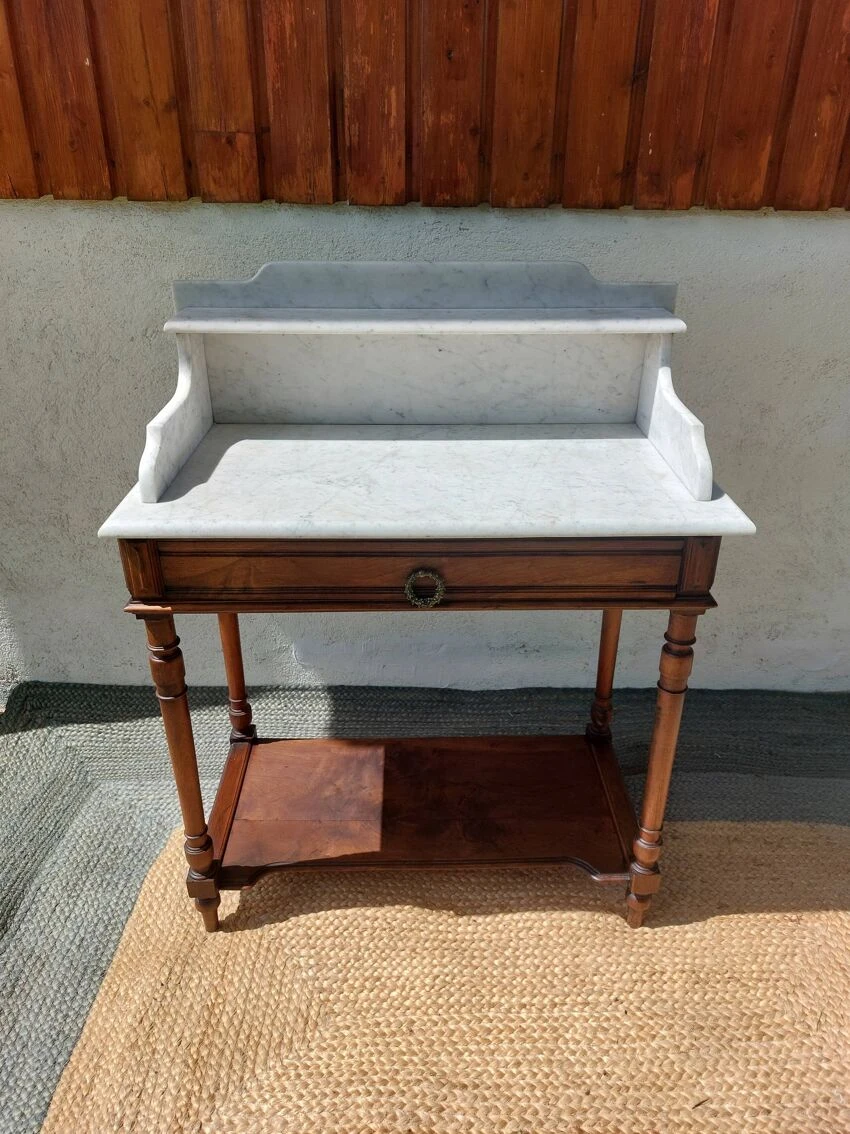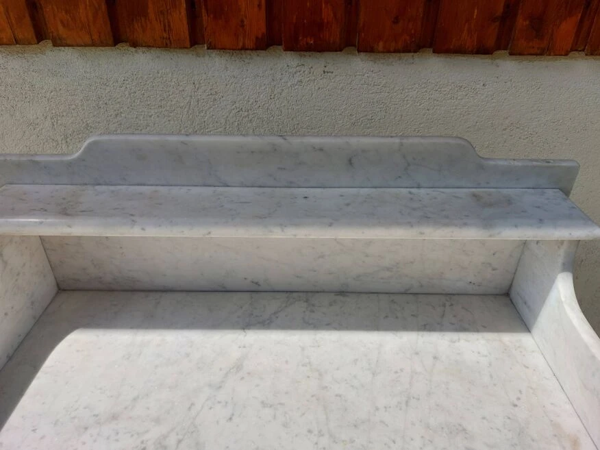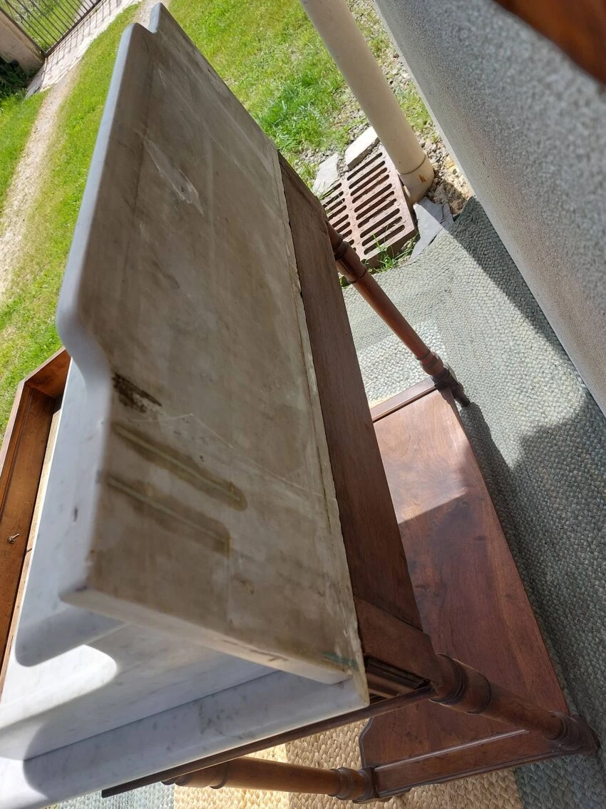 The white marble top is in very good condition (a tear can be seen in the photos), it is removable.