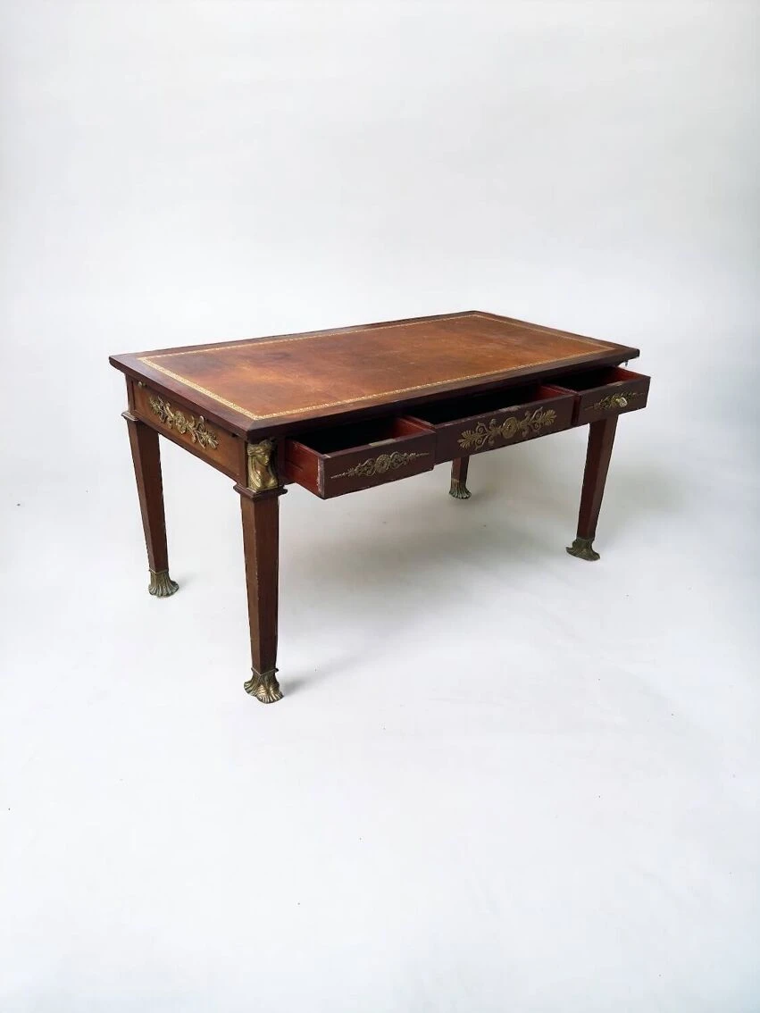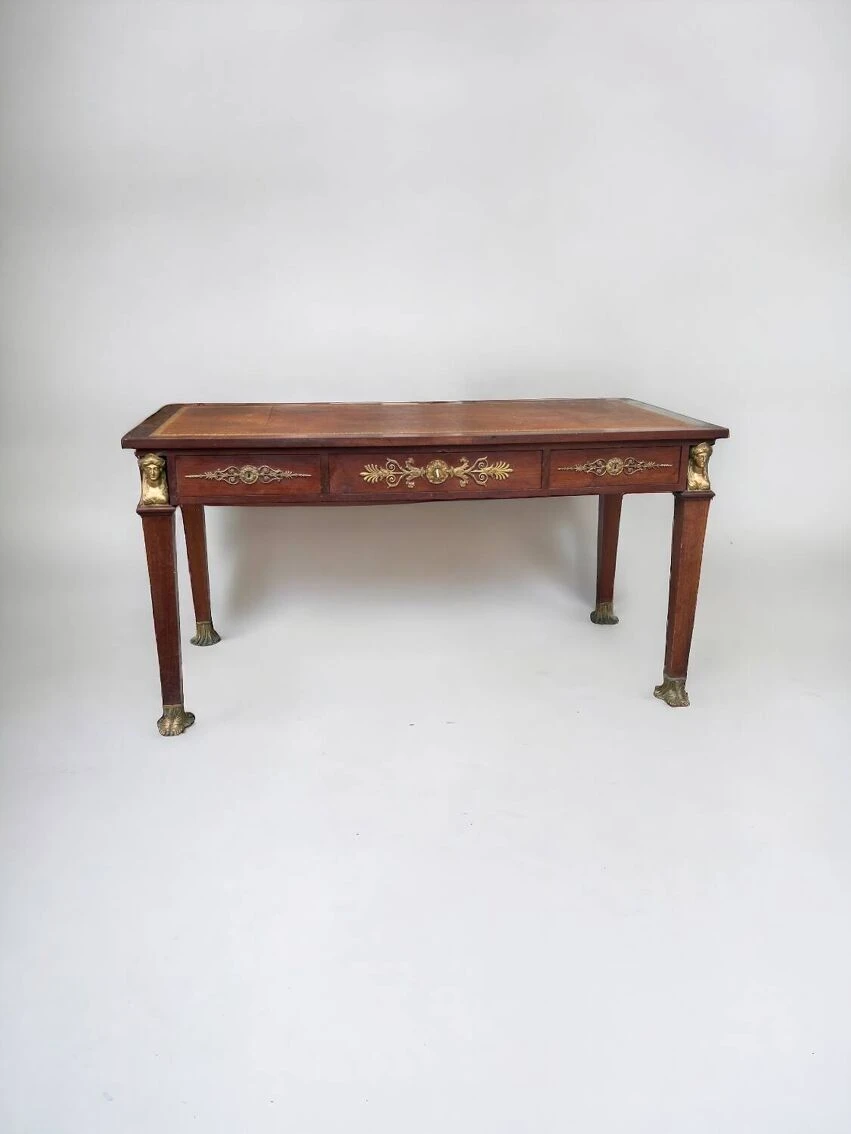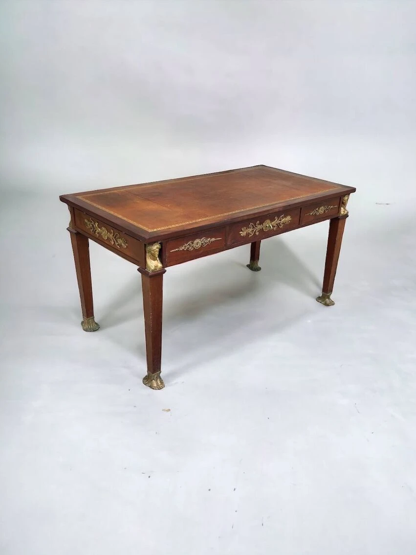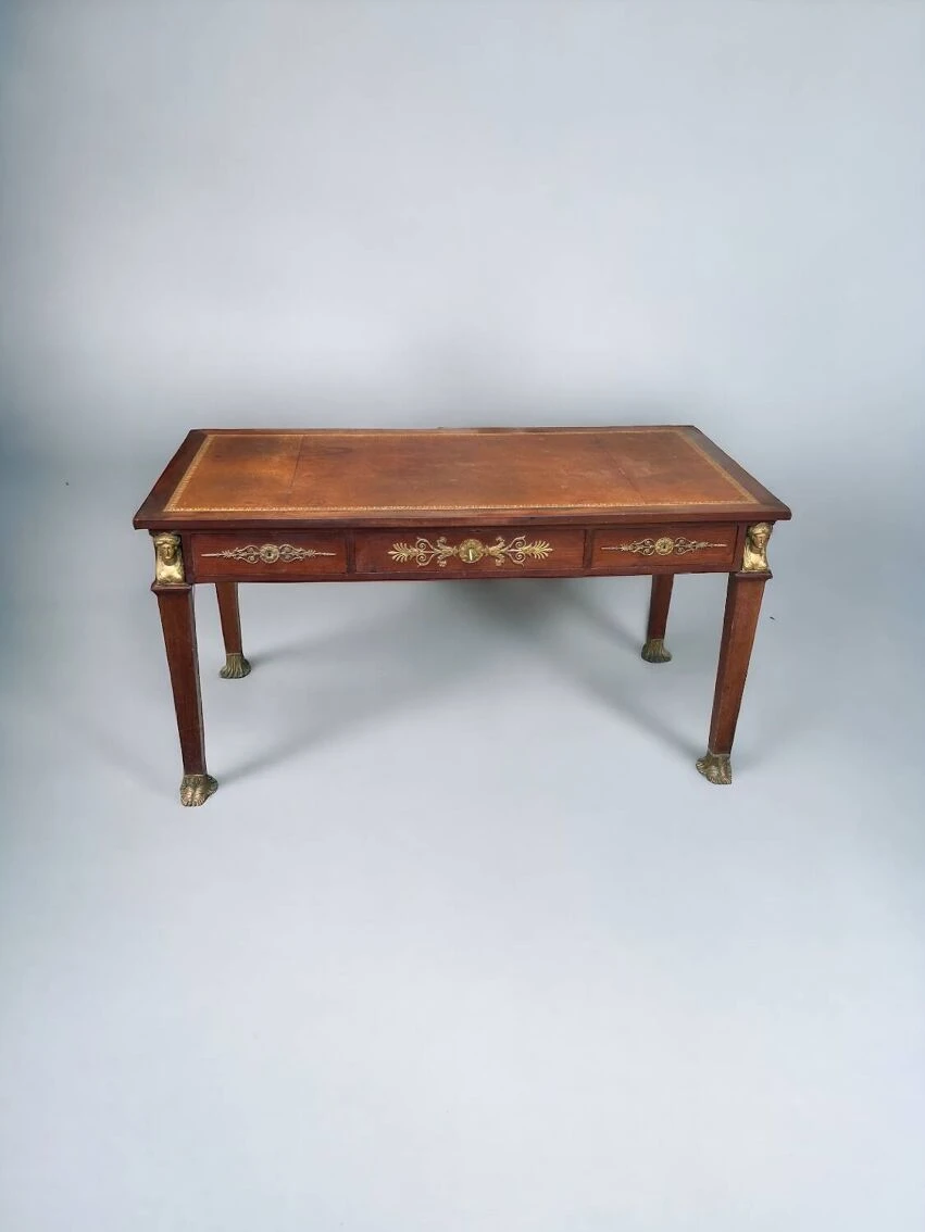 Beautiful flat mahogany desk with pulls from the famous maison du faubourg saint antoine “mercier frères a paris”, empire return from egypt style opening with three drawers, beautiful gilded bronze trim, double sided.
