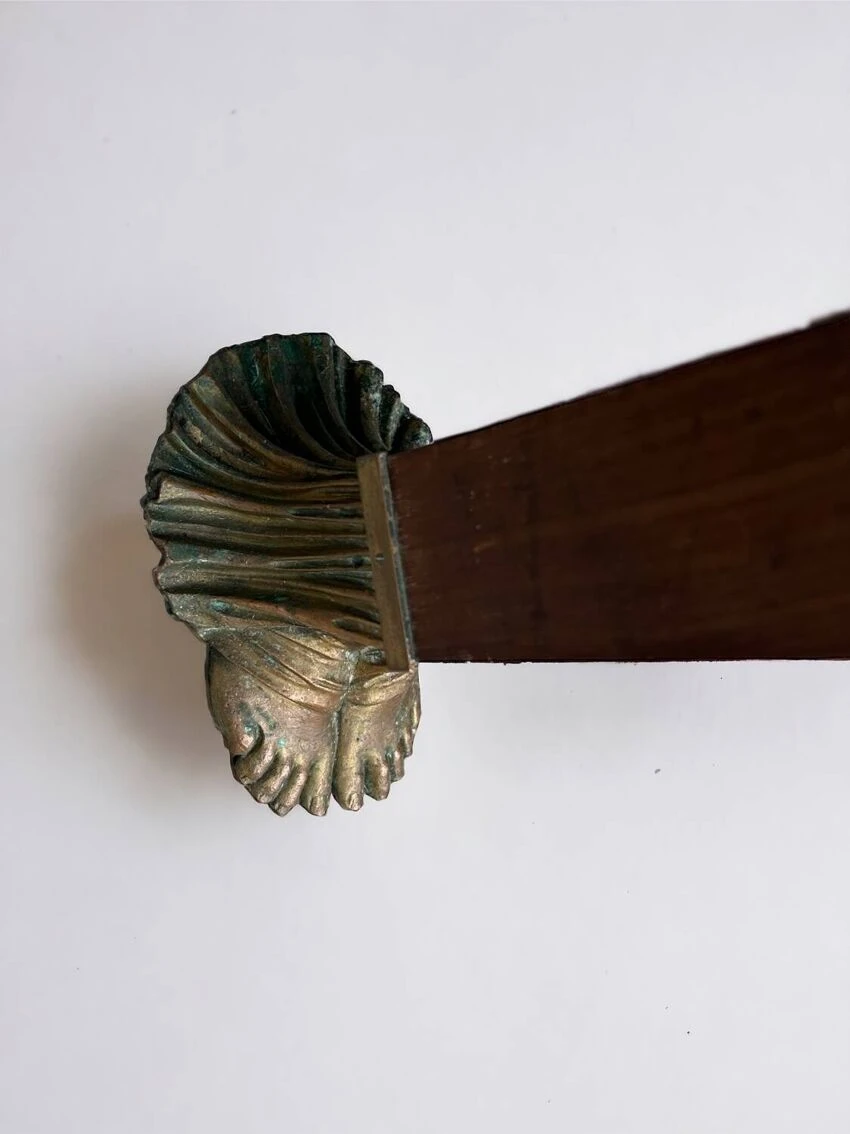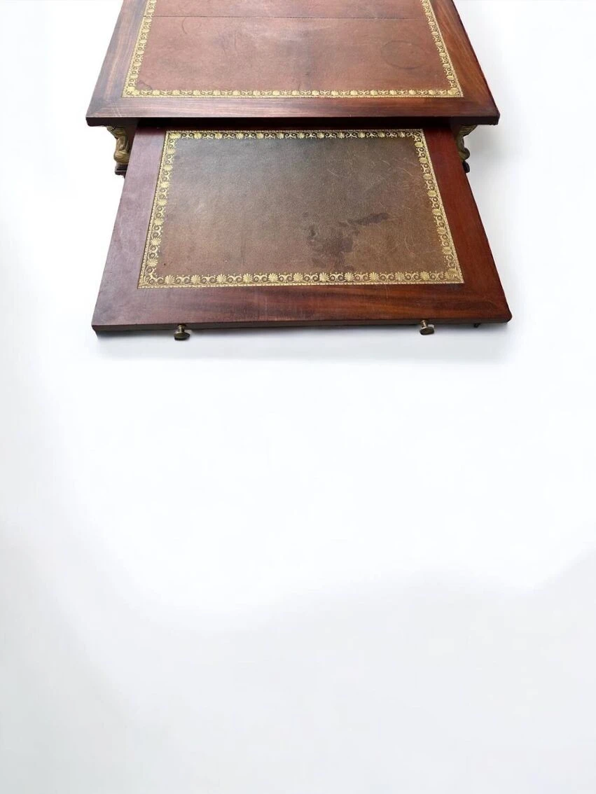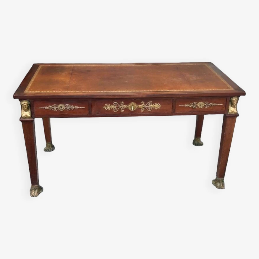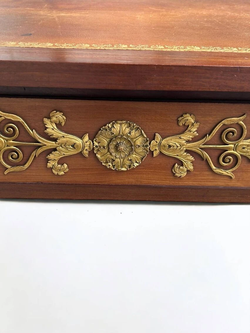 Beautiful flat mahogany desk with pulls from the famous maison du faubourg saint antoine “mercier frères a paris”, empire return from egypt style opening with three drawers, beautiful gilded bronze trim, double sided.