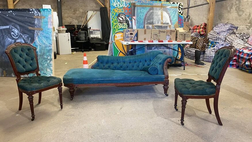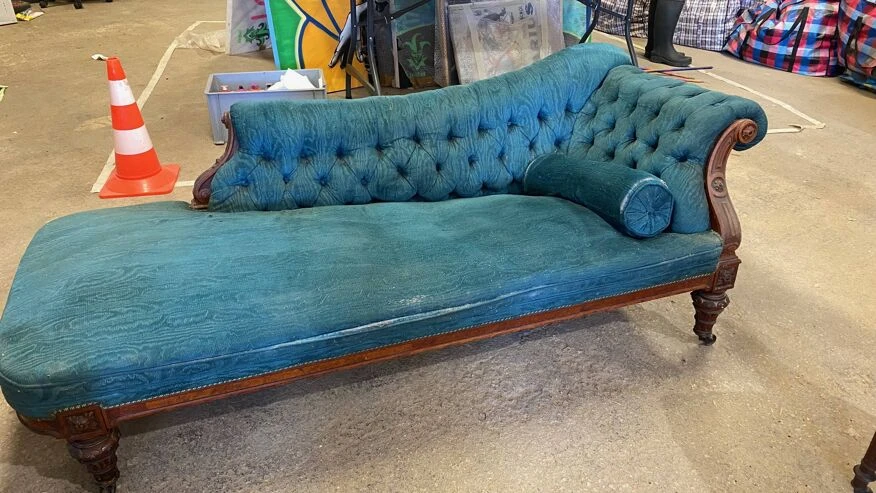 Chaise longue sofa with these 2 blue velvet colored chairs in good condition.