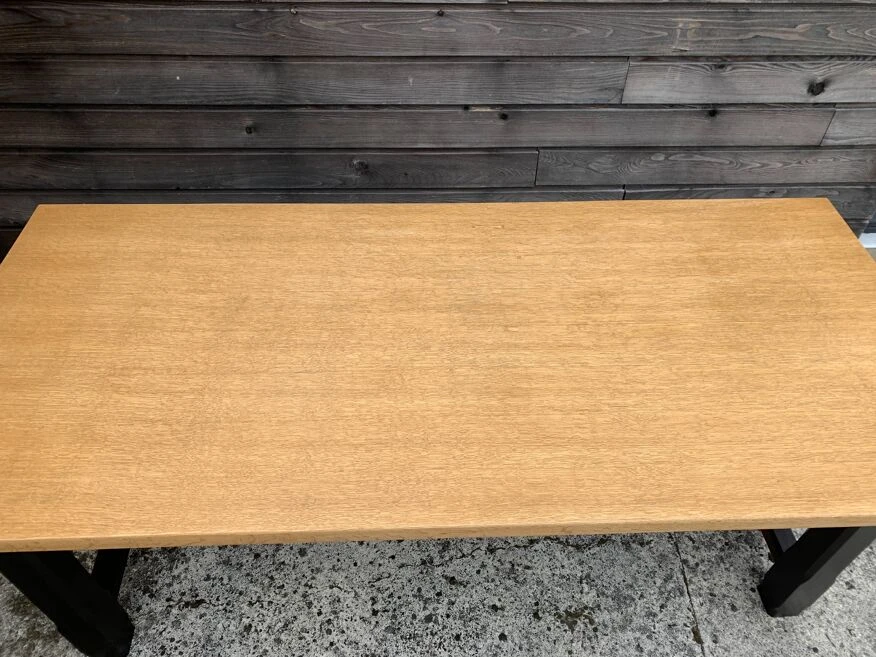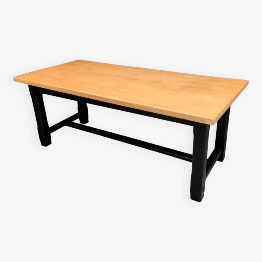 Solid oak farm table with matte black legs.