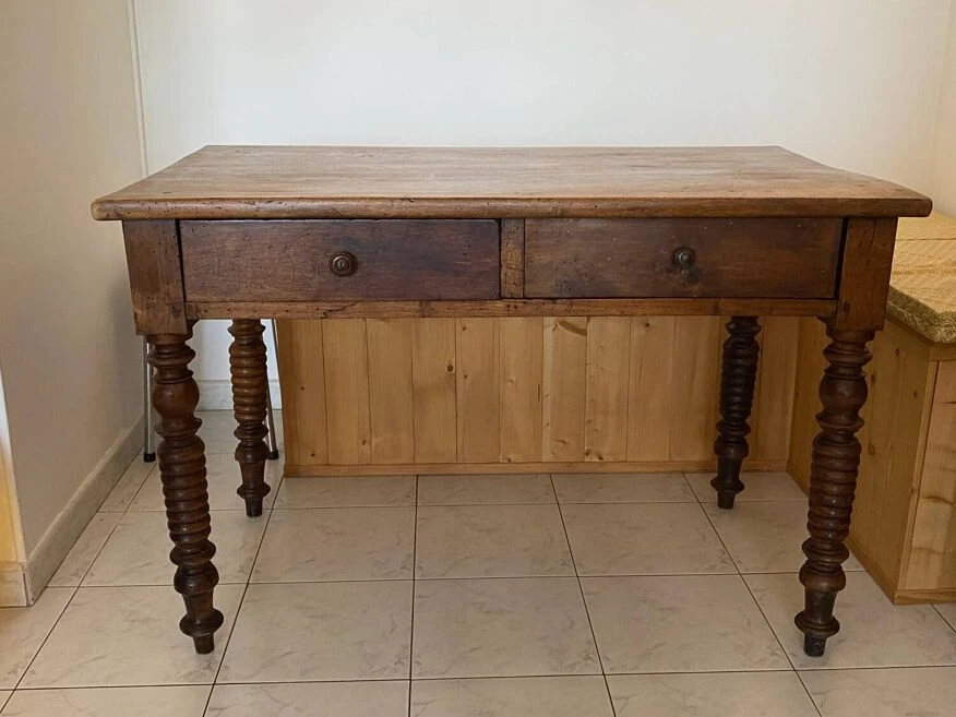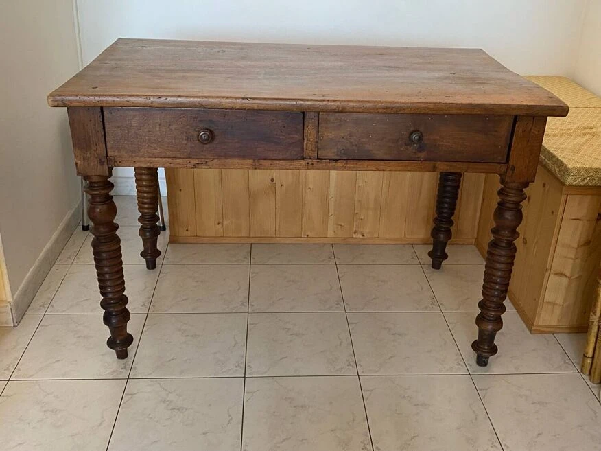 It seems to me to be oak. 2 drawers which are almost the width of the table.