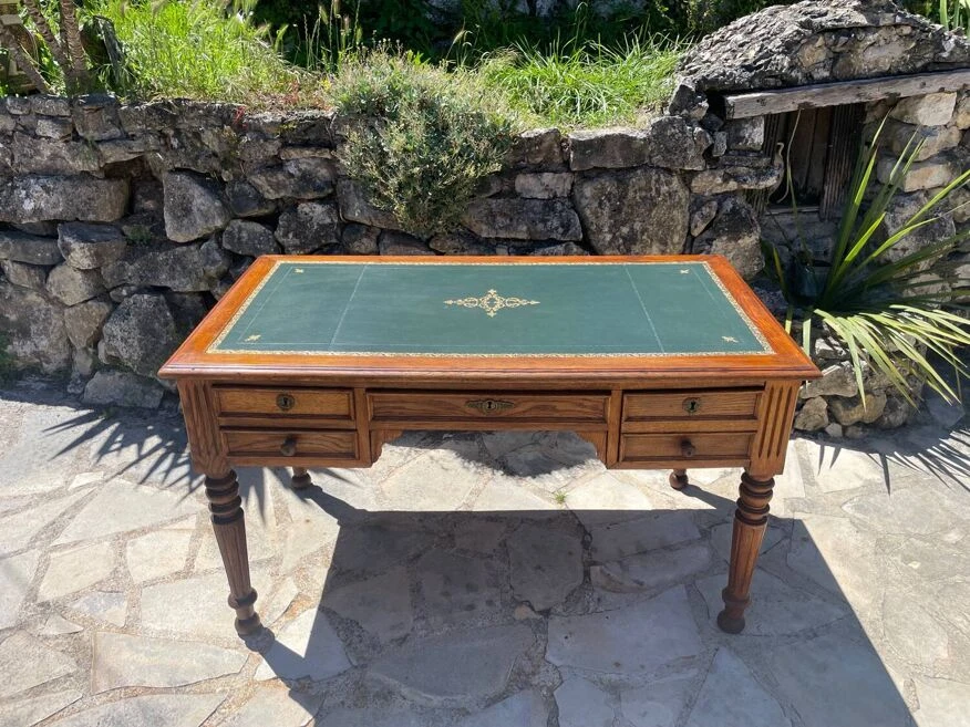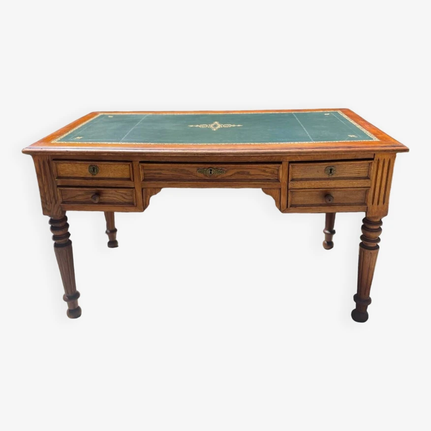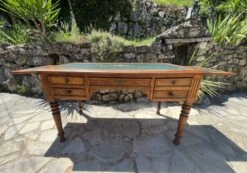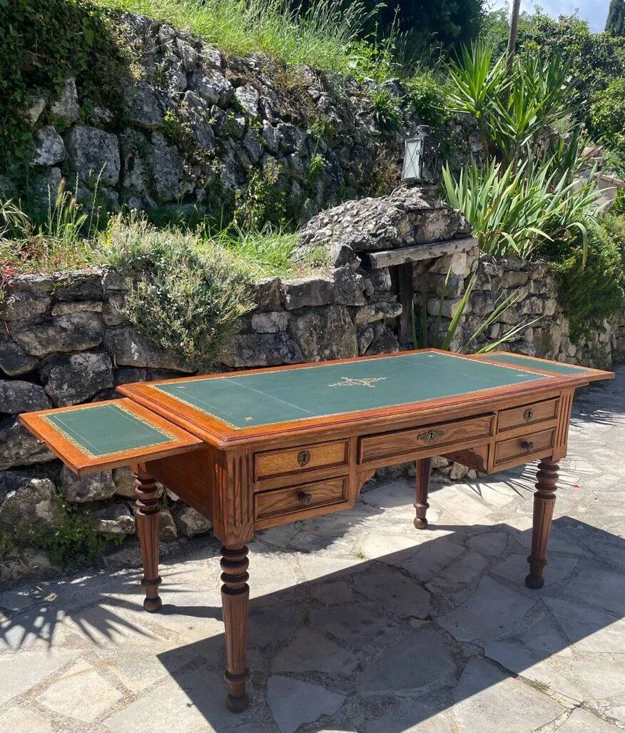 This beautiful middle desk has 2 side writing tablets also covered in leather (with brass pulls).