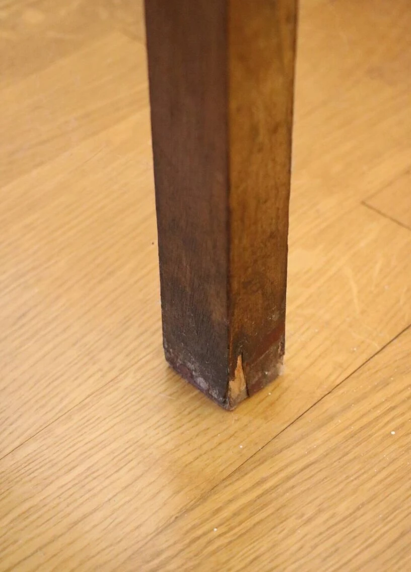 Some chips in the veneer in certain places (see photos) and the bars on each side are missing to hang towels or clothes, hence its low price.