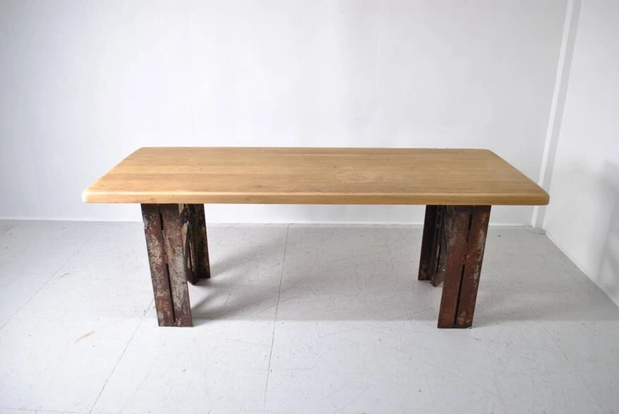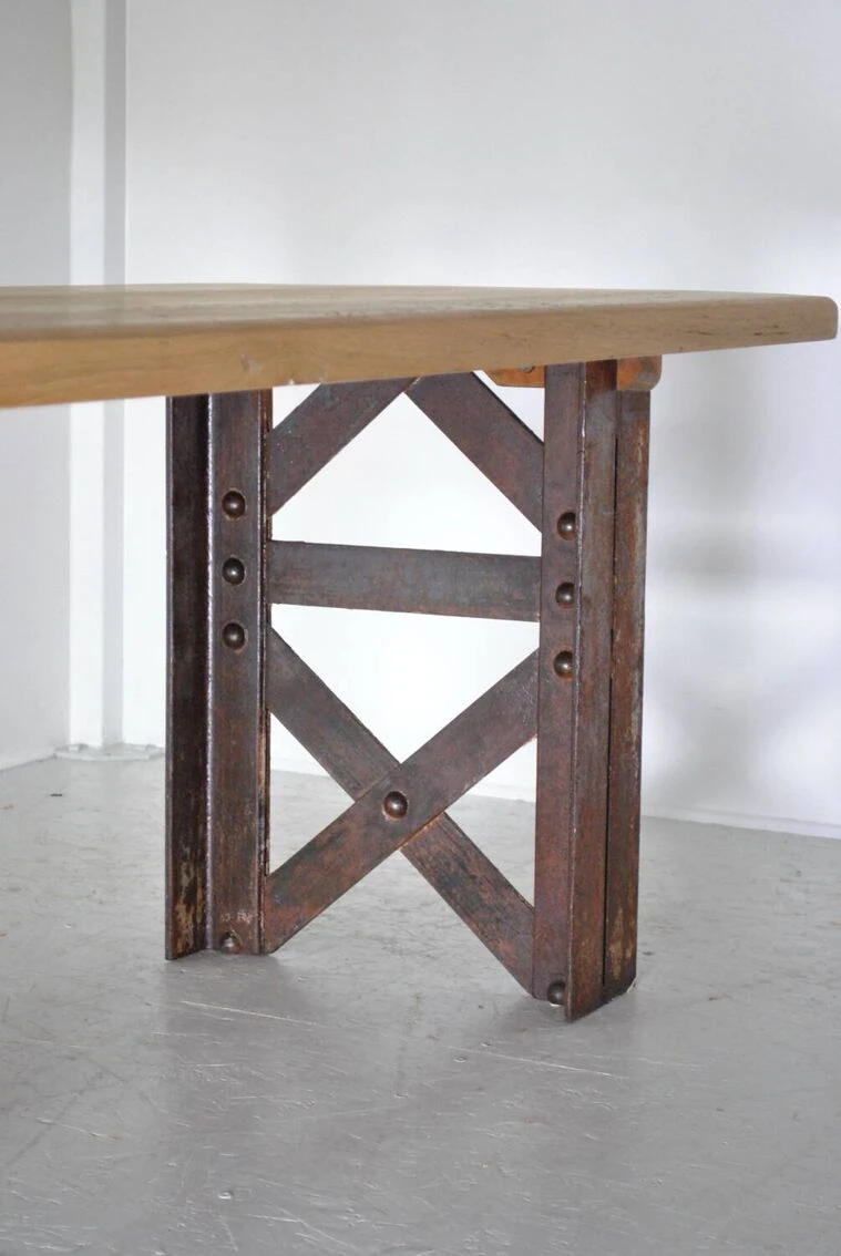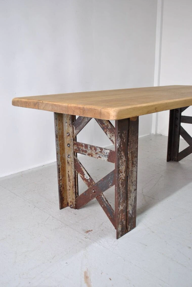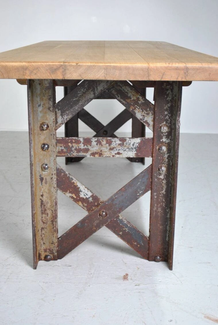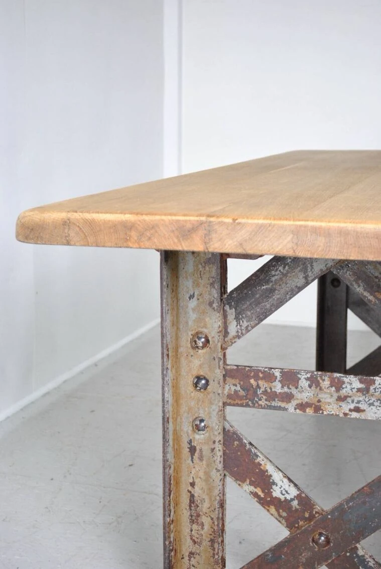 Industrial table with eiffel foot. Top in sanded and waxed old oak. Authentic riveted Eiffel foot 1930. Removable for transport. Be careful 200 kg. Height 75 cm. Width 197 cm. Depth 80 cm.