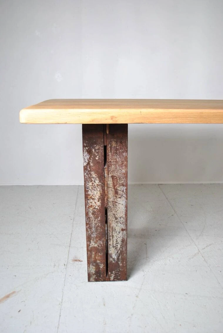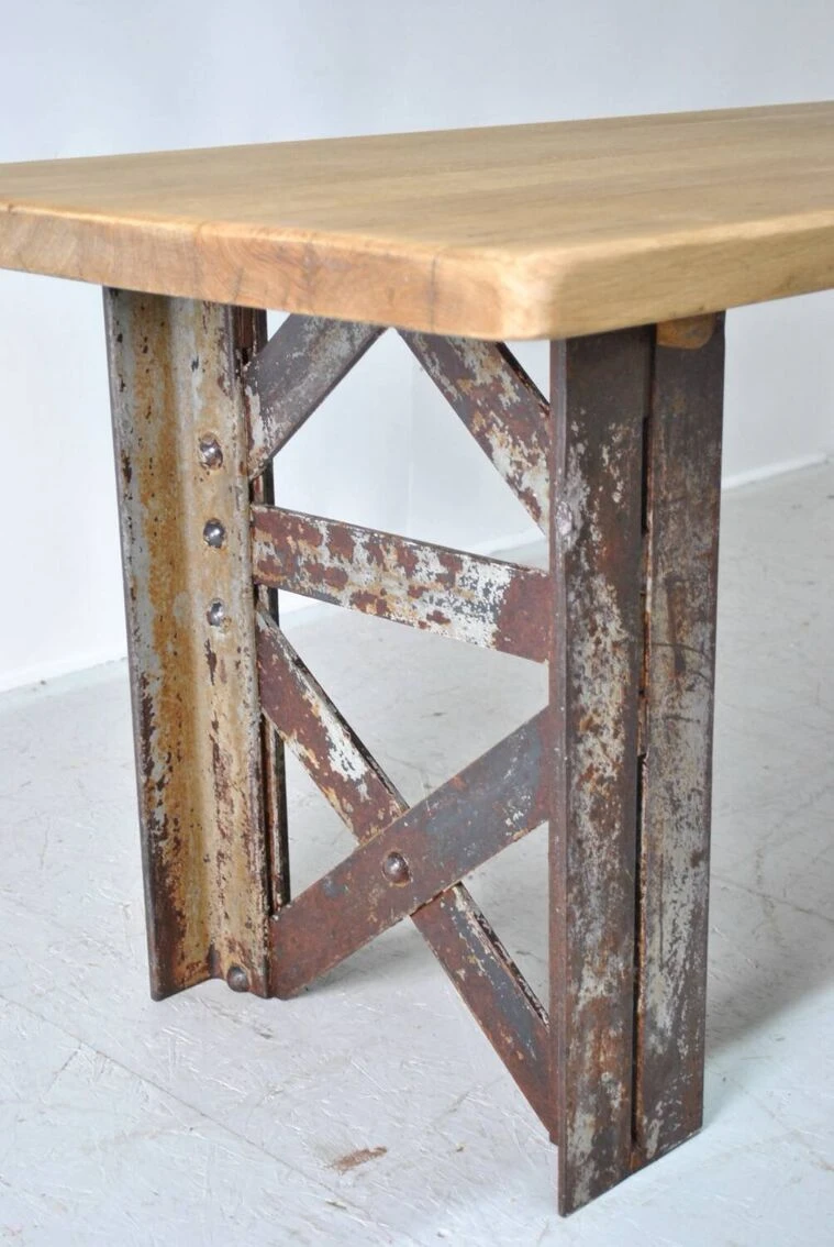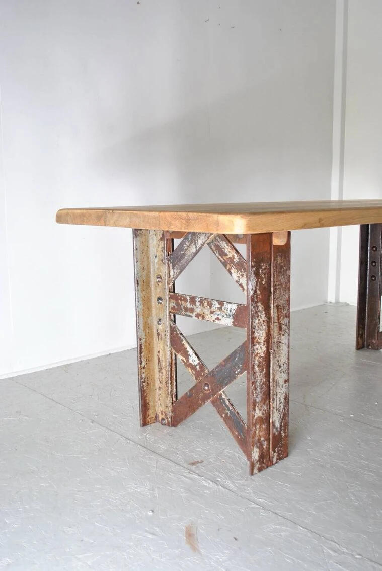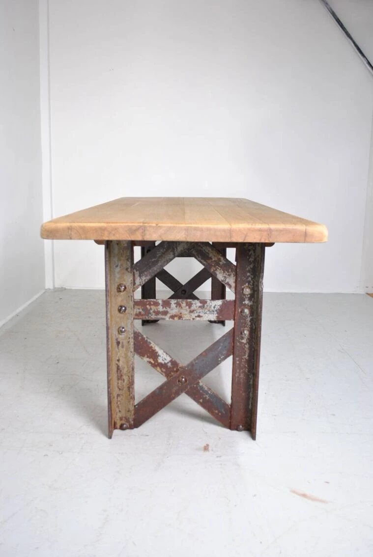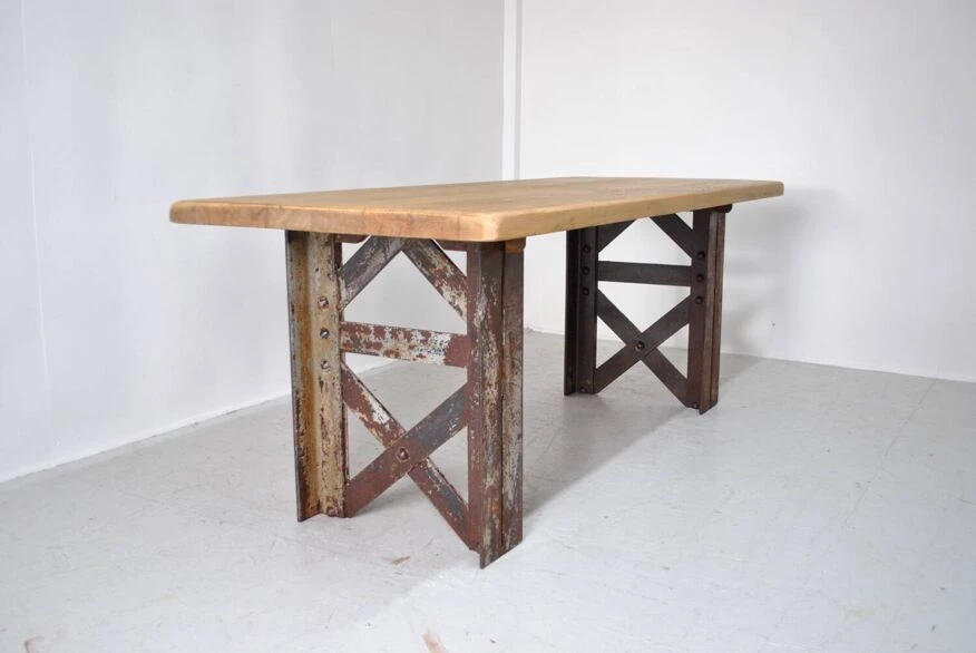 Industrial table with eiffel foot. Top in sanded and waxed old oak. Authentic riveted Eiffel foot 1930. Removable for transport. Be careful 200 kg. Height 75 cm. Width 197 cm. Depth 80 cm.