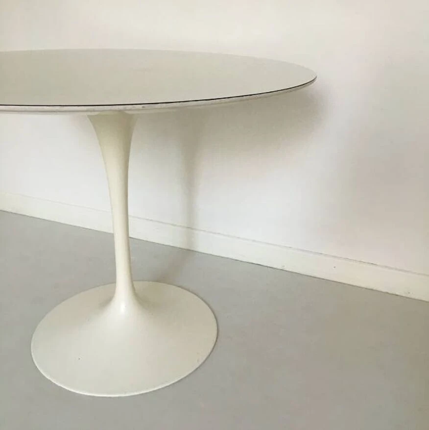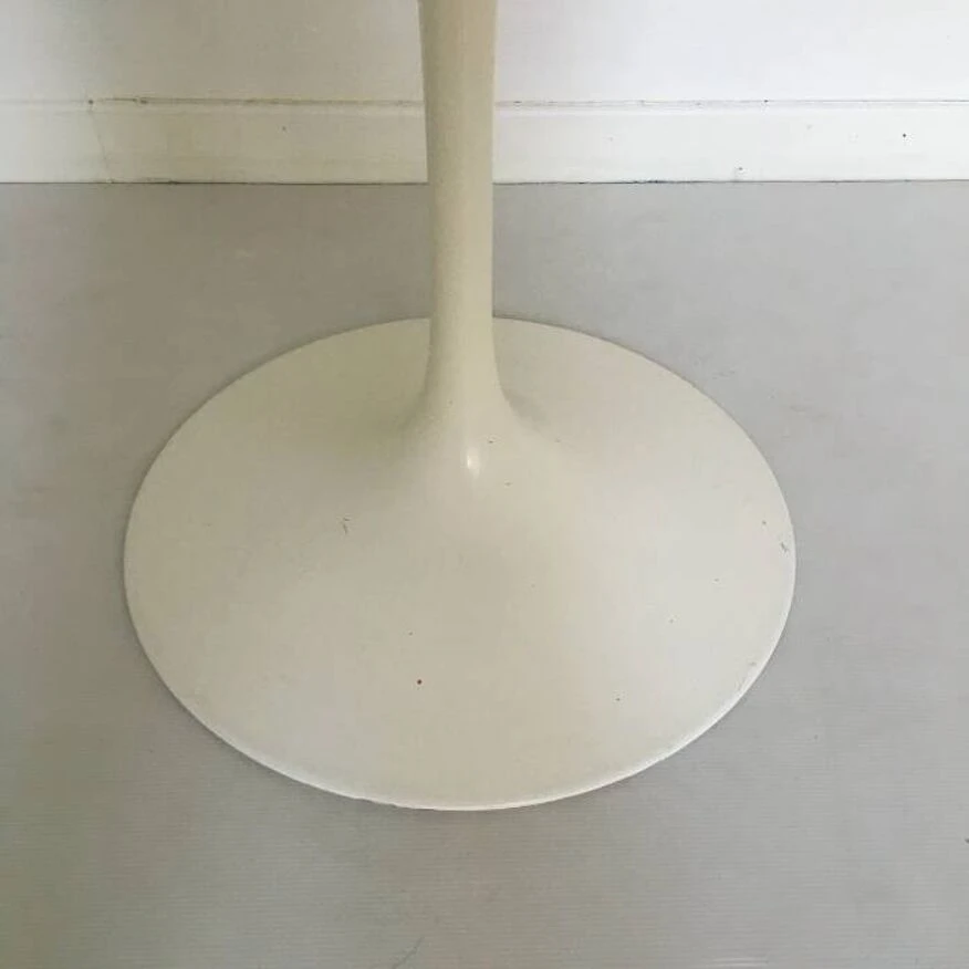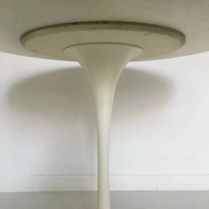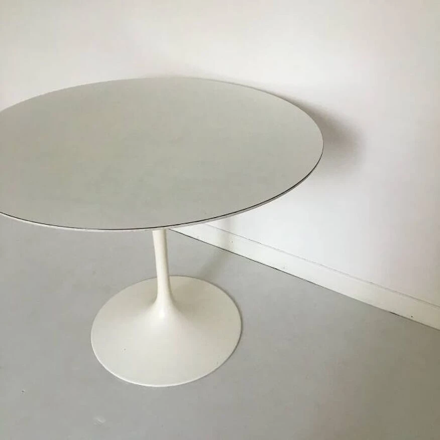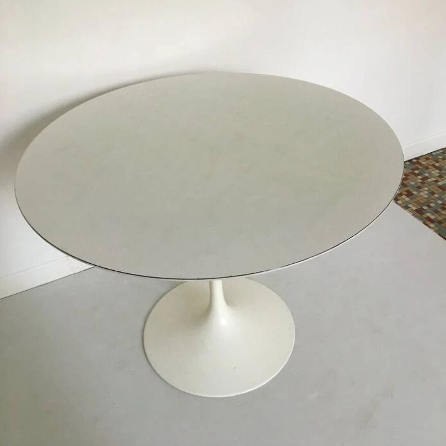 Round dining table with vintage tulip knoll foot stamped under the foot. Tulip foot in white metal. Round white melamine top. 1970s. Dimensions D 91 x H 75 cm.