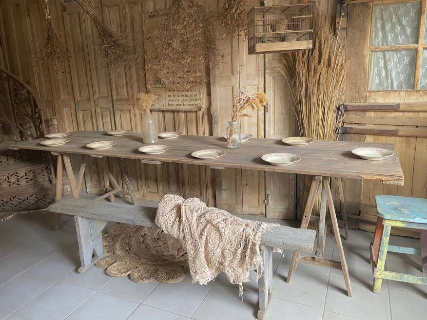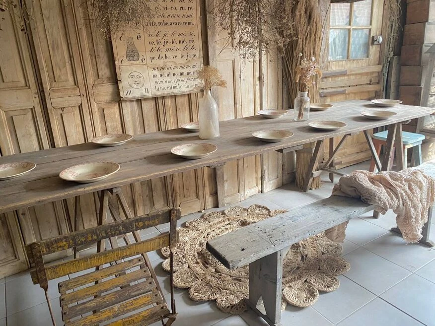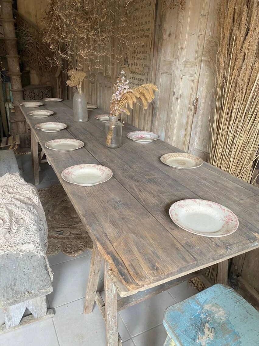 Large tavern table 300 cm long which can accommodate 12 guests the trestles are removable to facilitate their position under the top at your convenience a small gap at the end of the top which gives it even more authenticity… l300/p80.5/ h77.