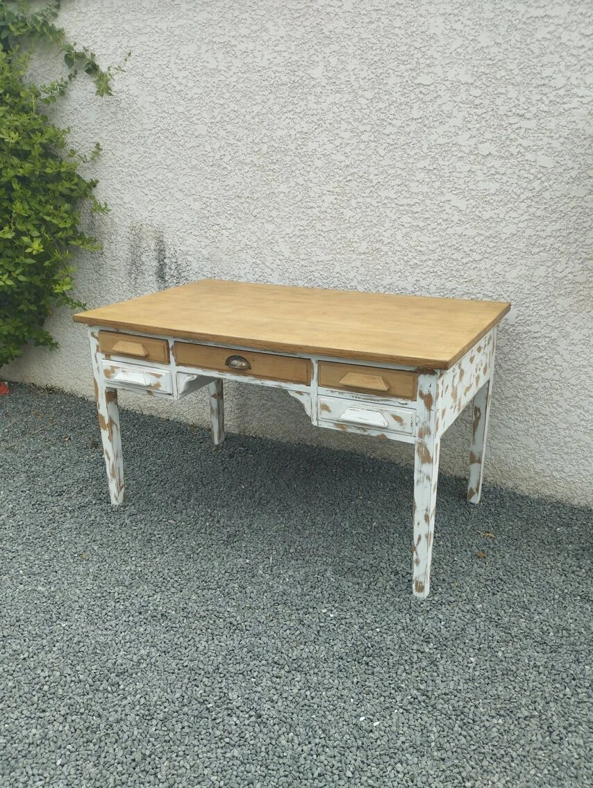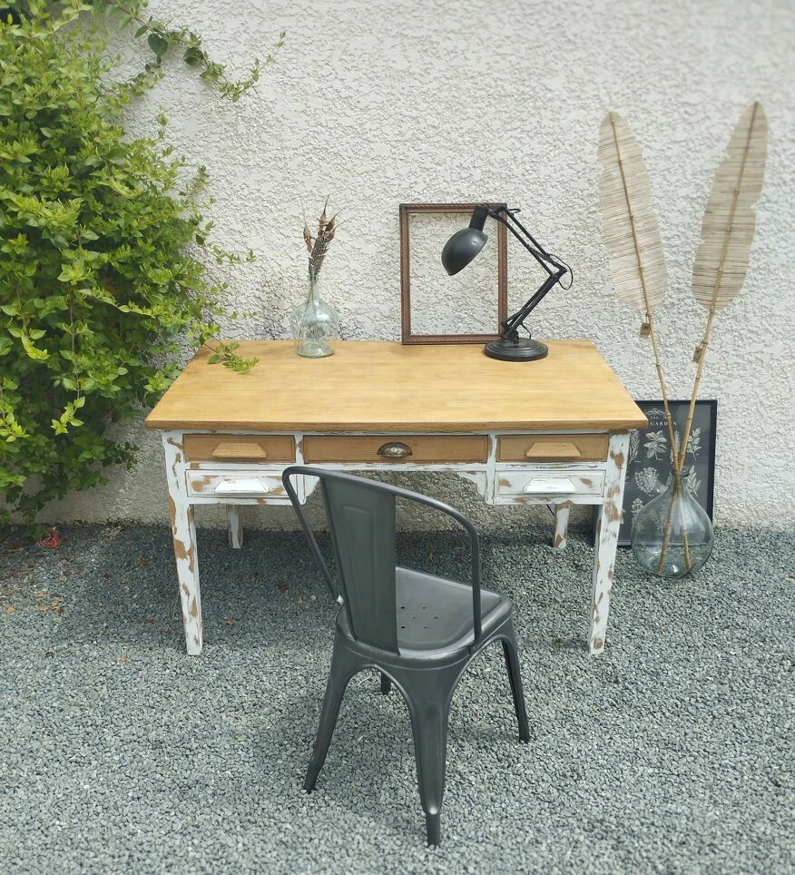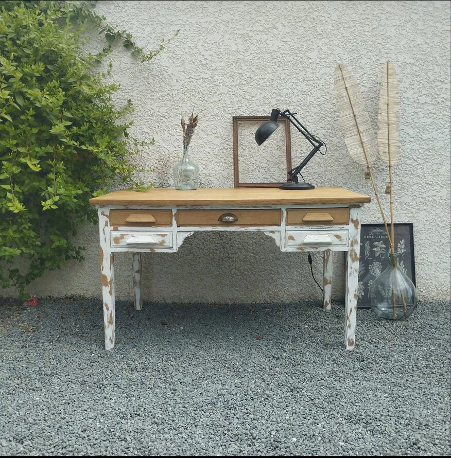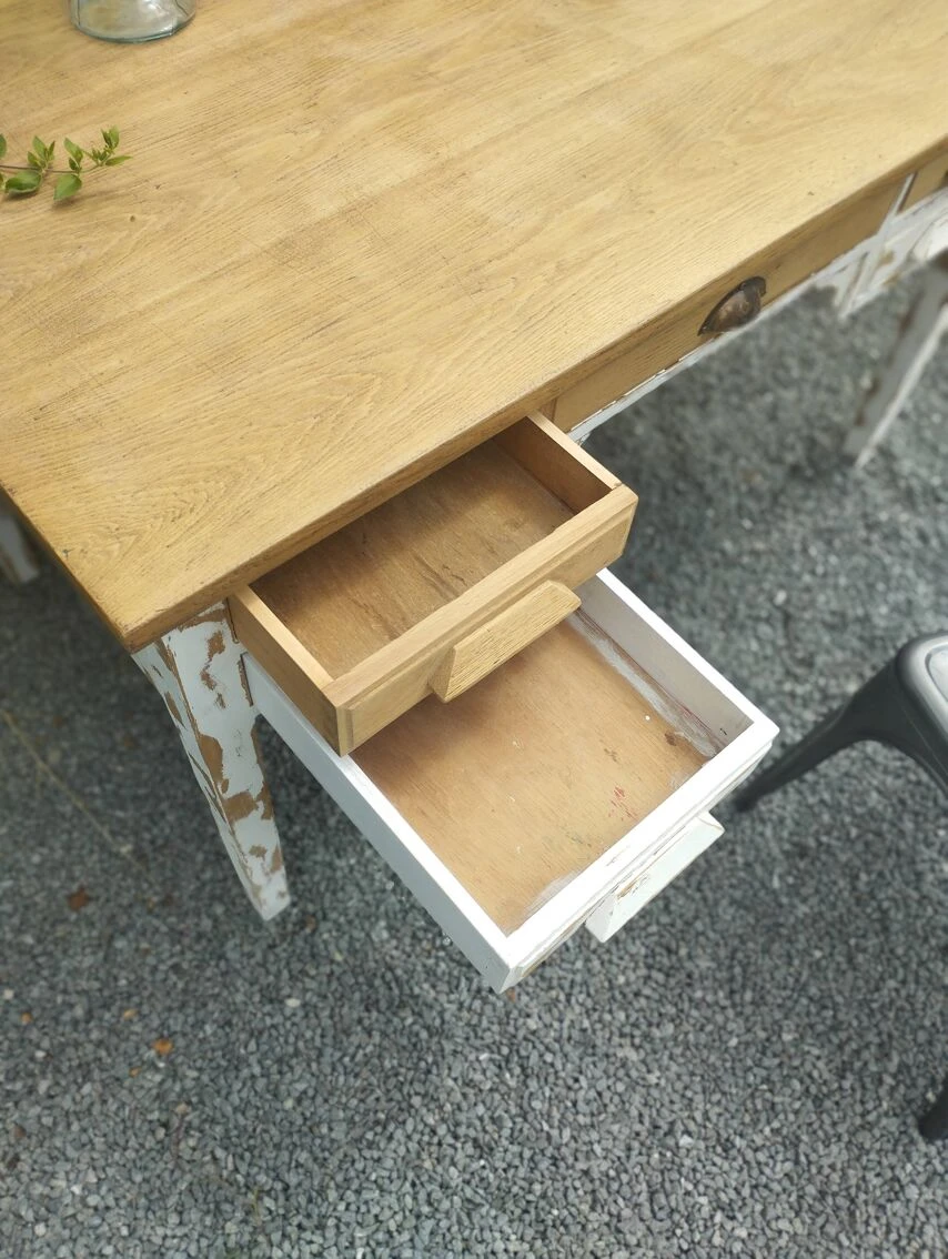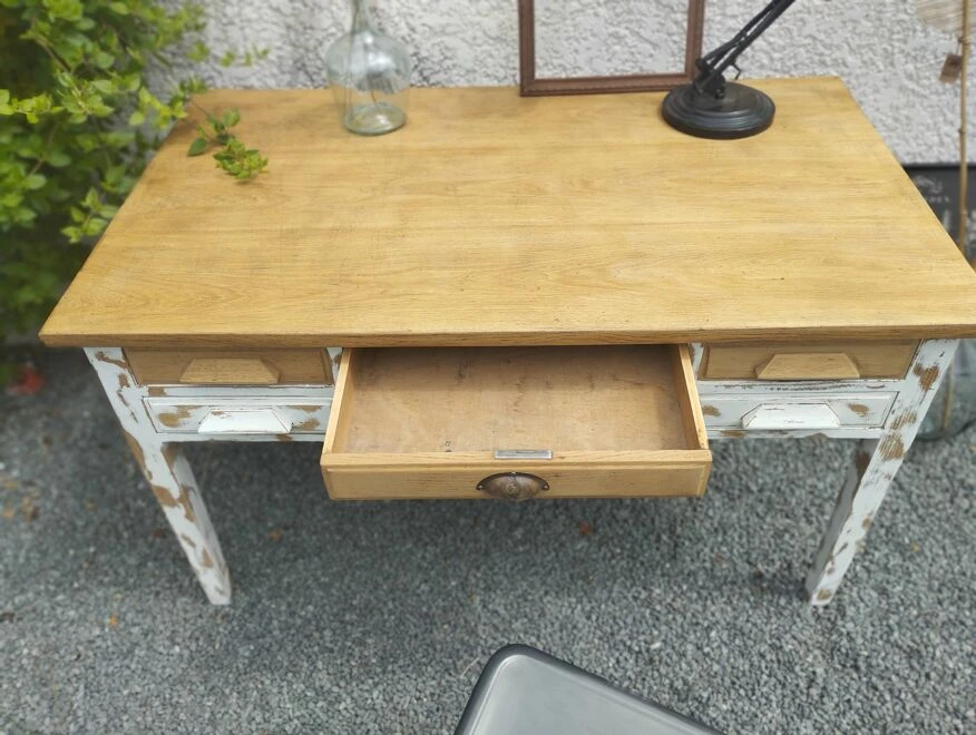 The top was sanded to regain its original light color, then re-varnished to be protected (colorless satin color to maintain the natural appearance).