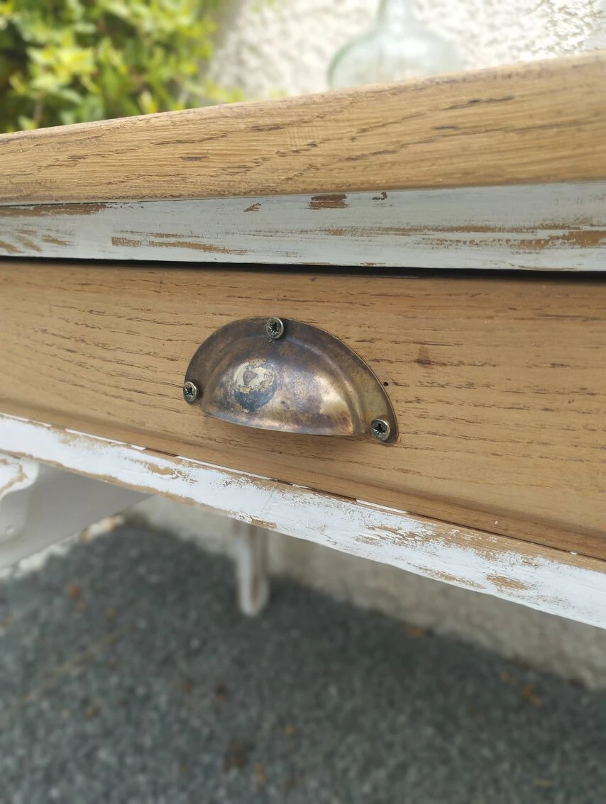 The large central drawer has a patinated metal shell handle with copper highlights.