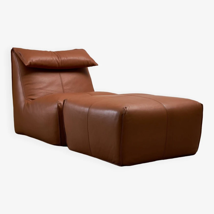 Robust, coffee-brown sponge and leather armchair with folding backrest and with a footrest. The Le Bambole lounge chair by Mario Bellini provides a feeling of deep comfort and relaxation. It was designed for B&B Italia in 1972. Available in a very nice condition.