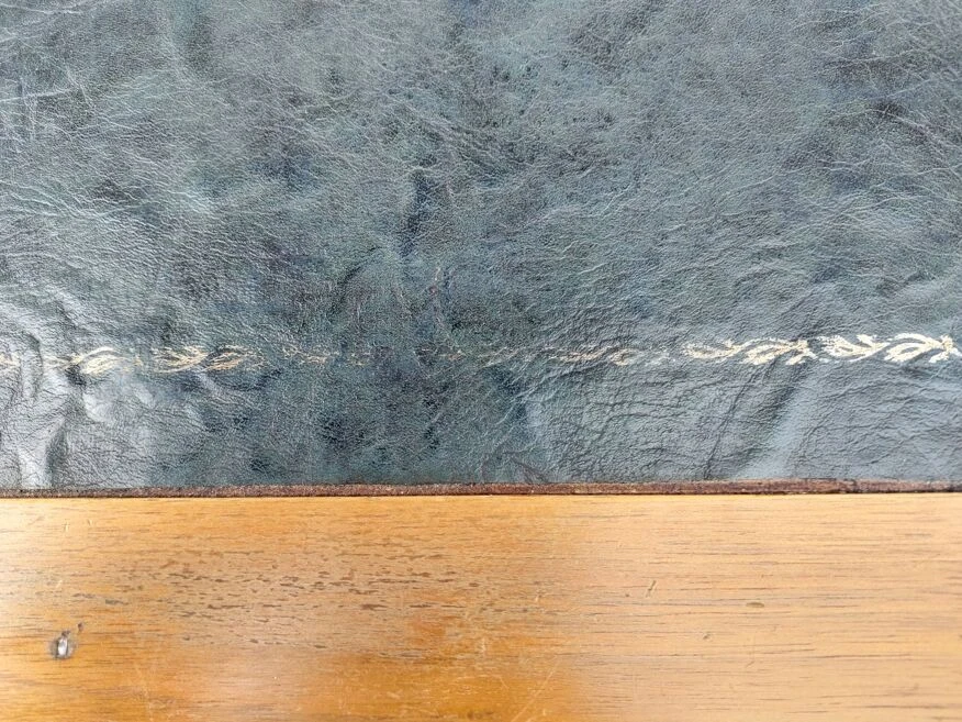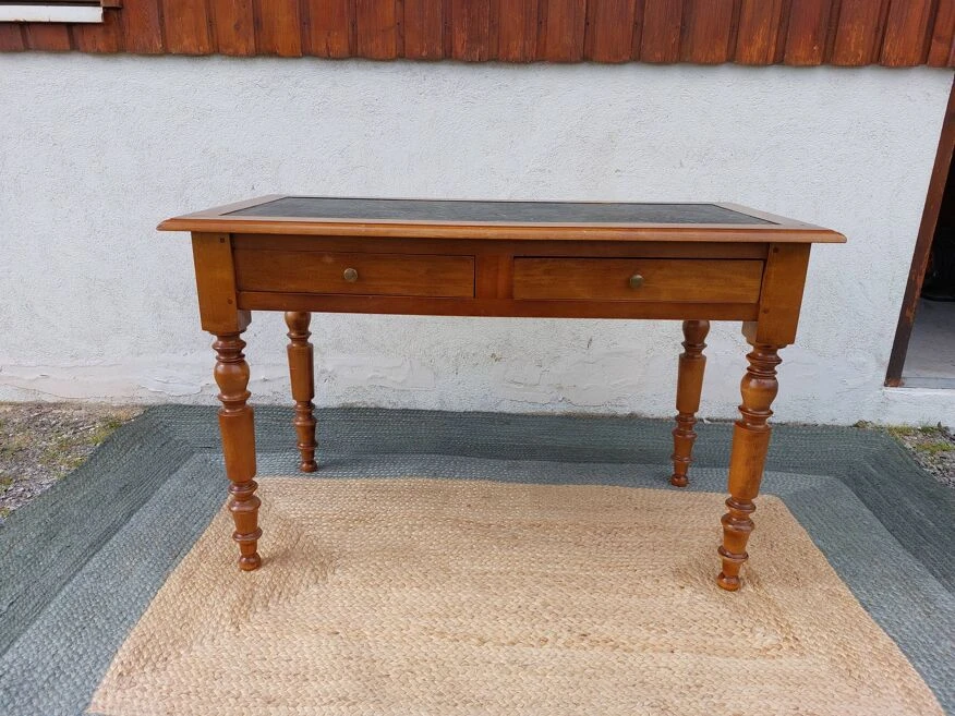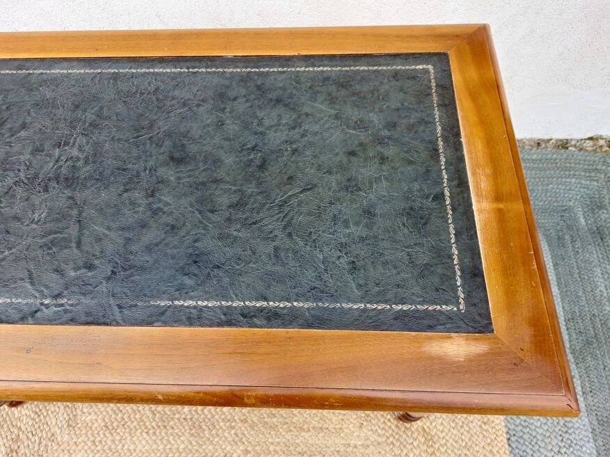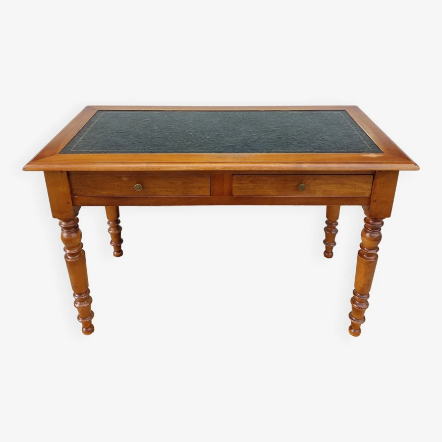 Wooden desk with 2 extensions: ideal for teleworking, for example, small footprint in your room but large enough to open a few files. The top is in dark green leather with a gold frieze and turned wood legs. Used desk, nevertheless in very good condition. See, for signs of use, all the photos which are an integral part of the description. The height of the desk is 76cm, under the drawers (empty space for the legs) there is 58.5cm of height. Each extension measures 33.5cm wide by 42.5cm deep. The total width of the desk with extensions is 188cm (121cm without extensions). Possibility of choosing a chair or an armchair from my advertisements.
