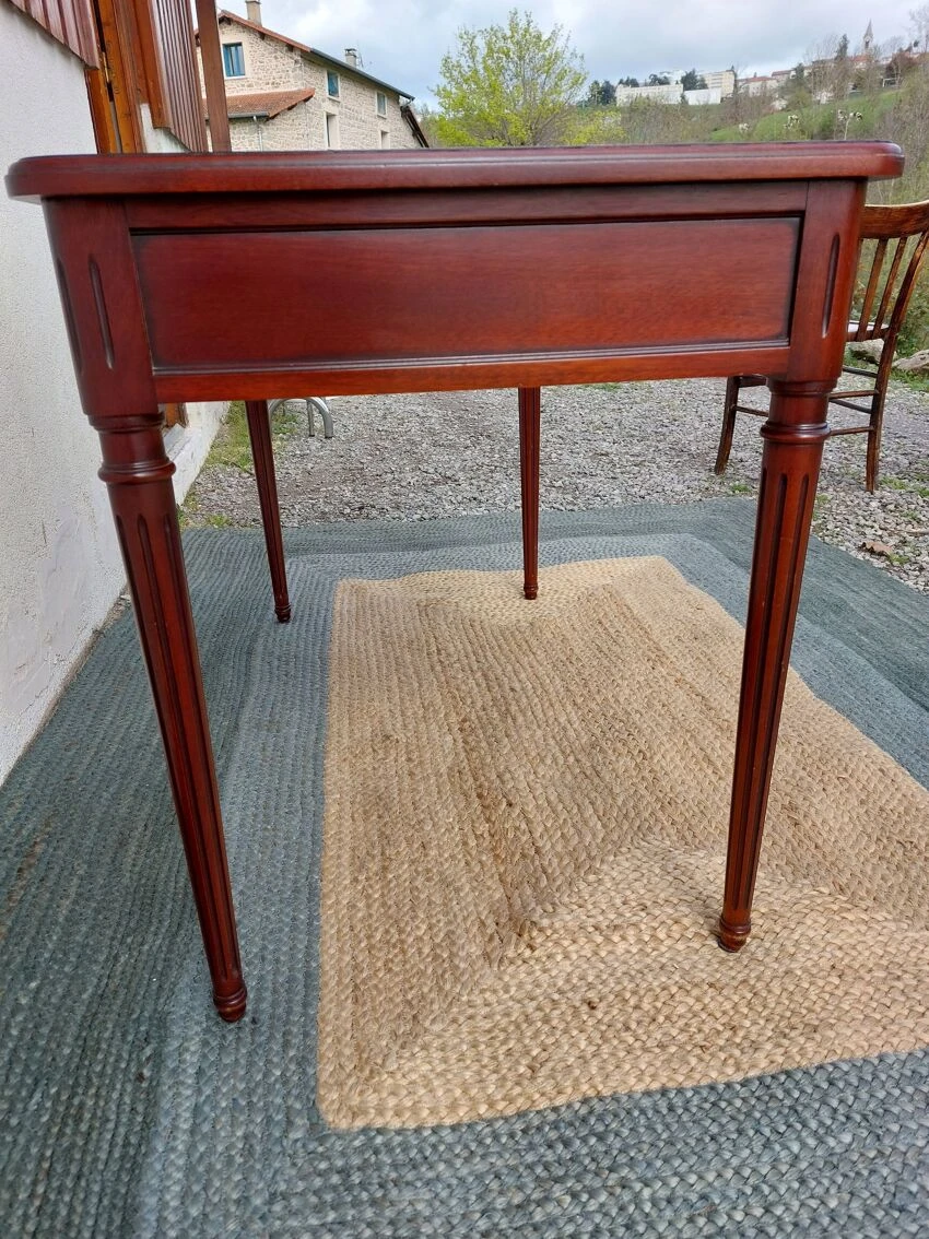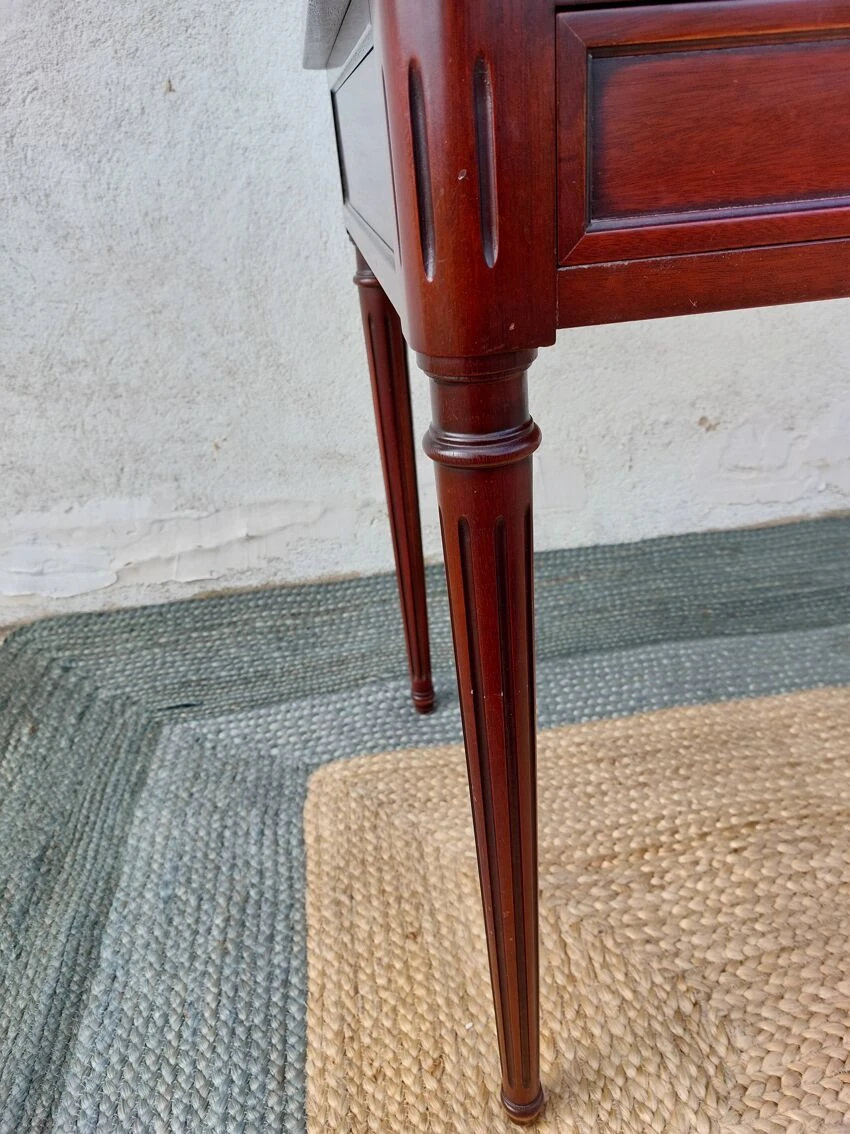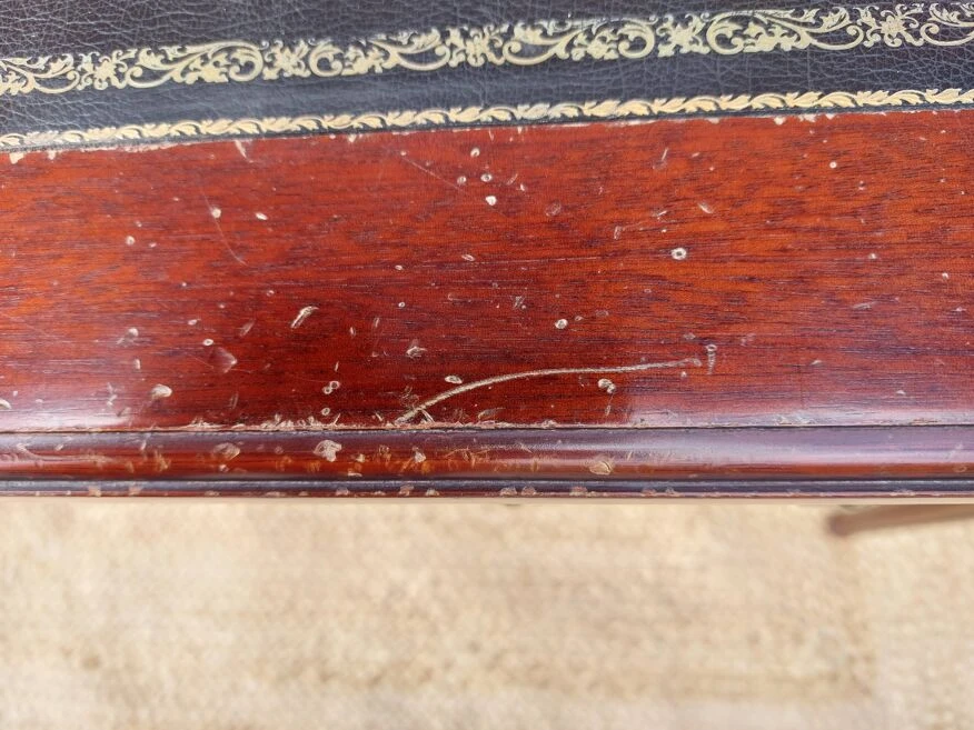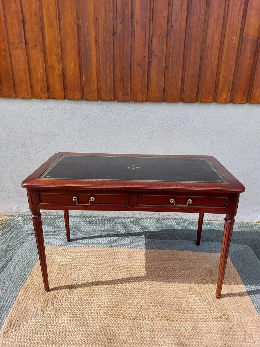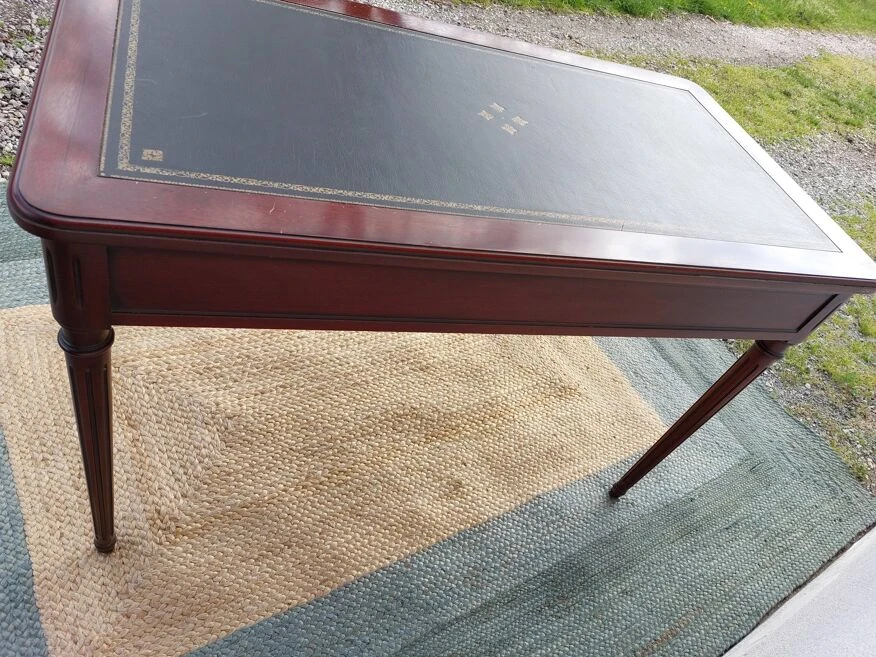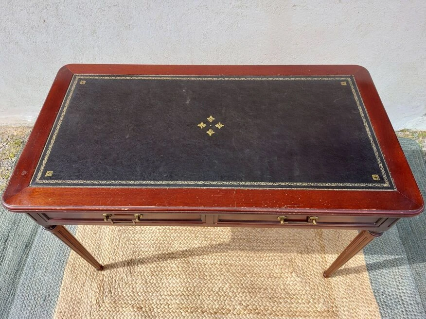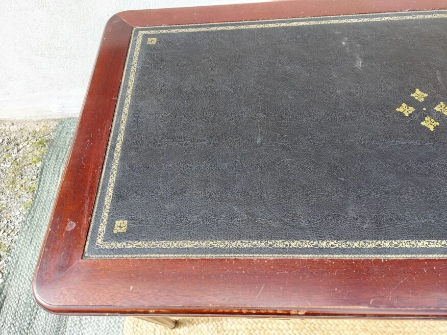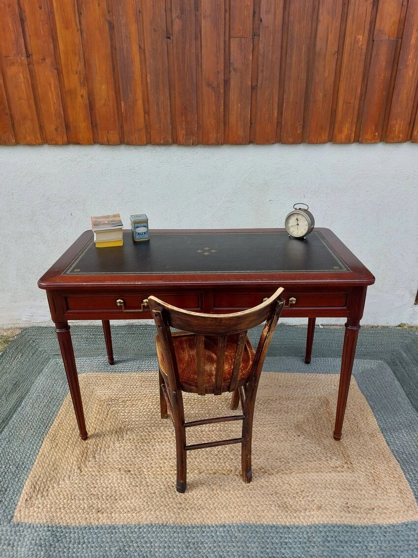 Desk with dark green leather top with gold edging. Nice original feet and handles. Presence of 2 drawers. Marks of use are visible in the numerous photos which form an integral part of the description. The height for the seat (empty part under the drawers) is 60cm. Possibility of choosing a chair or an armchair from my advertisements.