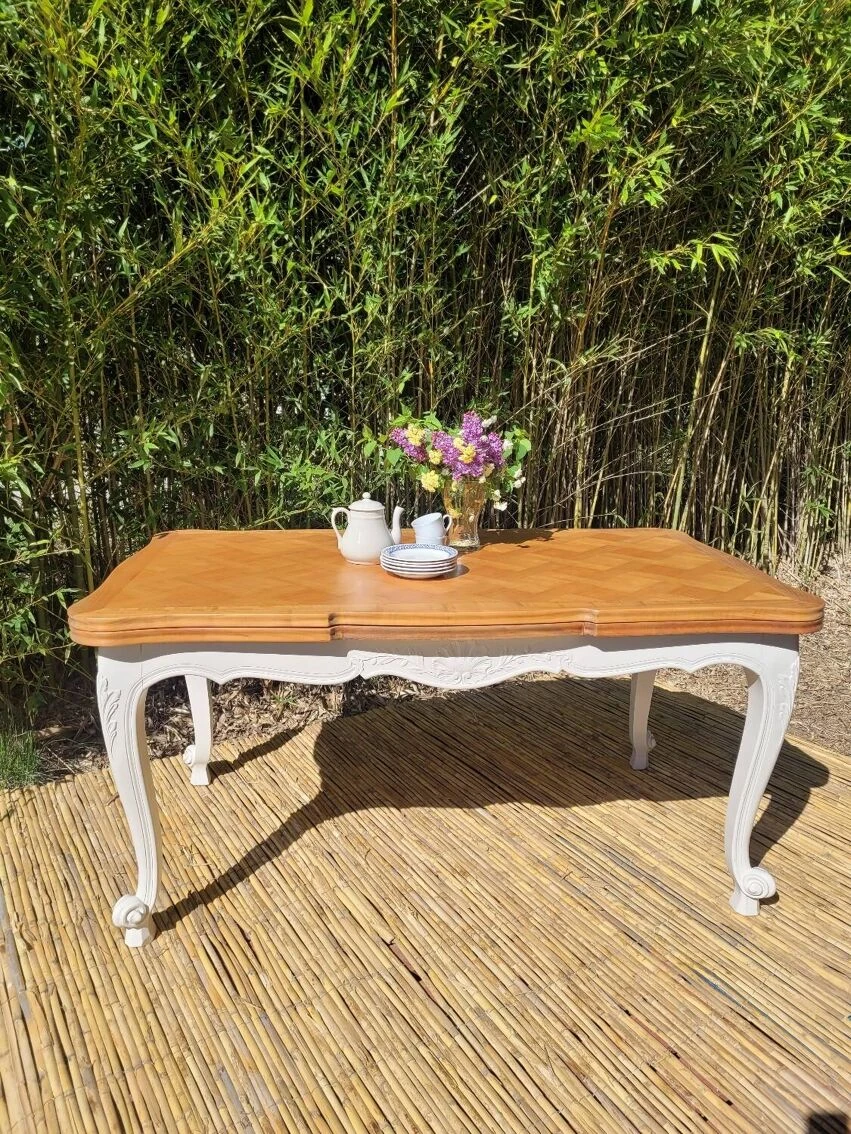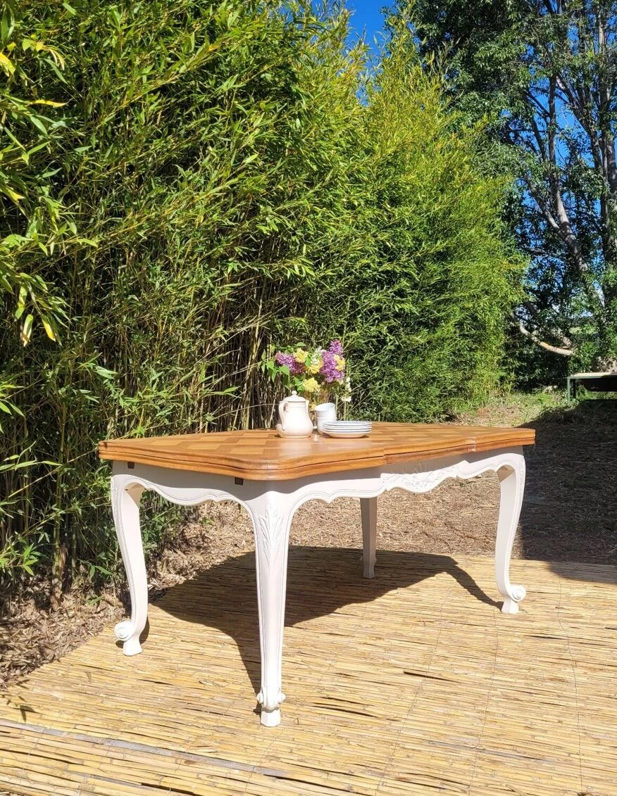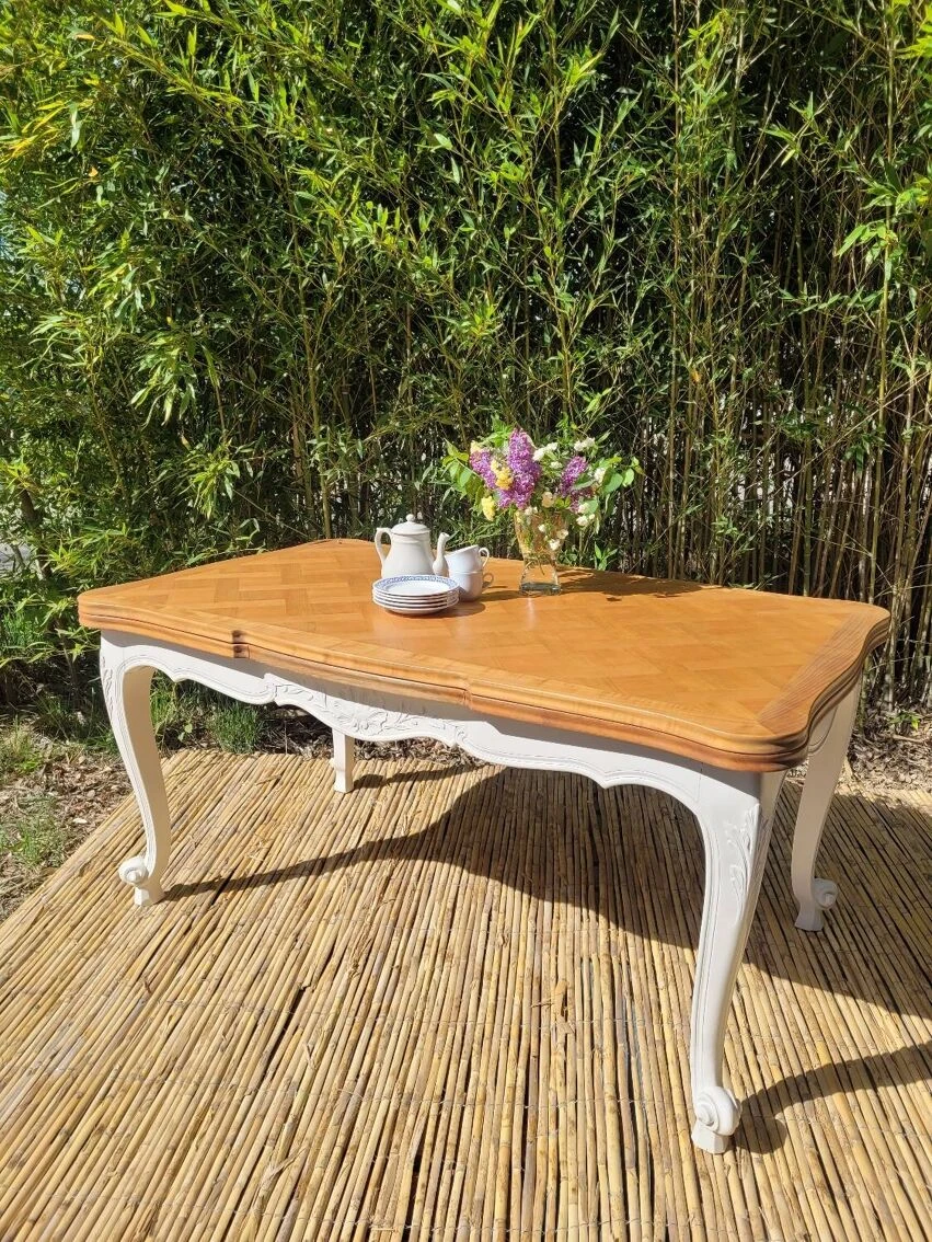 Large Provençal dining table with its 2 extensions, recently renovated. It measures 159cm long and up to 267cm with its 54cm extensions to accommodate lots of people at the table. 📐dimensions: H 78cm. L 159.5cm. L 94.5cm. Light scratches on the board. If you have any questions do not hesitate to write to me. See you soon, Julie.