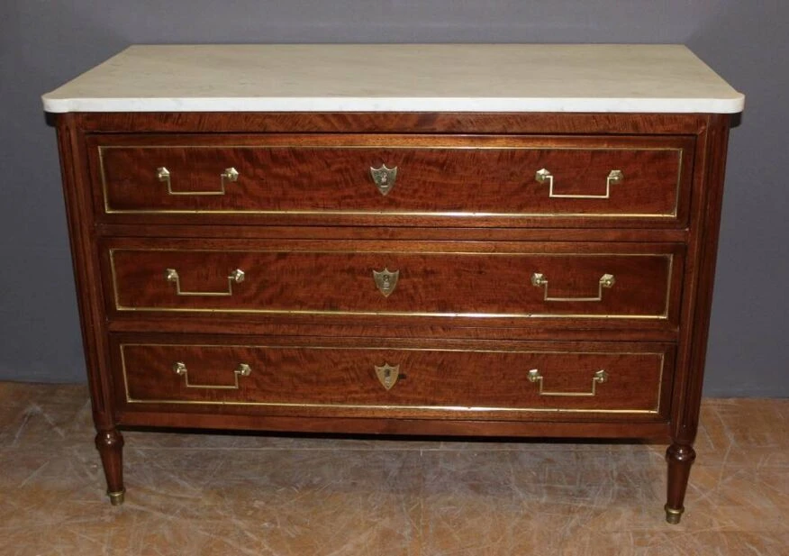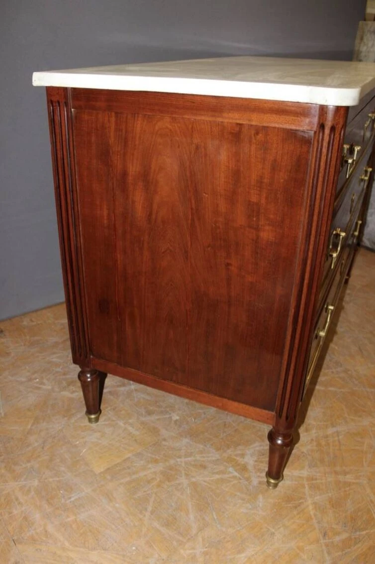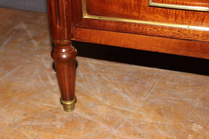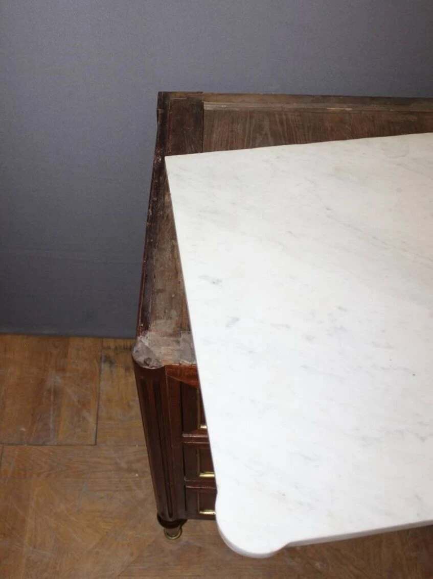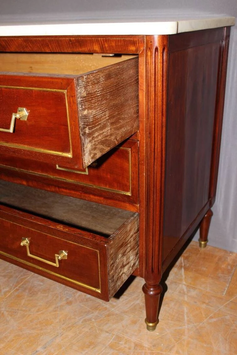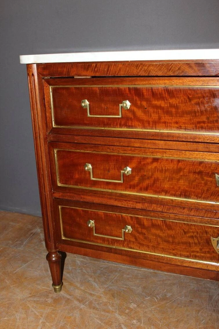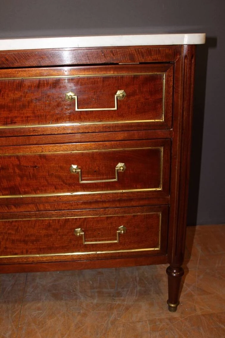 Louis XVI style chest of drawers from the early 19th century in mahogany and brass rods, it opens with three drawers, white marble top, varnished finish, all in very good condition.
