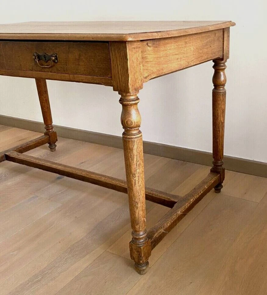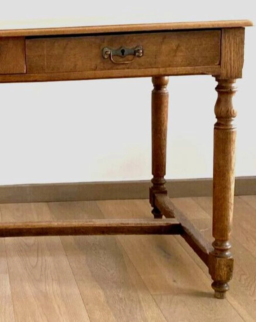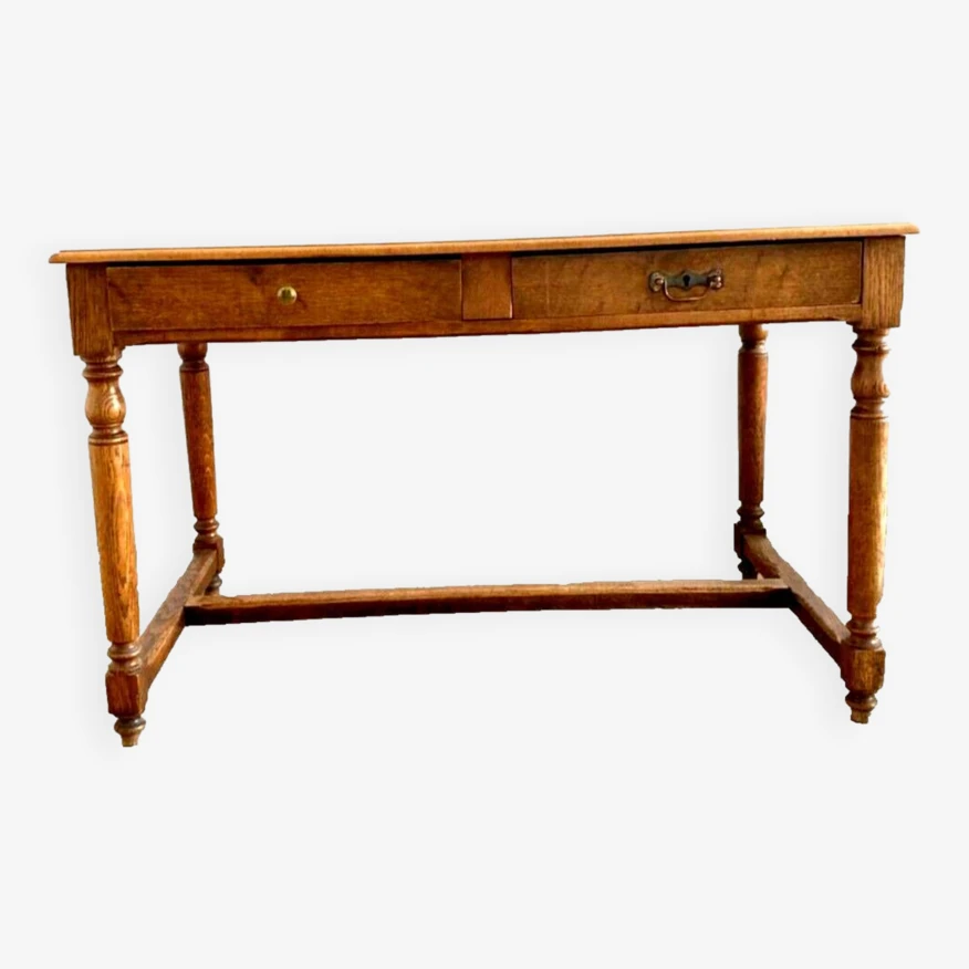 Louis XVI style desk in solid oak four turned legs with central spacer two drawers on the front oak top period 19th century.